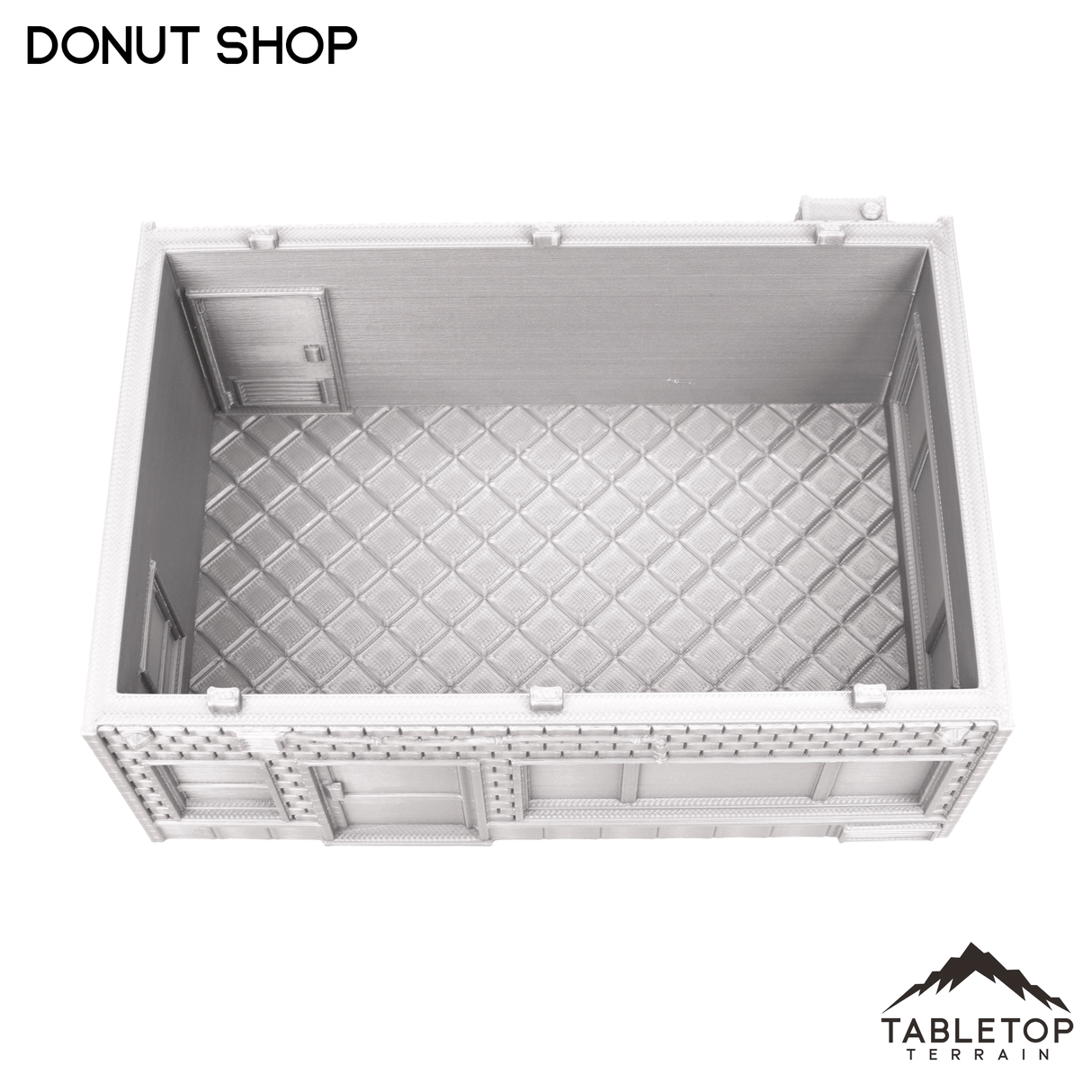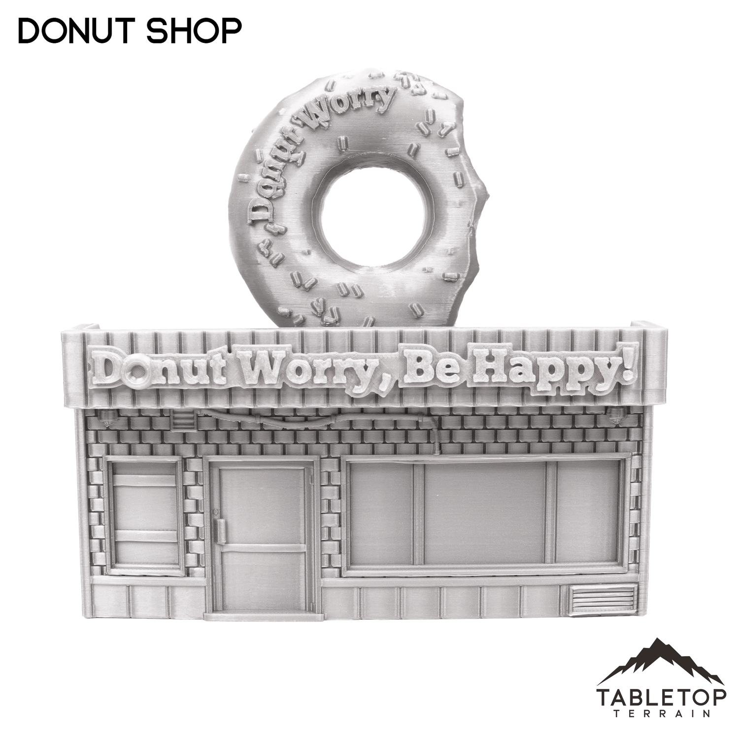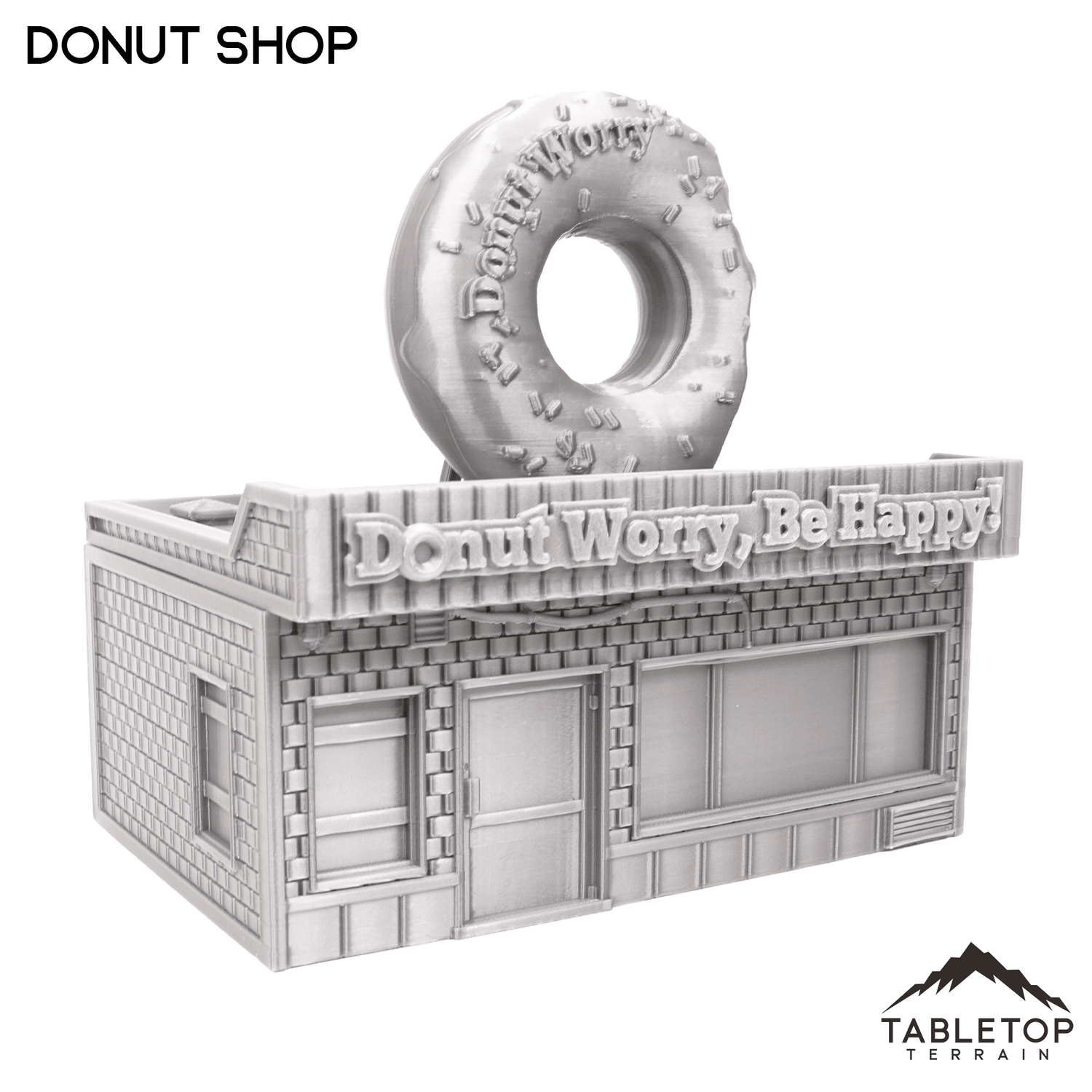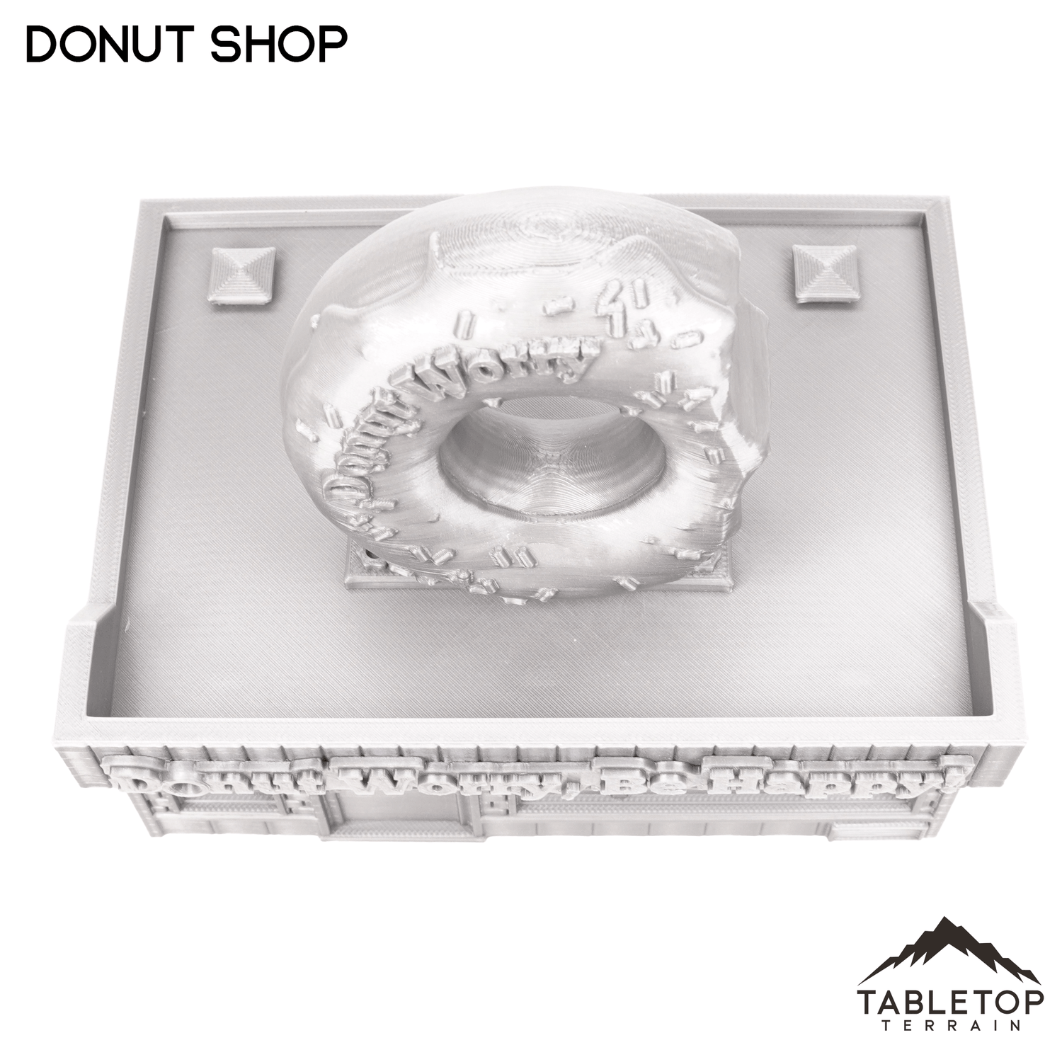 The Donut Shop is a single story building with a large donut sign included, either to be set on top of the building itself or placed nearby. The interior of the building is hollow for easy storage, and is designed to fit with other buildings from the urban collection. The Donut Shop is made for urban hero tabletop games but works with any genre.
