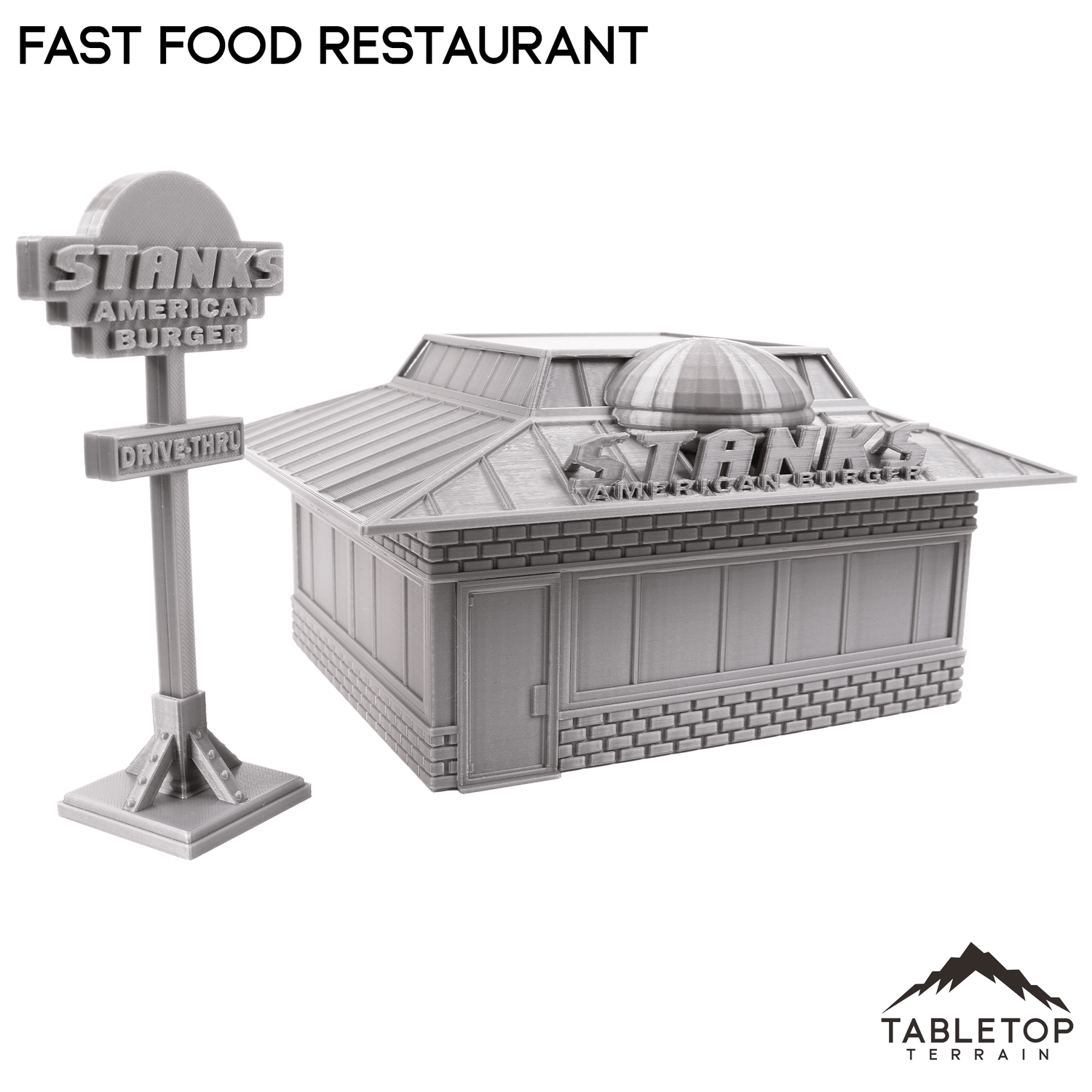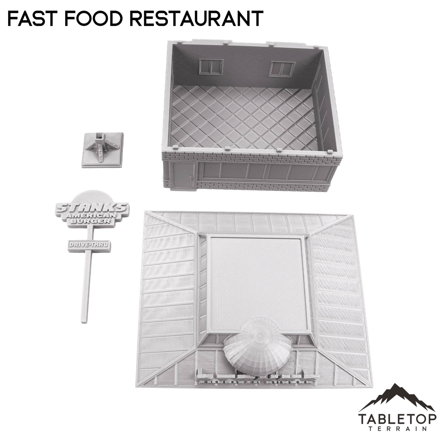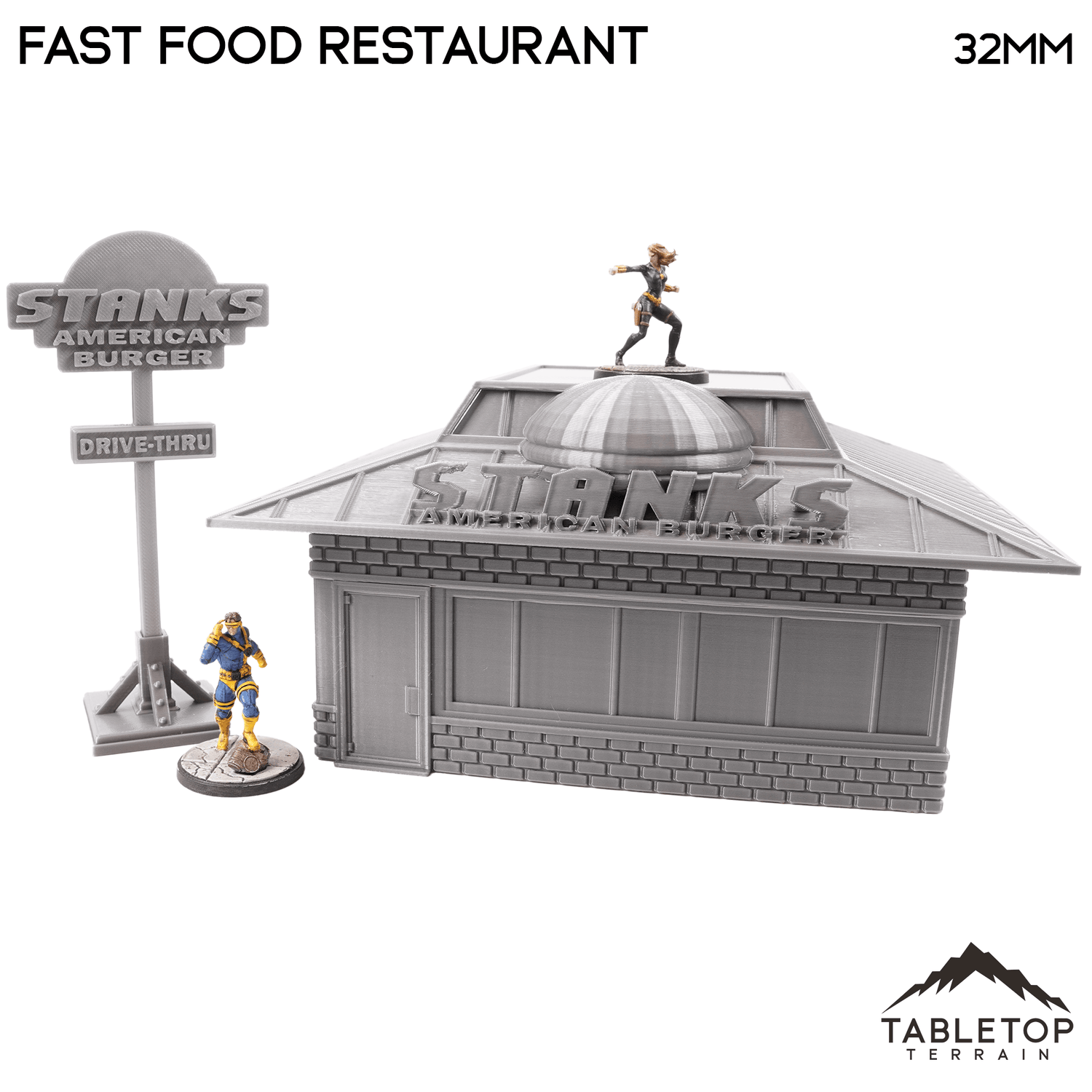 The Fast Food Restaurant comes in 2 different versions, 1 version with a floor and 1 version without. The set comes with a freestanding sign as well, to be placed near the building itself. The Fast Food Restaurant is part of our urban buildings collection, the set is designed for urban hero tabletop games but can work with any genre.
