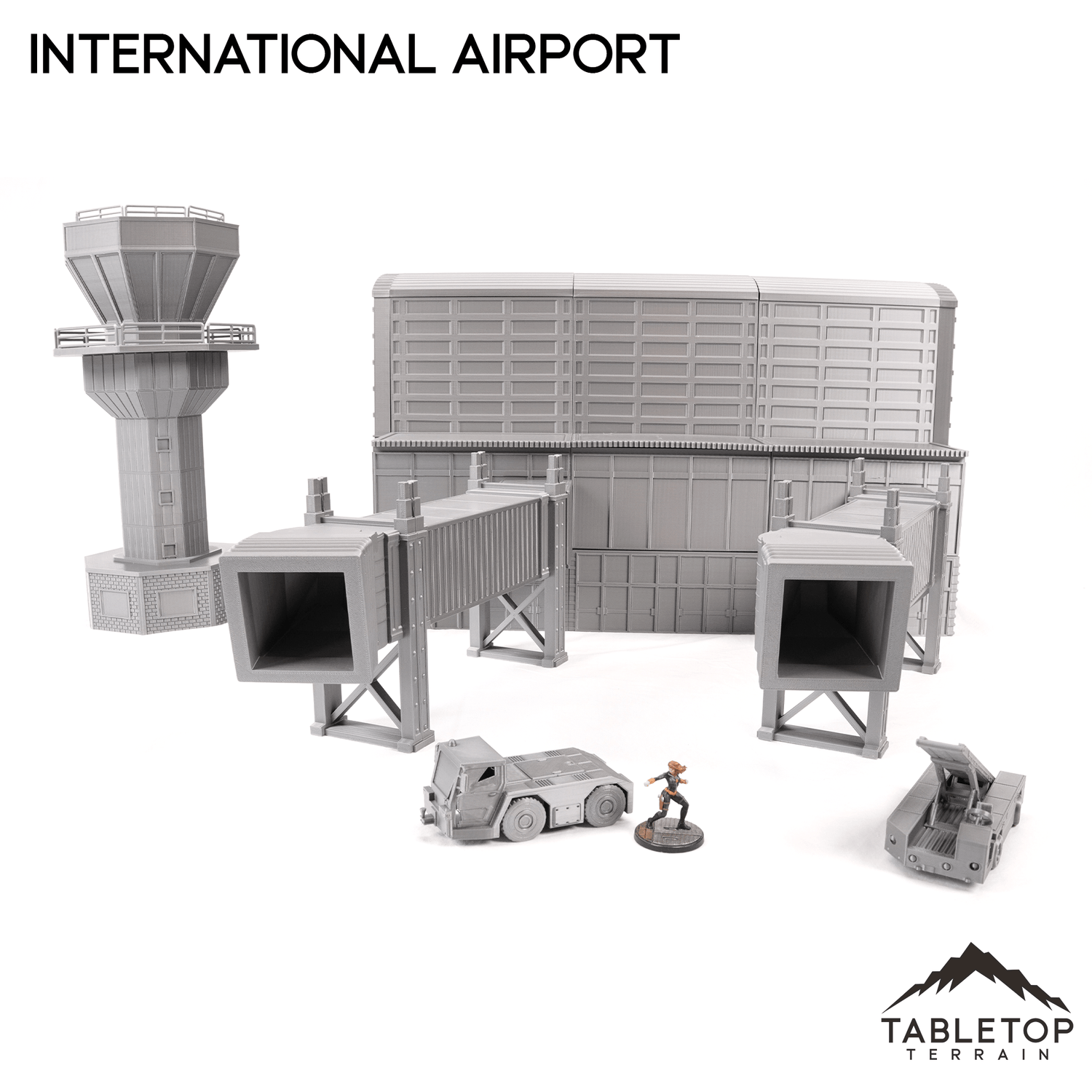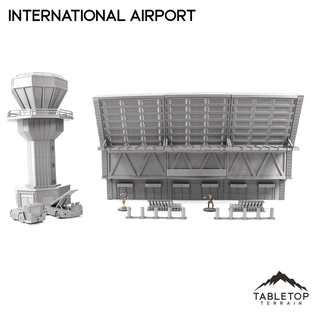 The International Airport is a sprawling set of a modern Airport. It features a three story terminal with two jet bridges and an air control tower. It also includes a scatter set, with luggage racks, bollards, and two airport vehicles. This set is massive and requires assembly with openlock clips (included in the set). The airport is designed for urban hero tabletop games, but can be used with any genre.