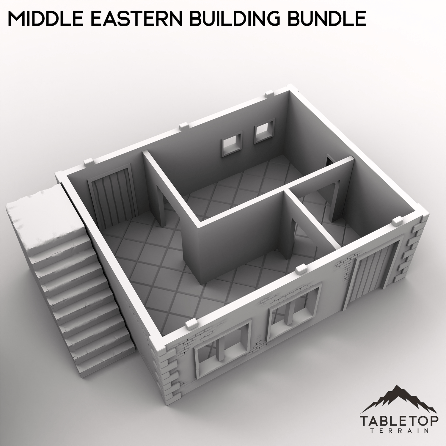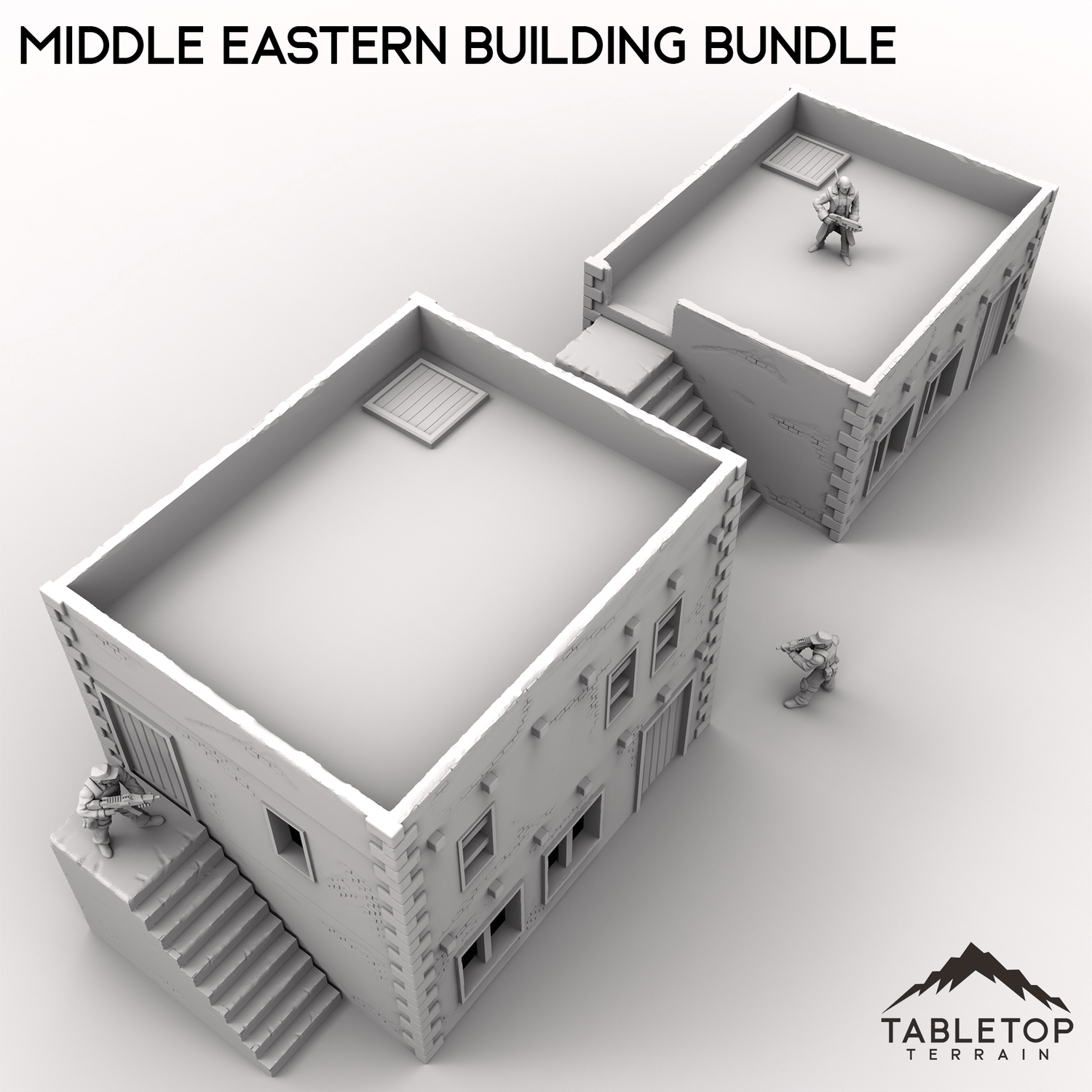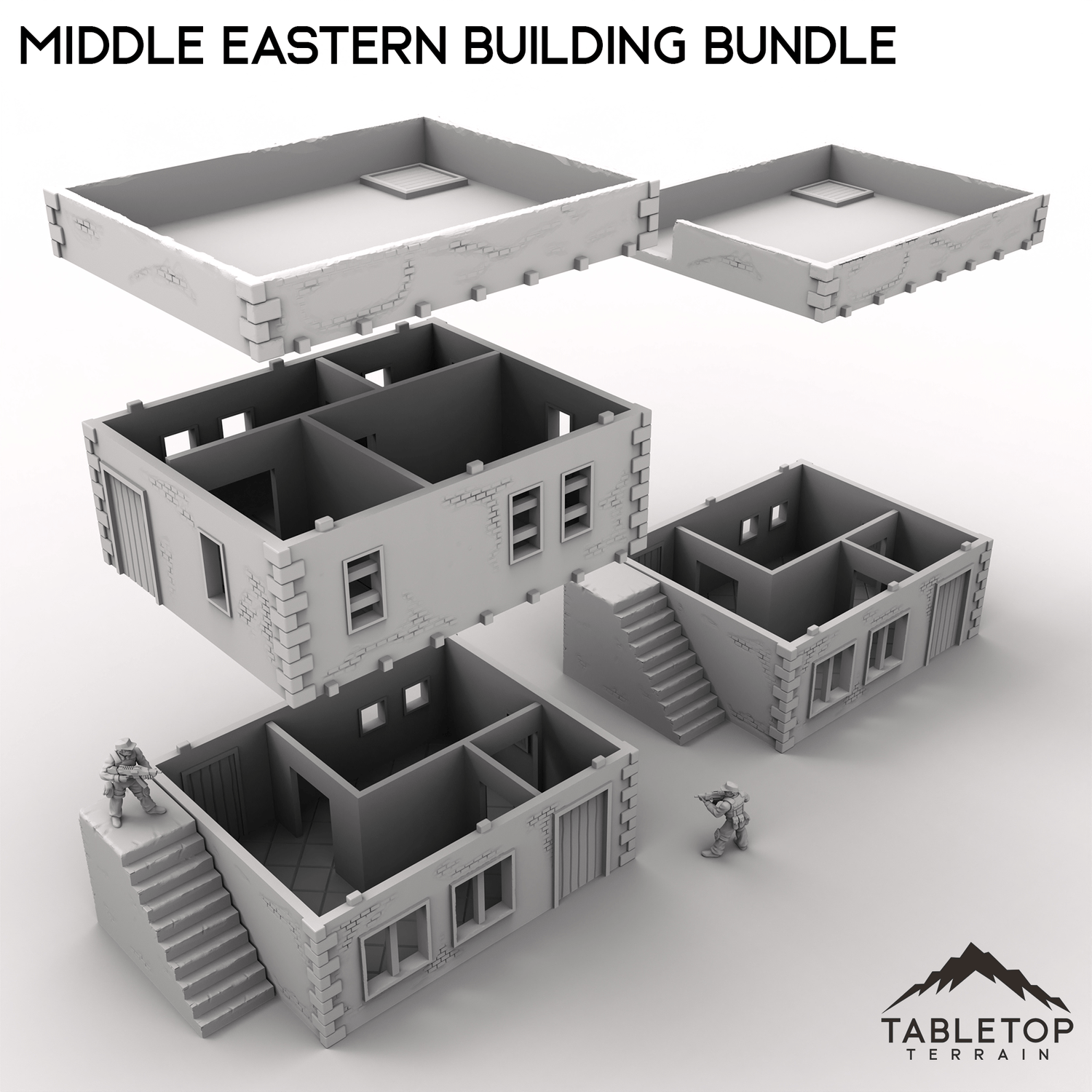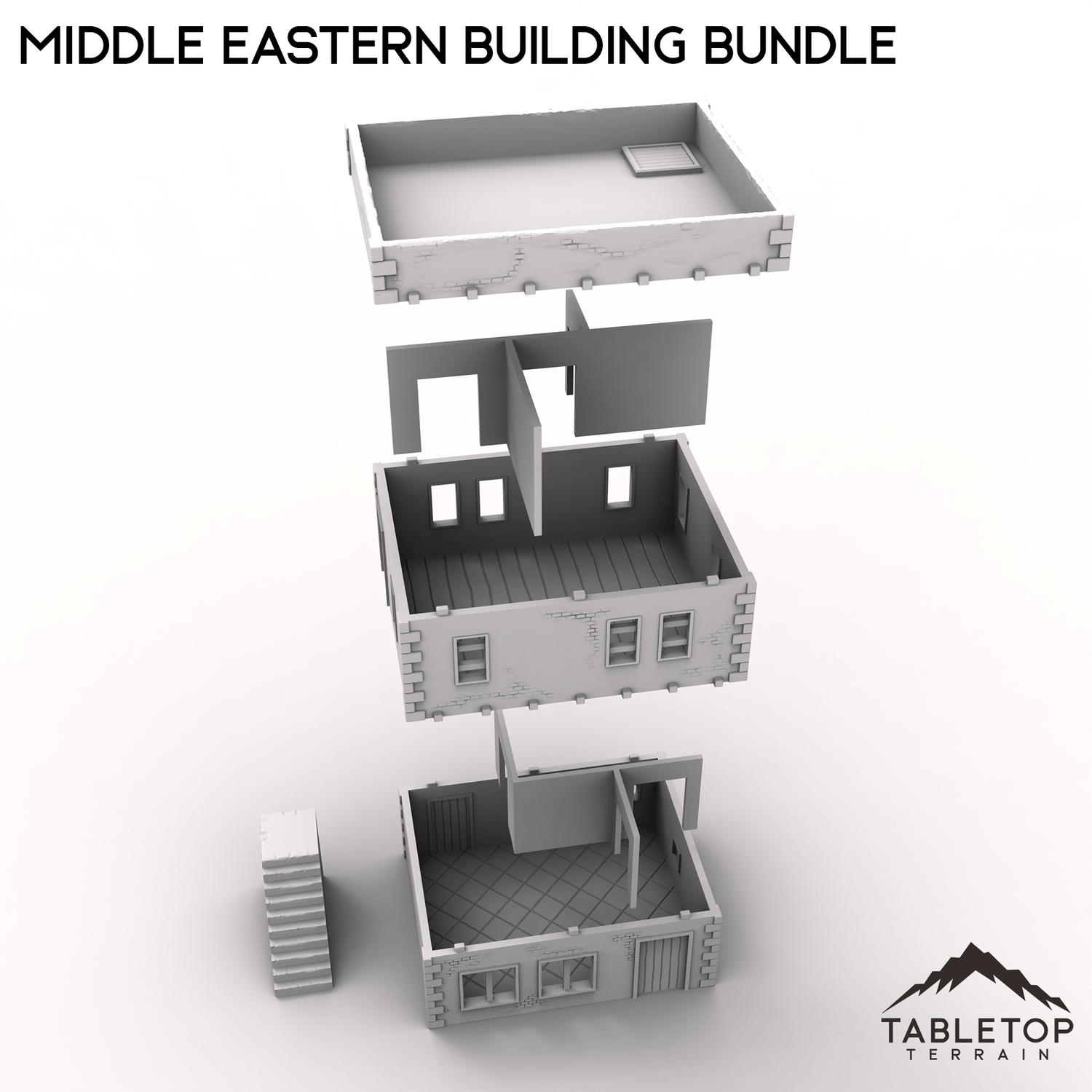 This bundle contains two buildings: one two-story stackable building and one smaller one-story. The roofs on both of them are removable for easy interior miniature placement. There is an optional external staircase that can be used to reach the second floor or the roof. There are also optional room inserts included that can be dropped in to divide the buildings into smaller rooms.