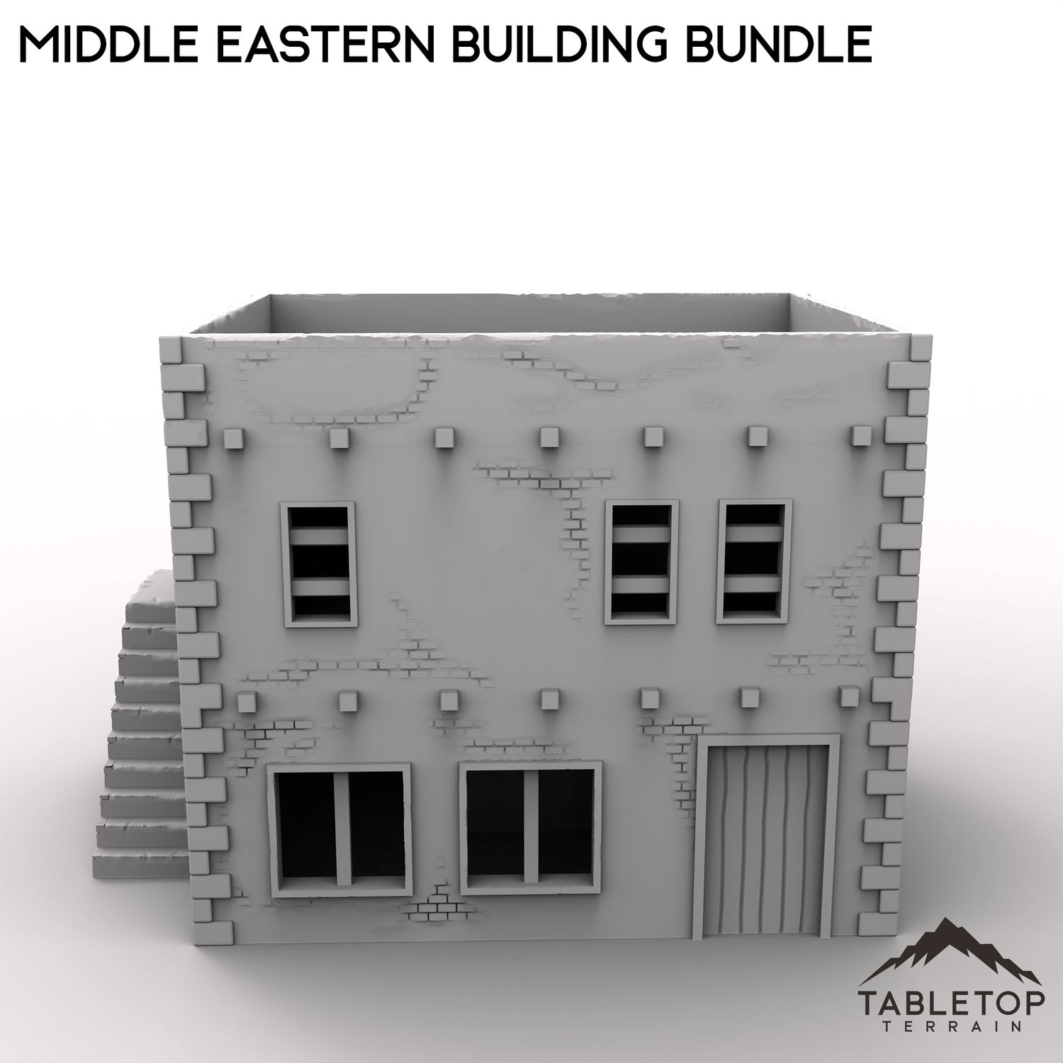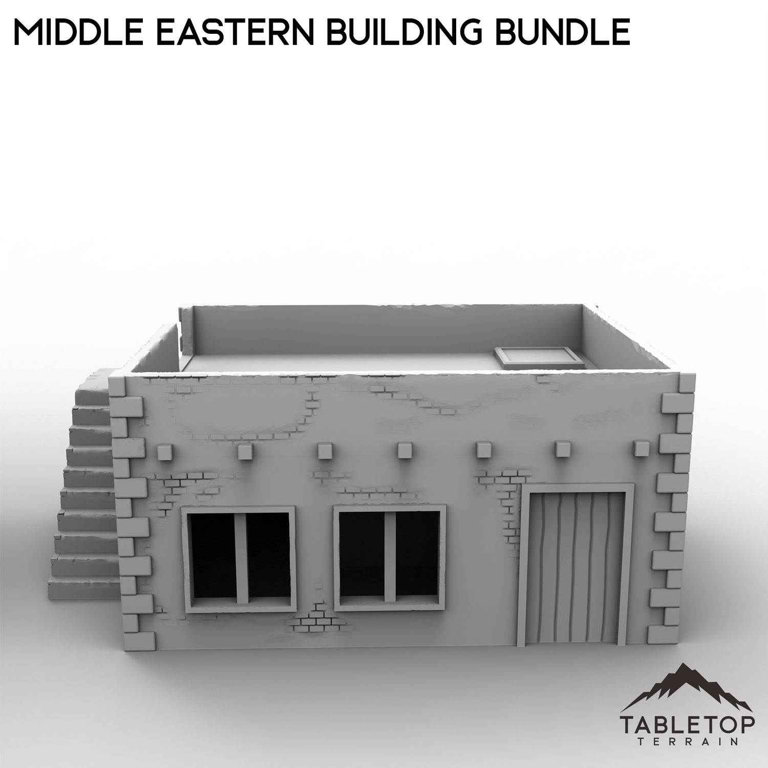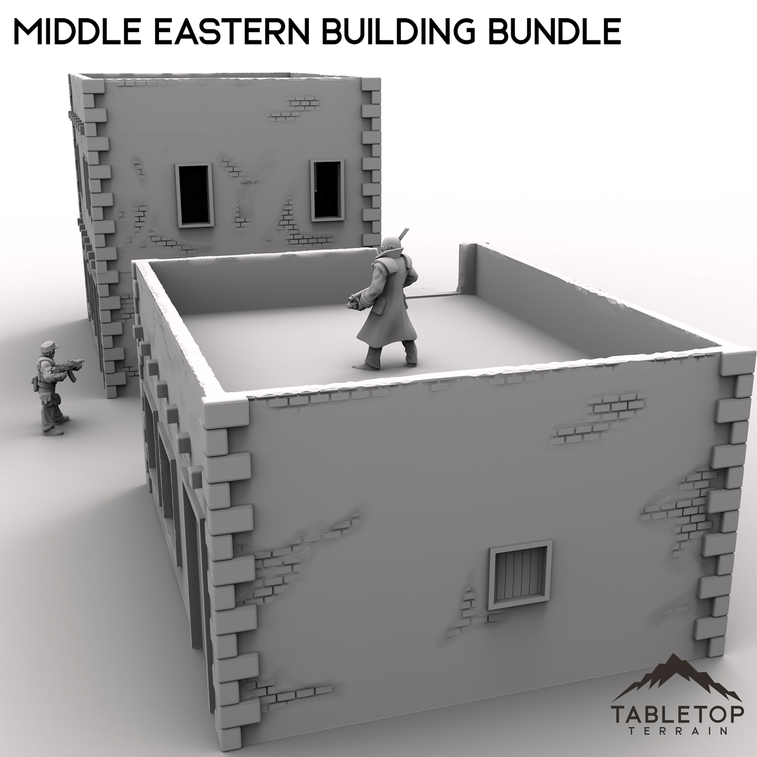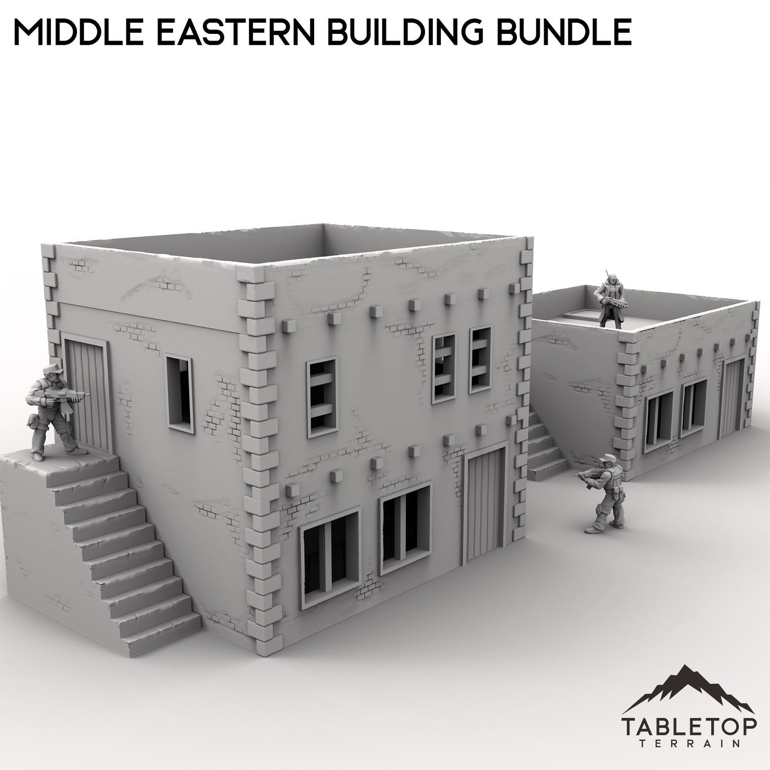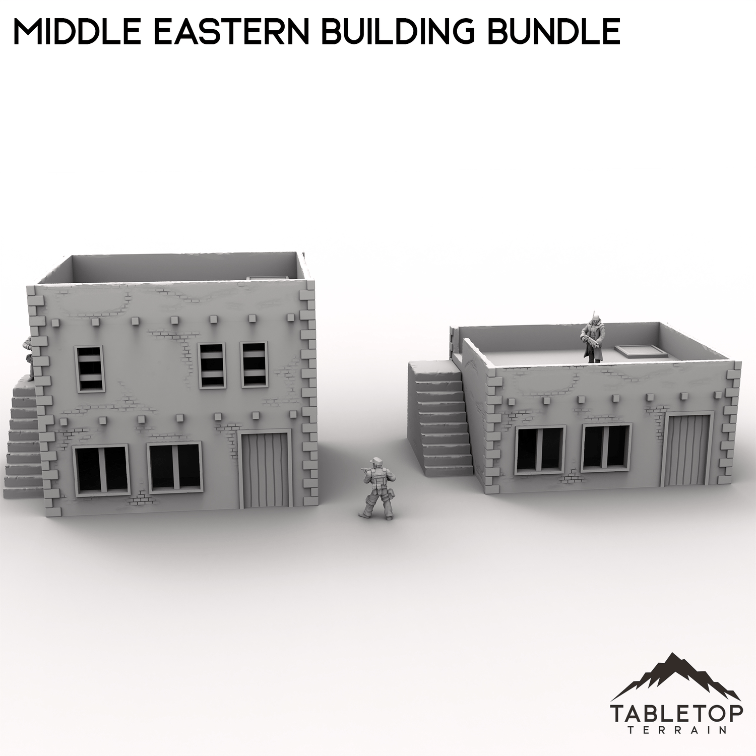 This bundle contains two buildings: one two-story stackable building and one smaller one-story. The roofs on both of them are removable for easy interior miniature placement. There is an optional external staircase that can be used to reach the second floor or the roof. There are also optional room inserts included that can be dropped in to divide the buildings into smaller rooms.