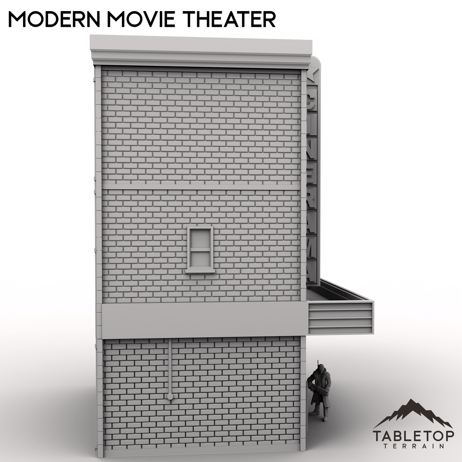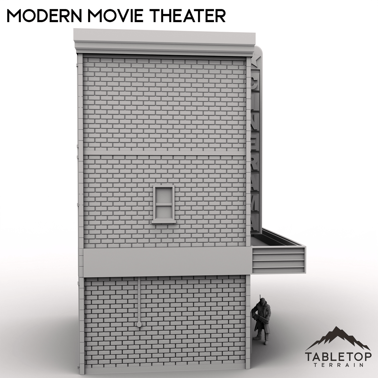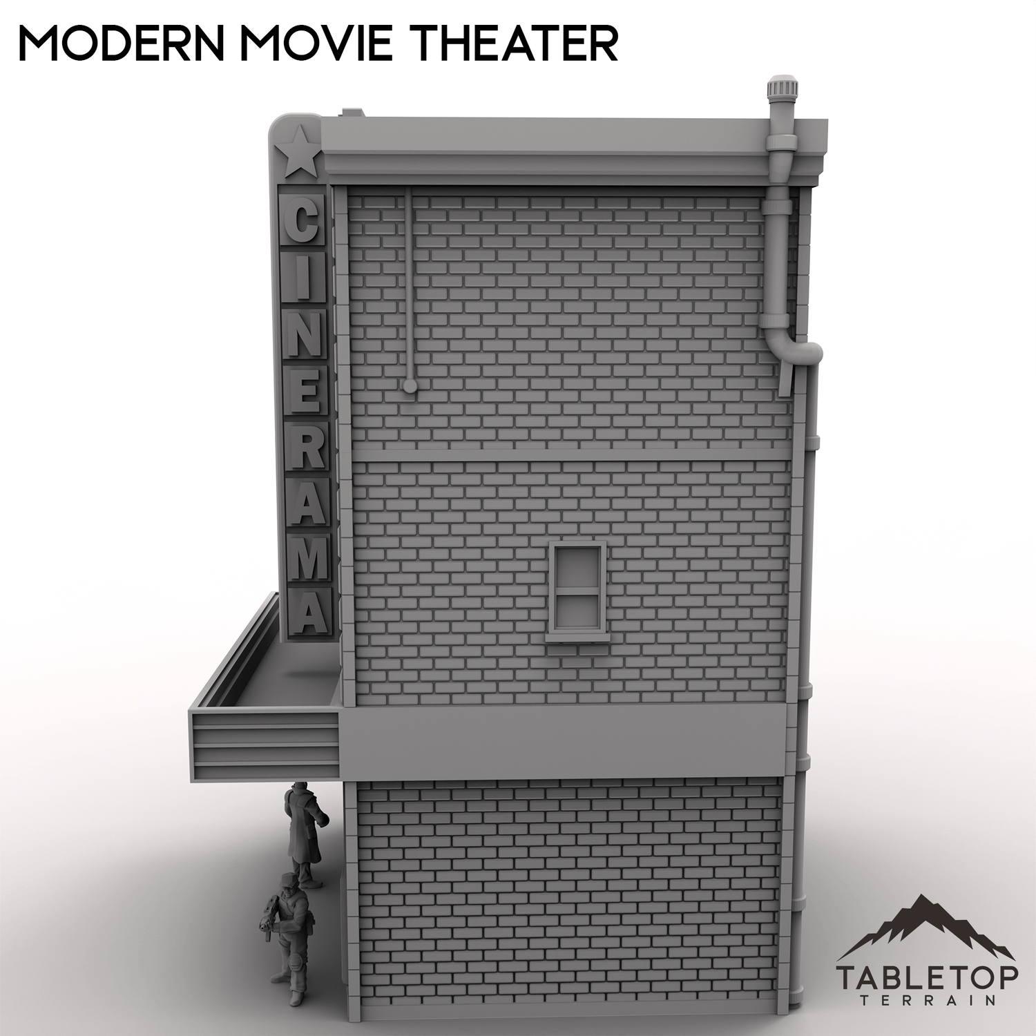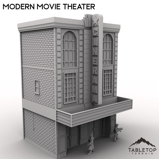 The Modern Movie Theater is a tall hollow building with a classic style marquee placed into the front of the theater. The theater is styled like other buildings from our urban terrain collection, and matches those buildings nicely. The Modern Movie Theater is designed for urban hero tabletop games, but can work with any genre.