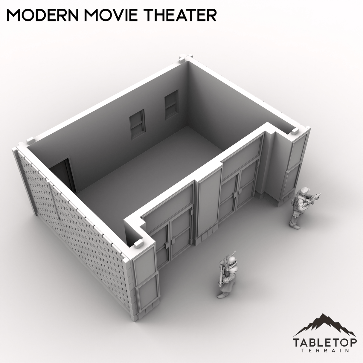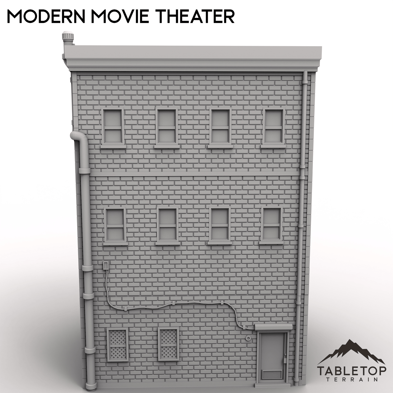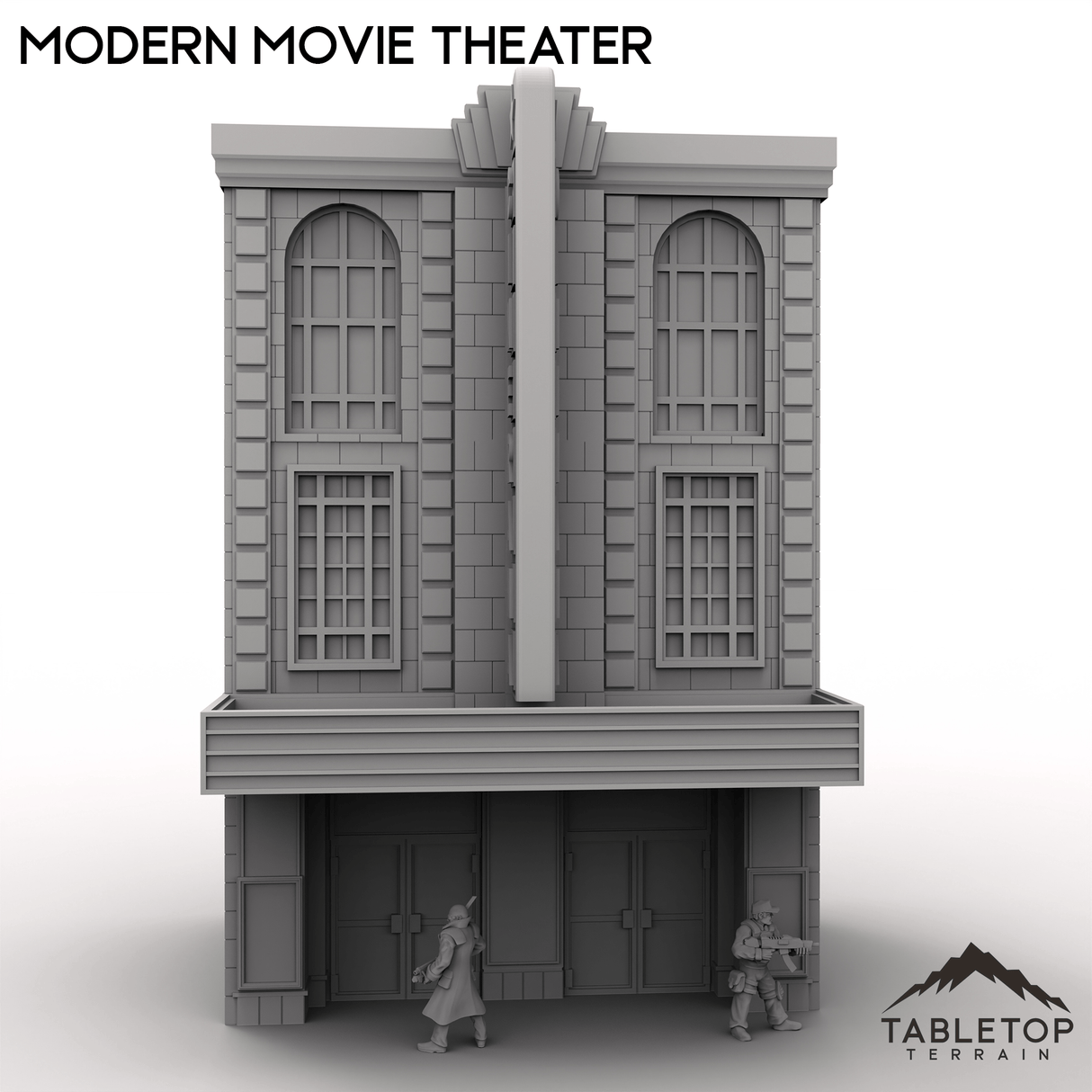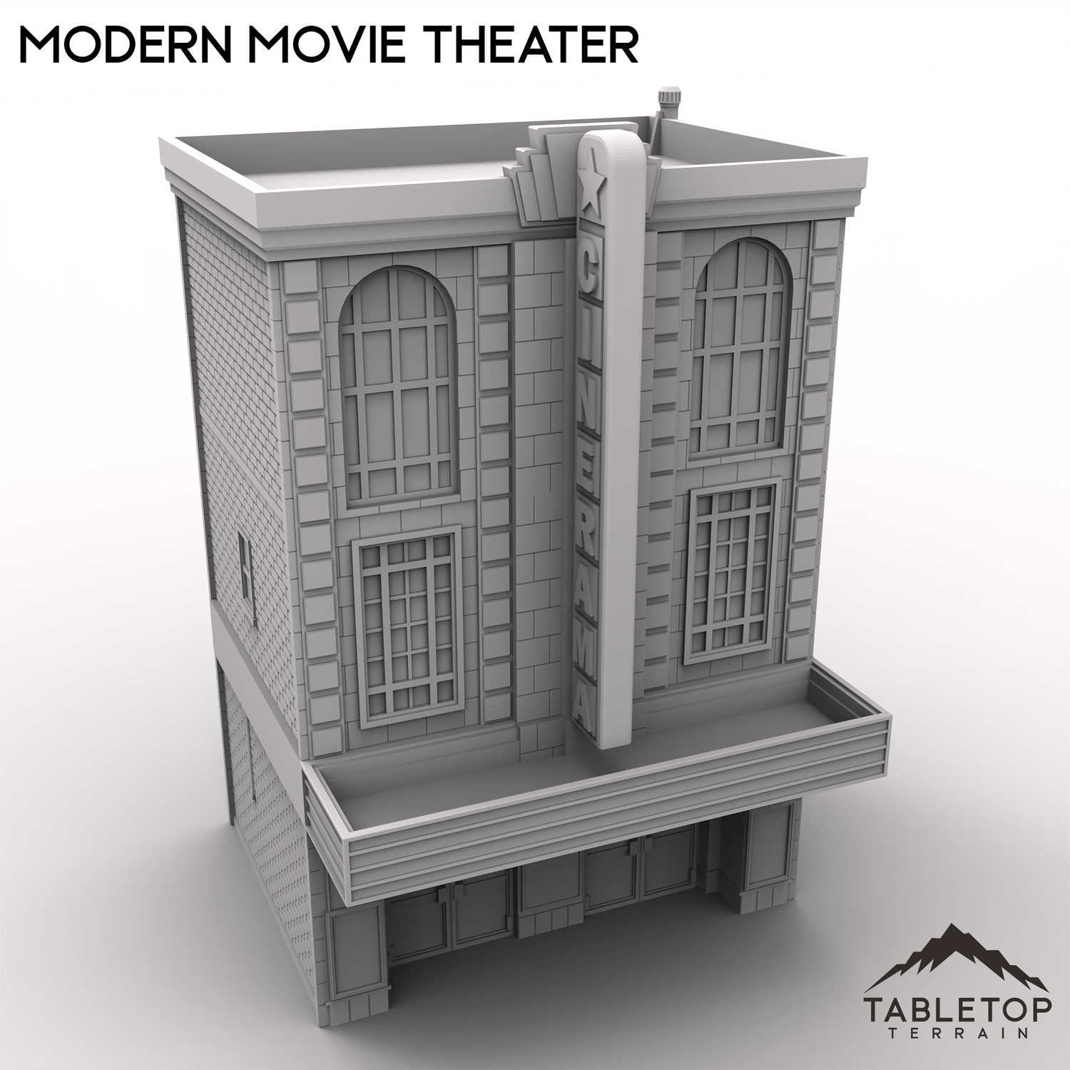 The Modern Movie Theater is a tall hollow building with a classic style marquee placed into the front of the theater. The theater is styled like other buildings from our urban terrain collection, and matches those buildings nicely. The Modern Movie Theater is designed for urban hero tabletop games, but can work with any genre.