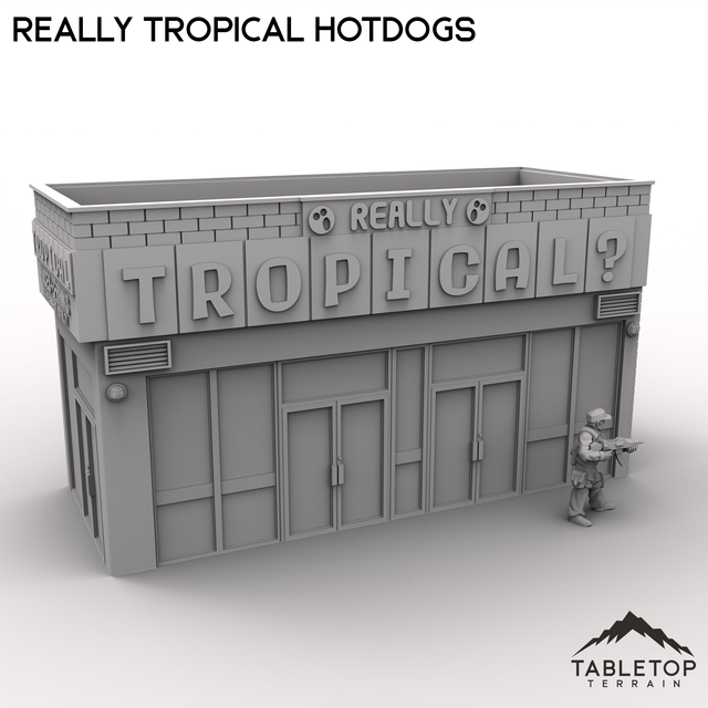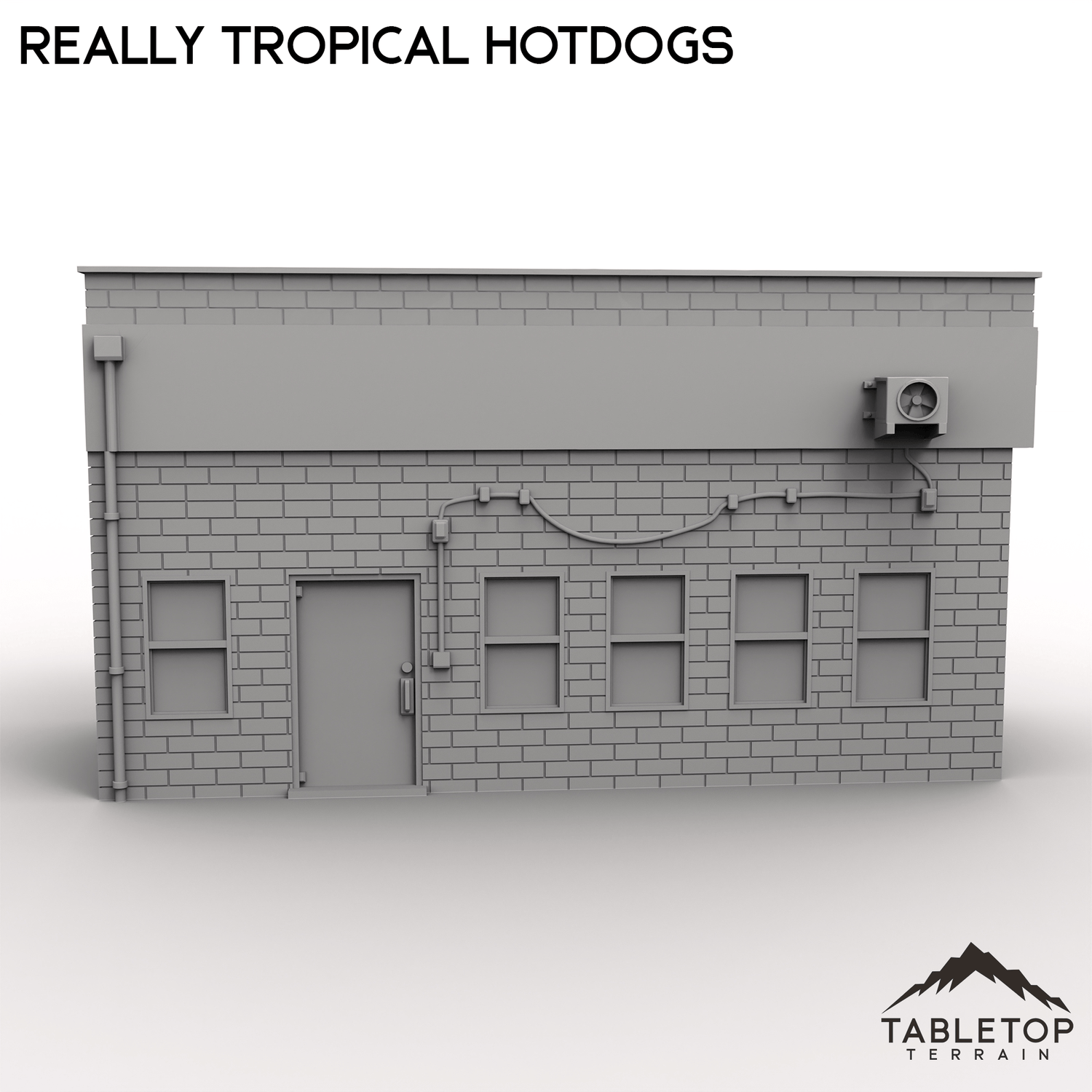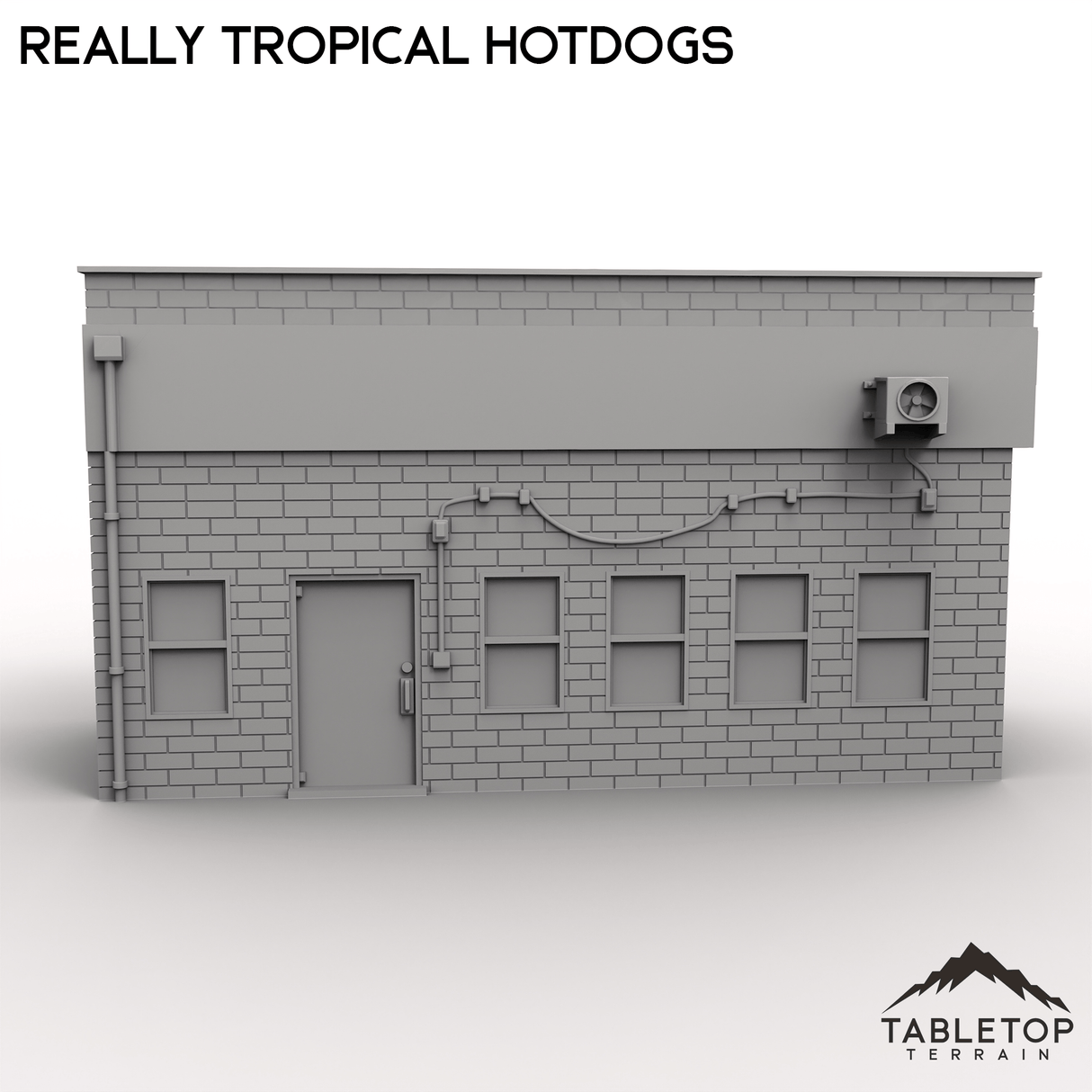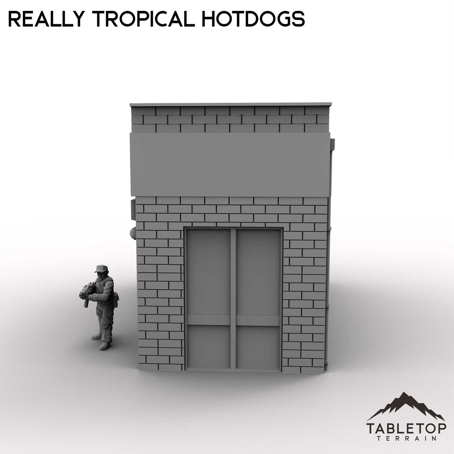 The Really Tropical Hotdog stand is a street vendor restaurant with removable roof. The building is meant to work as a stand alone structure, or side by side with other sets from the urban collection to make a large city block. The Really Tropical Hotdogs set is designed for urban hero tabletop games, but can work with any genre.