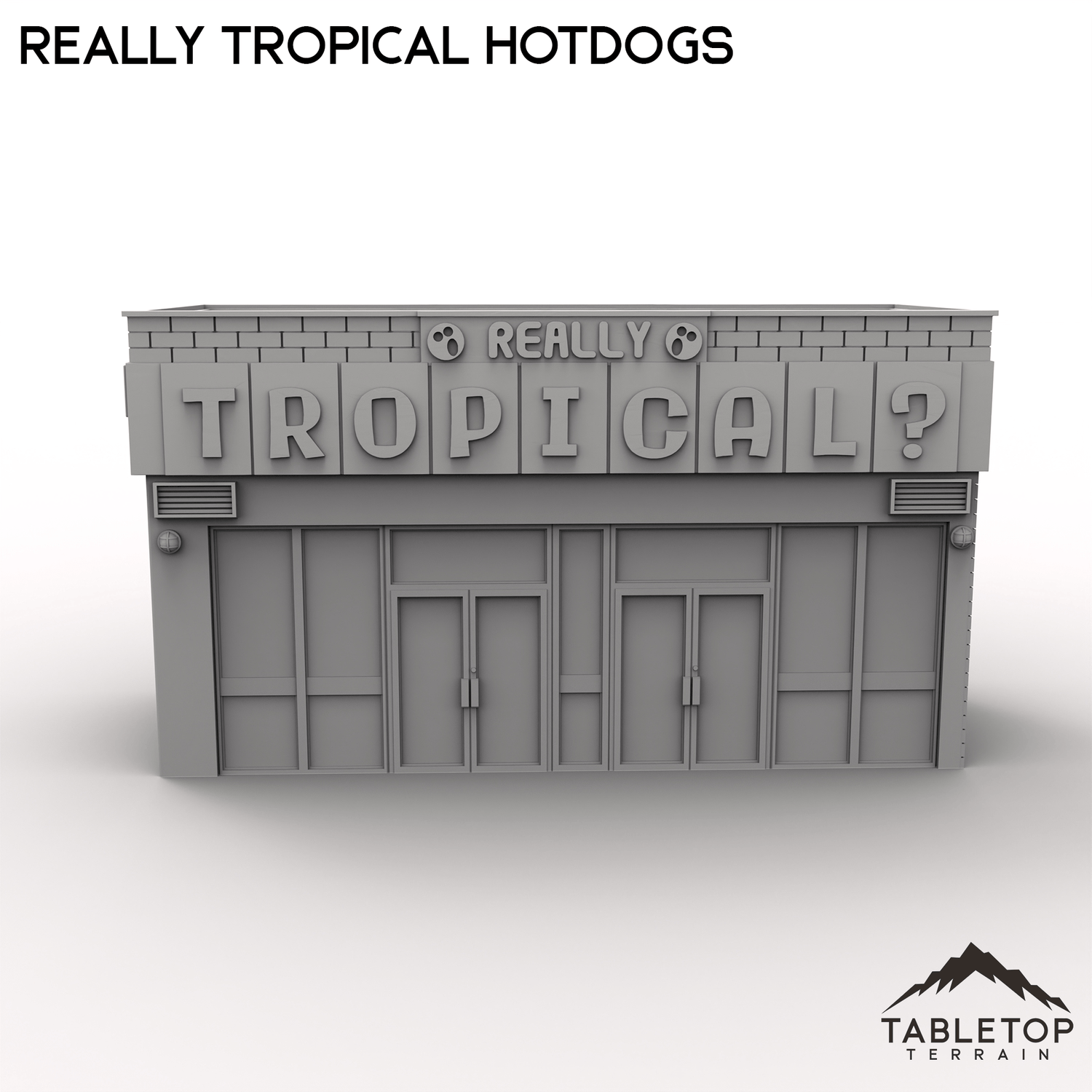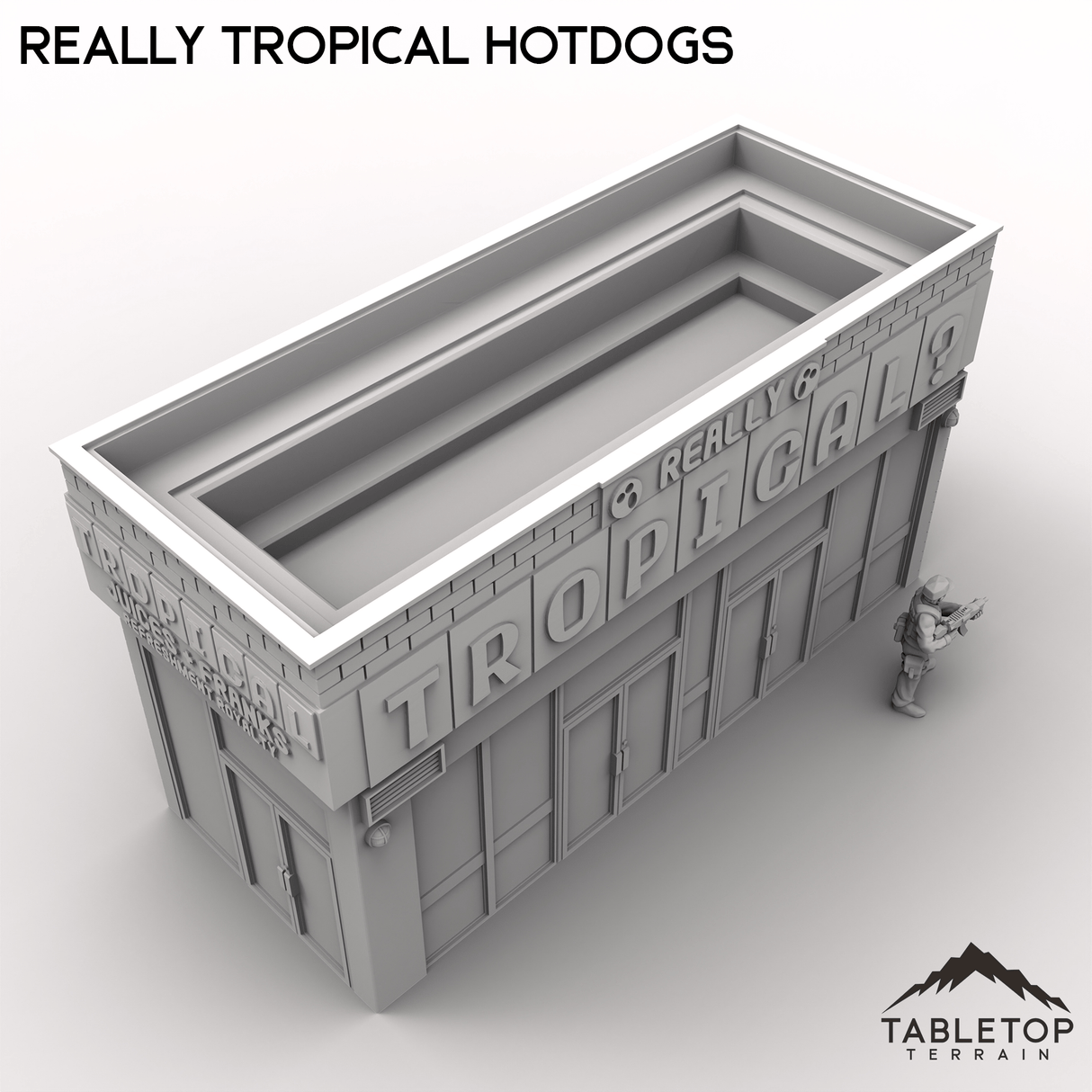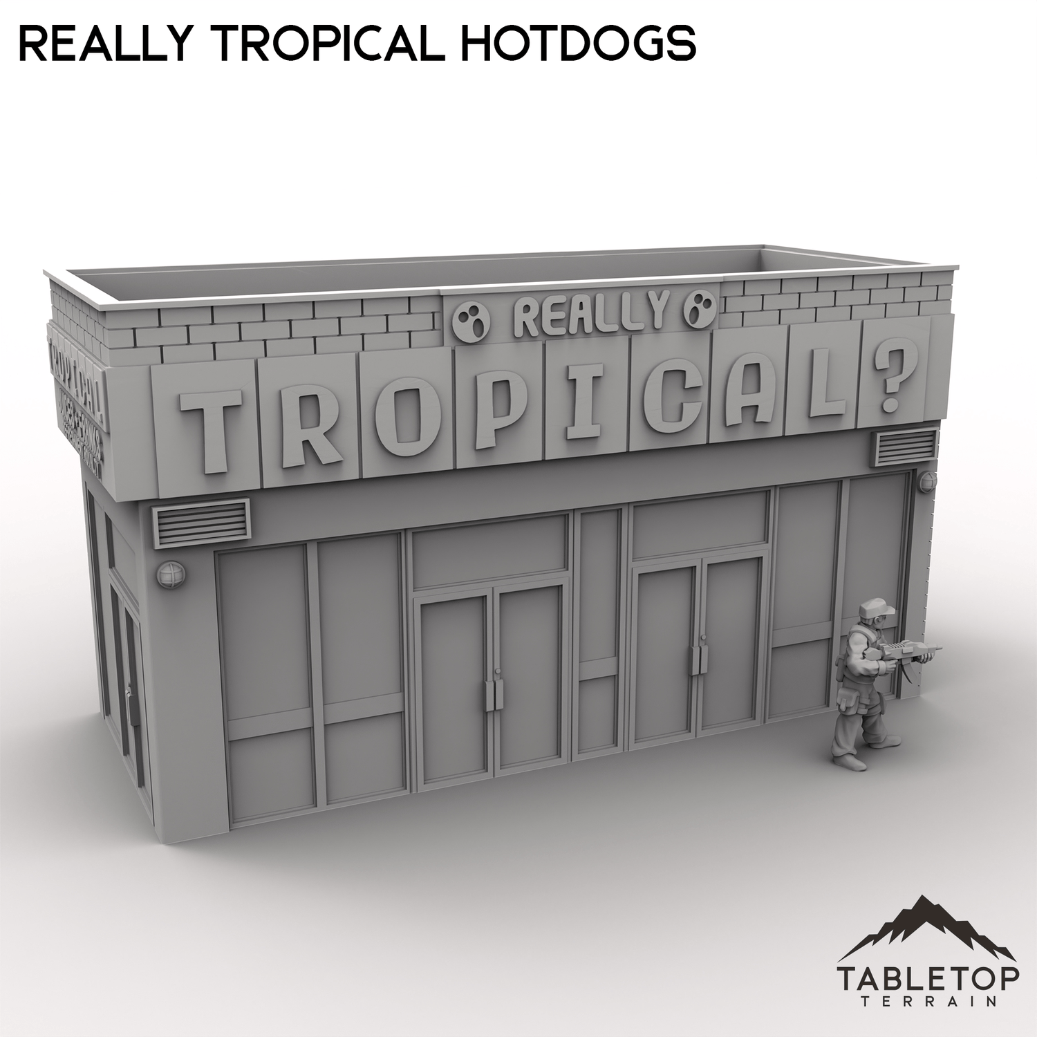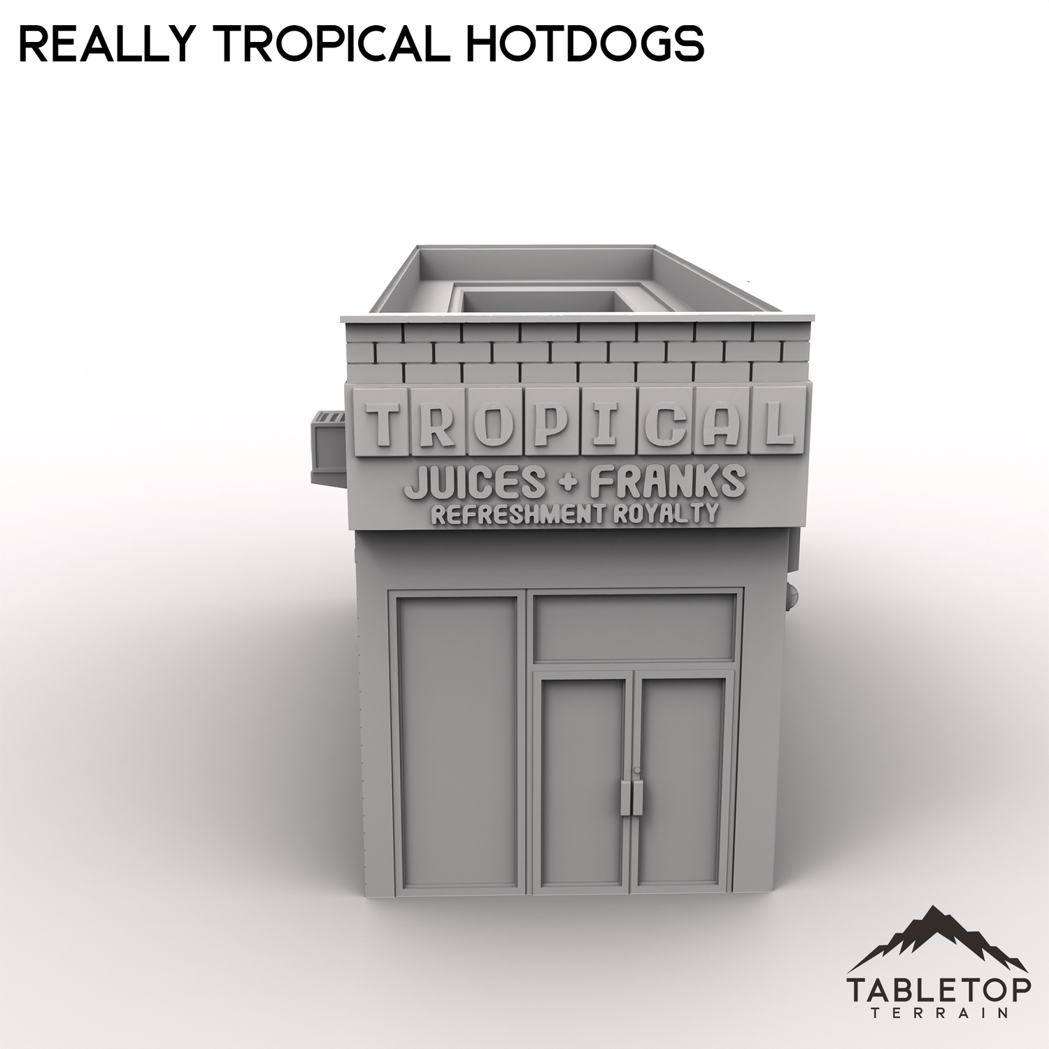 The Really Tropical Hotdog stand is a street vendor restaurant with removable roof. The building is meant to work as a stand alone structure, or side by side with other sets from the urban collection to make a large city block. The Really Tropical Hotdogs set is designed for urban hero tabletop games, but can work with any genre.