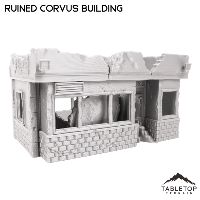 The Ruined Corvus Building is a set from our urban collection, styled to look like a ruined shopfront. The building itself has a removable roof and a hollow interior for easy storage. The Ruined Corvus Building is designed for urban hero tabletop games, but can work with any genre.