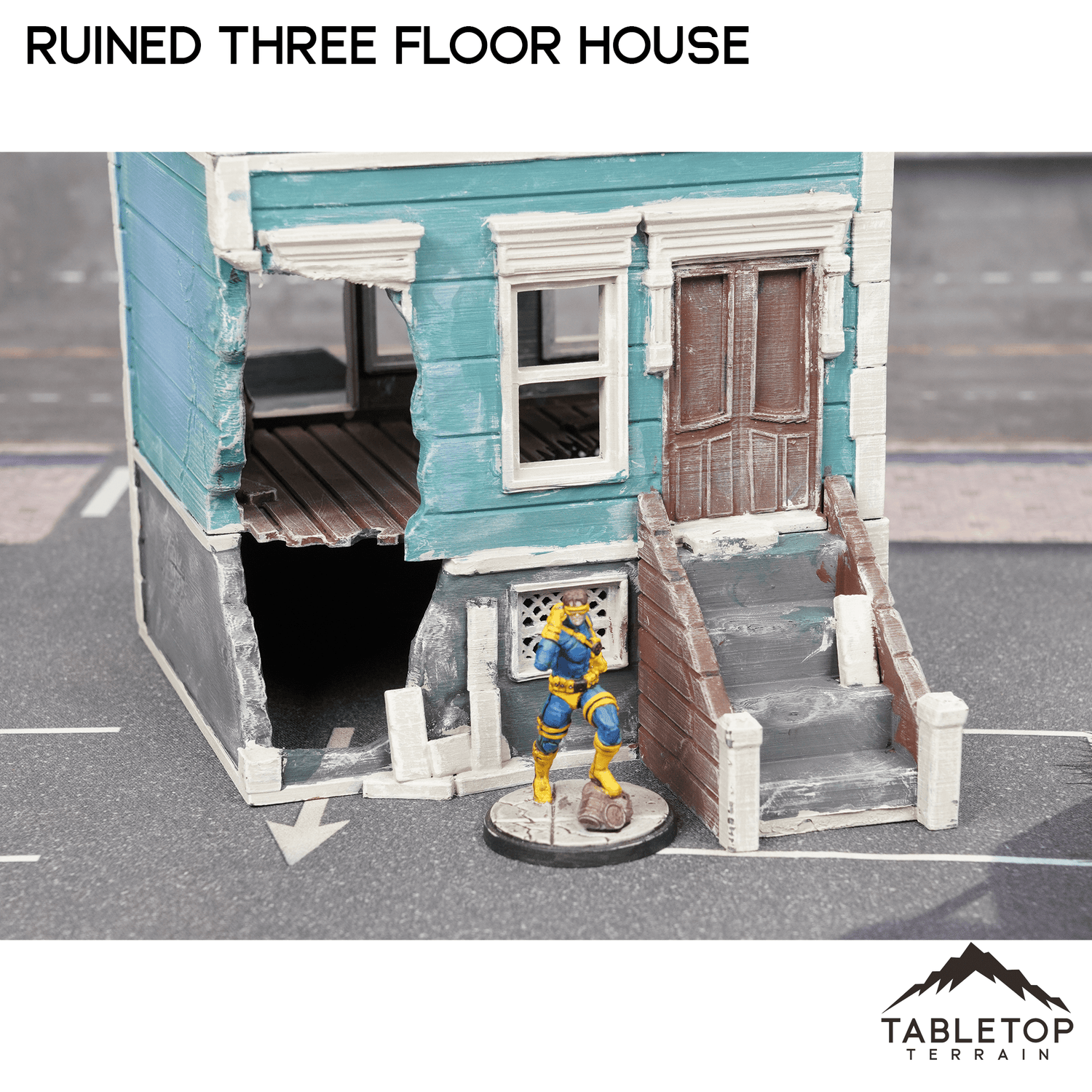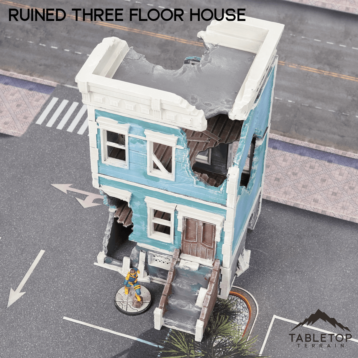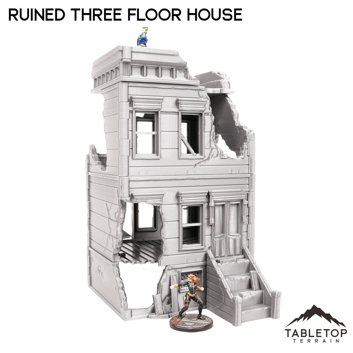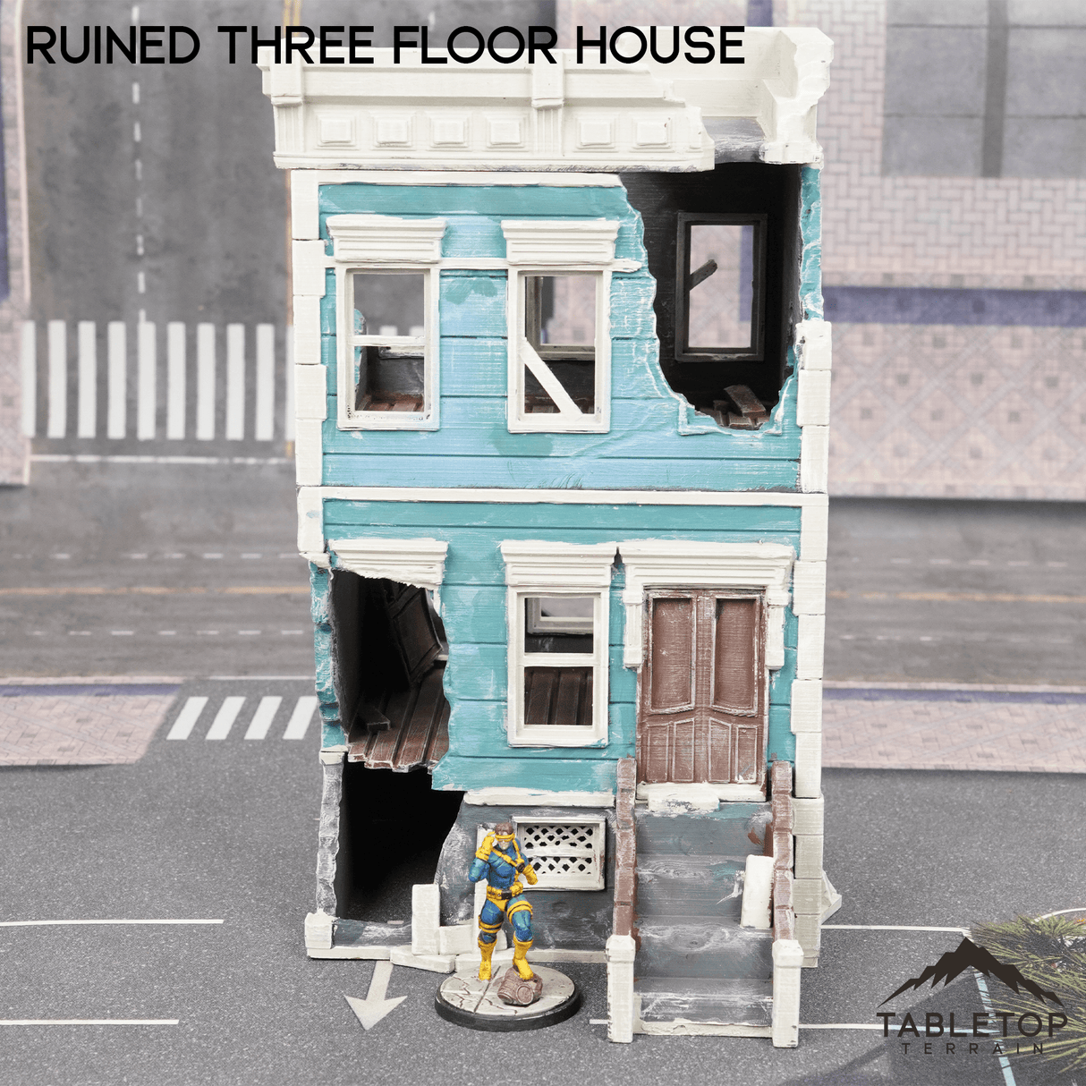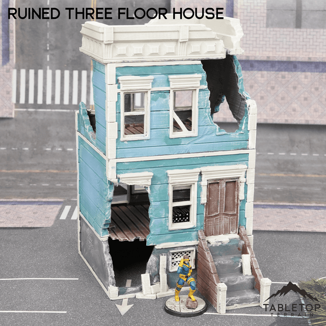 The Ruined Three Floor House is a fantastic addition for your Urban themed tabletop. It would work great for Marvel Crisis Protocol or other Modern games. The Ruined Three Floor House would fit perfectly for a city that has been demolished by a villain, or a post-apocalyptic.