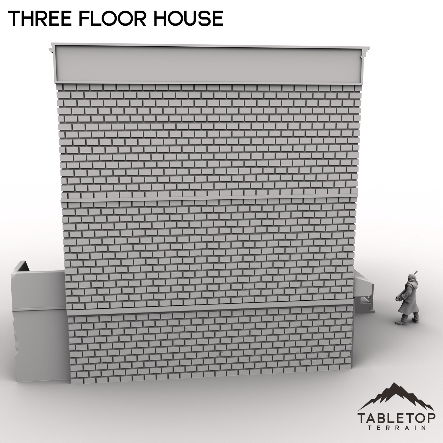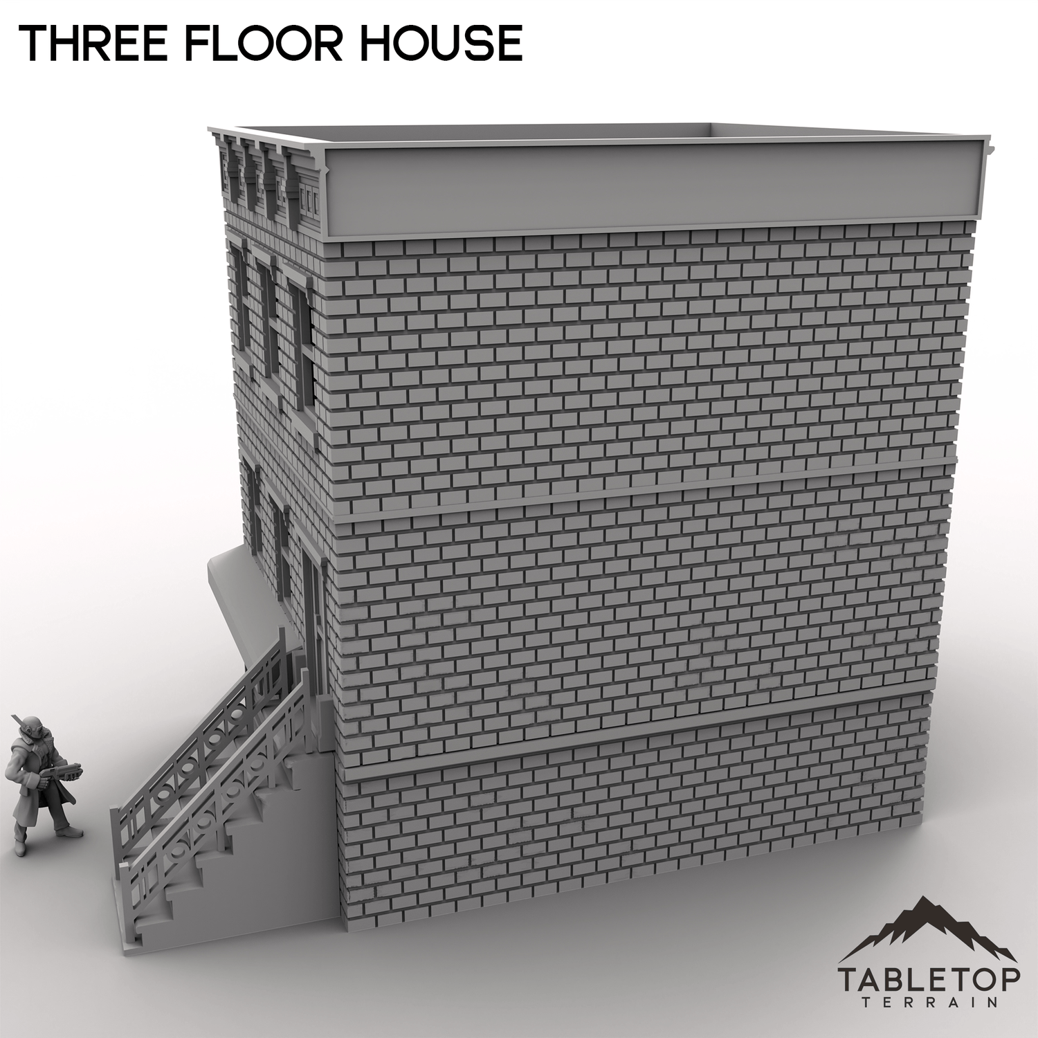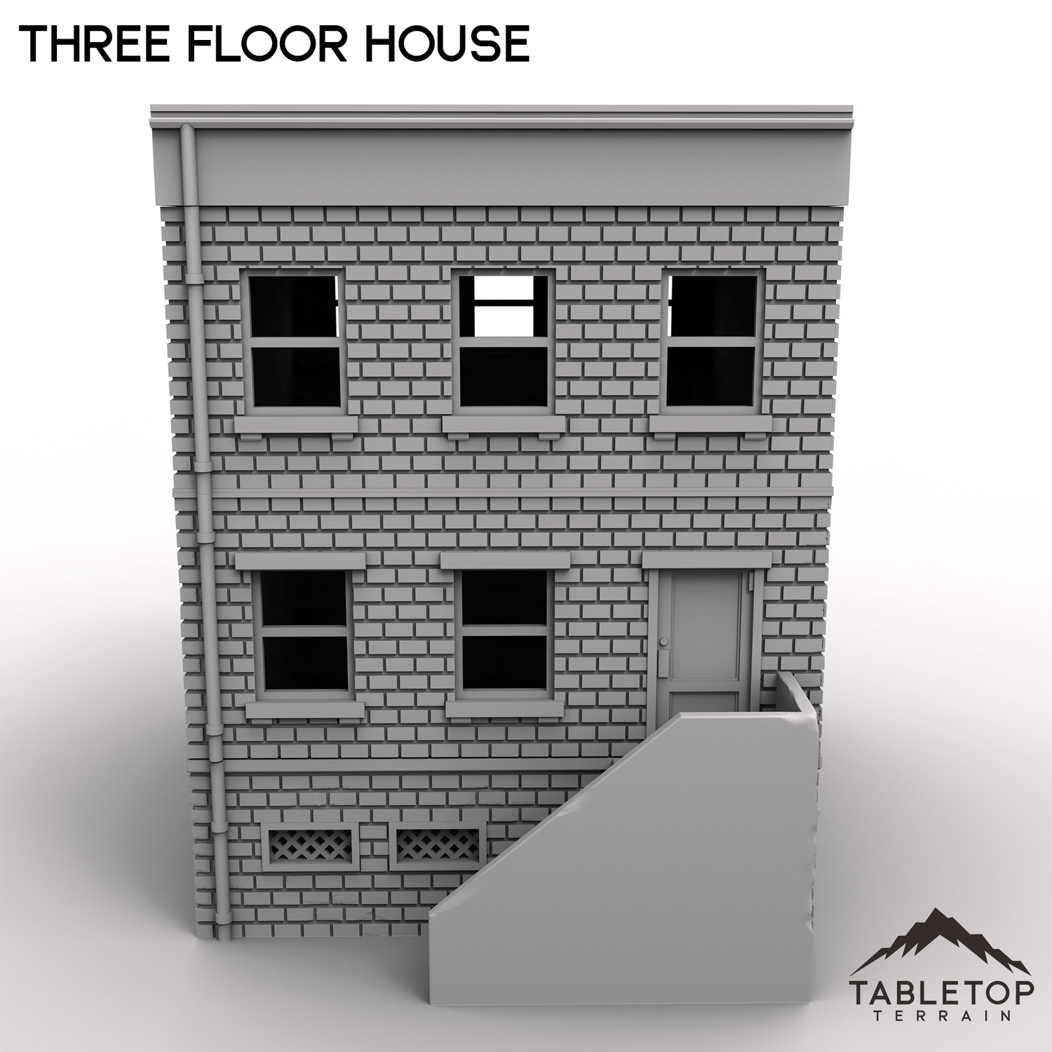 This Three Floor House is a compact structure featuring a large front multi-story brick townhouse with a flat roof and tall rectangular windows. The street-side features a small stairway leading to a recessed entrance, framed by elegant molding details. The building's symmetrical design is perfect for an urban setting.