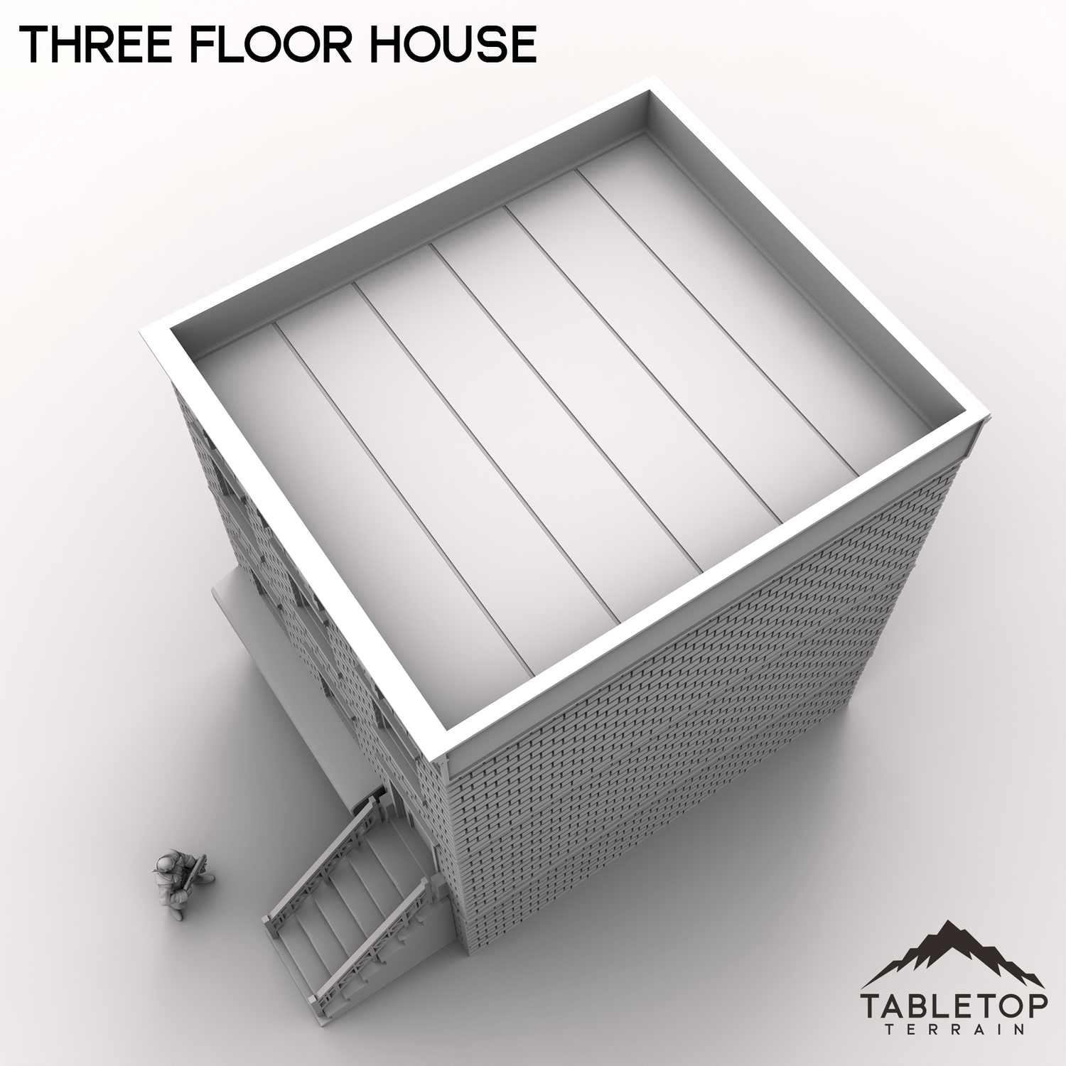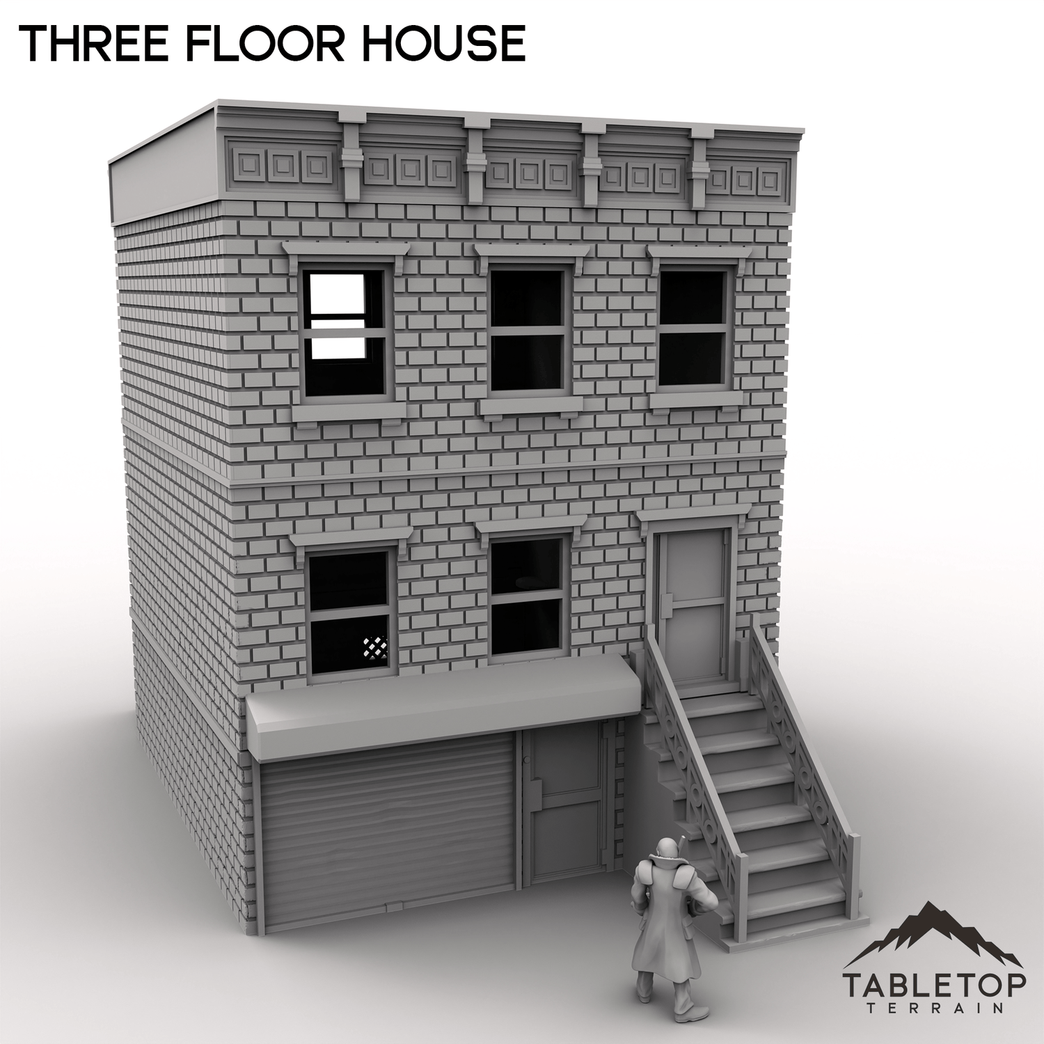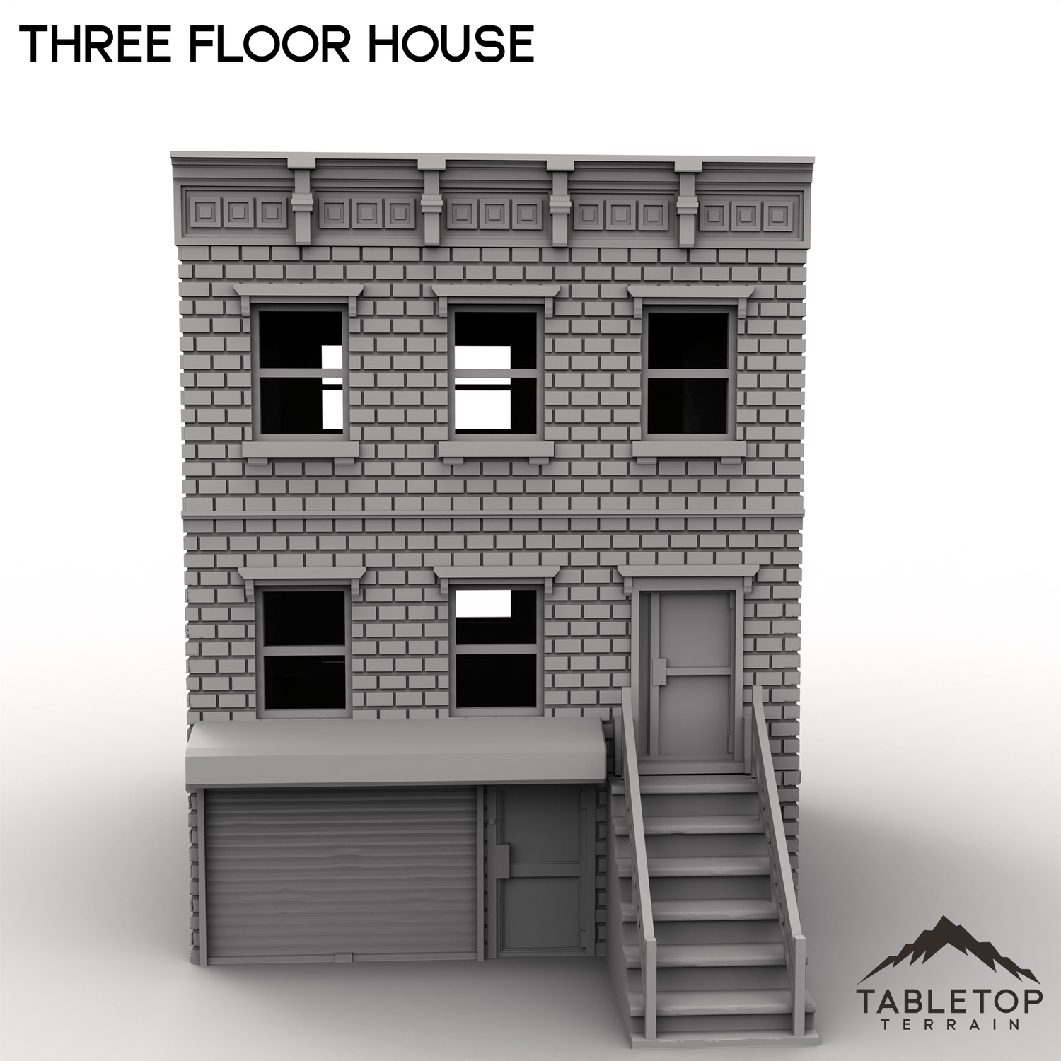 This Three Floor House is a compact structure featuring a large front multi-story brick townhouse with a flat roof and tall rectangular windows. The street-side features a small stairway leading to a recessed entrance, framed by elegant molding details. The building's symmetrical design is perfect for an urban setting.