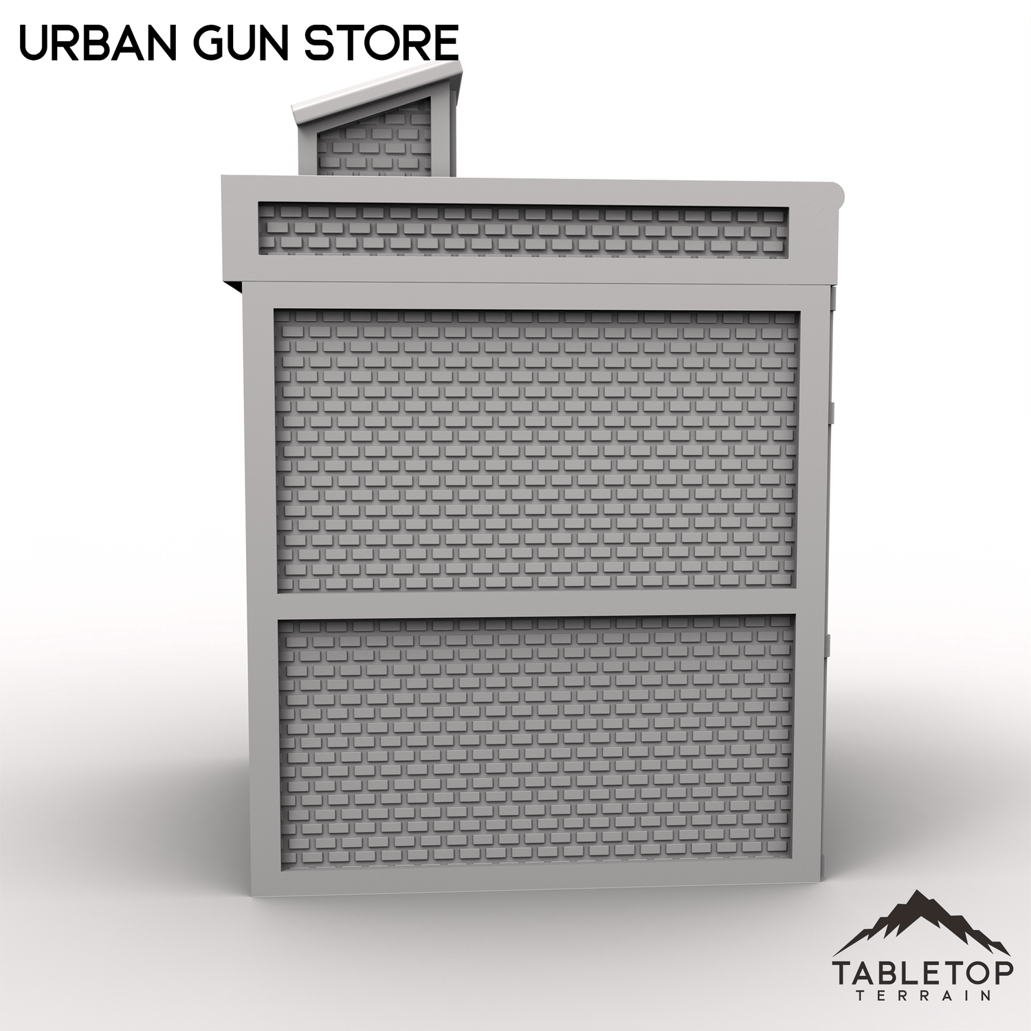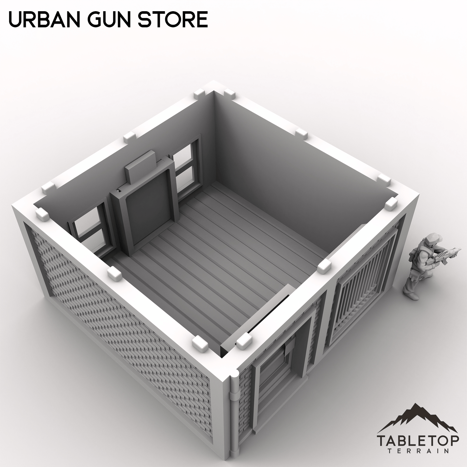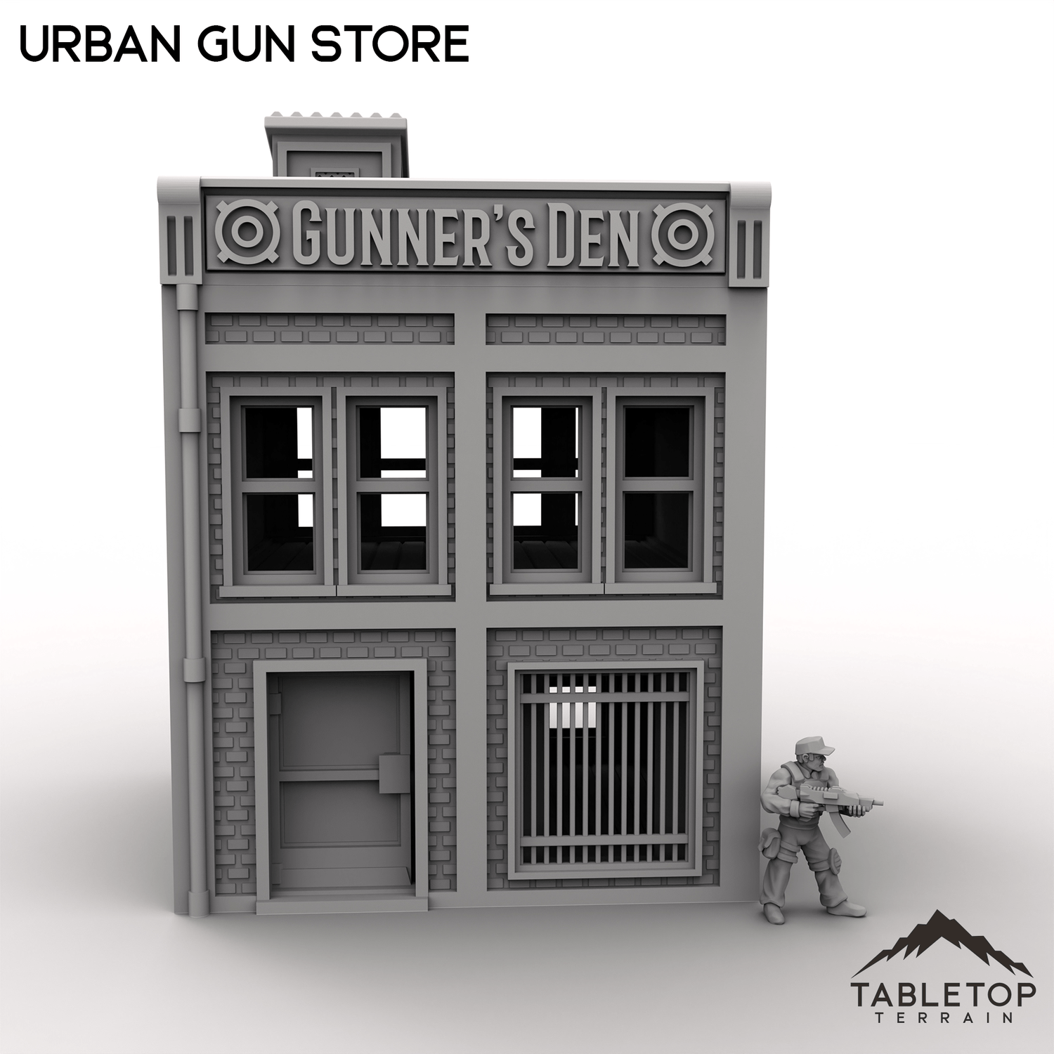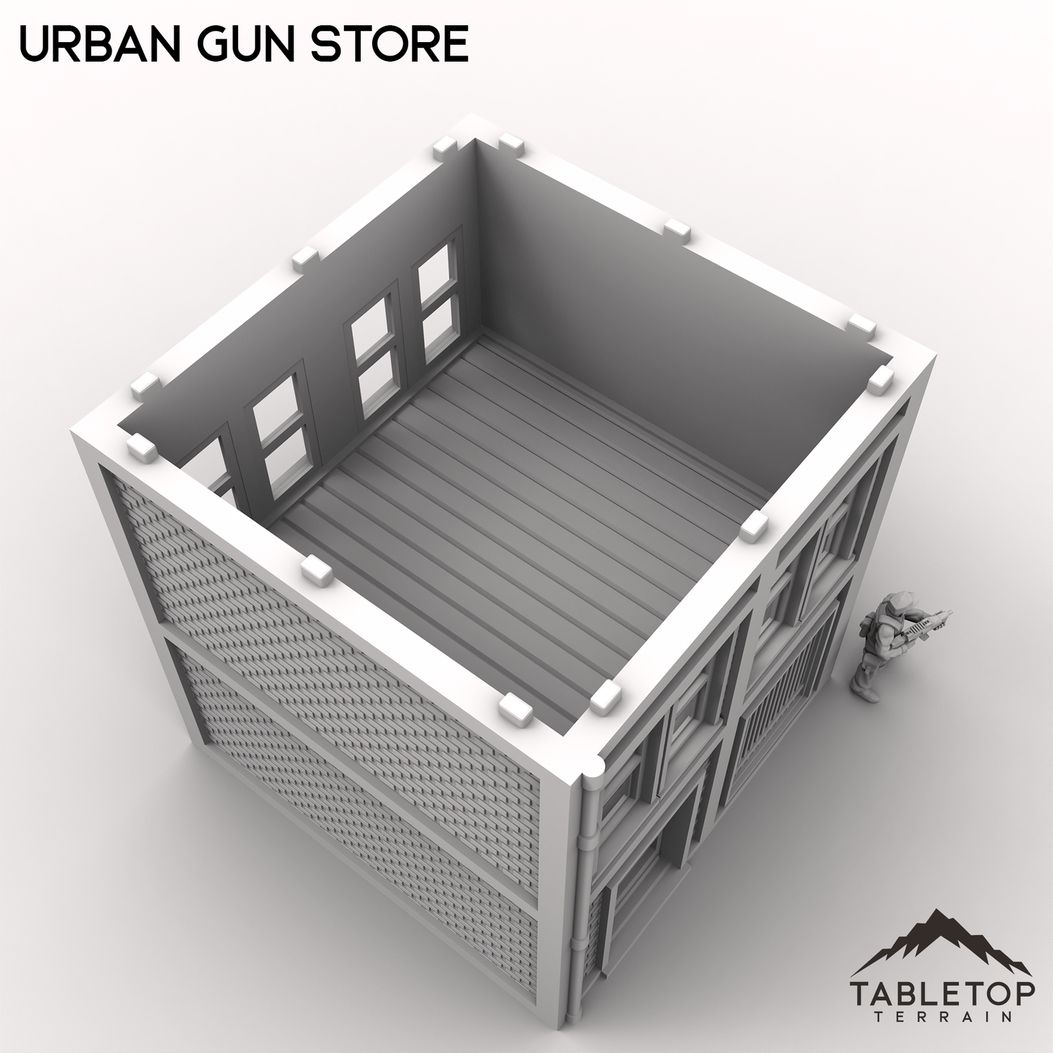 Expand your modern tabletop game's layout with the Urban Gun Store! Perfect for urban or industrial tabletop settings, serving as a key location for storage, missions, or battles. Each story has an interior floor, and features both a front and back entrance with sliding doors.