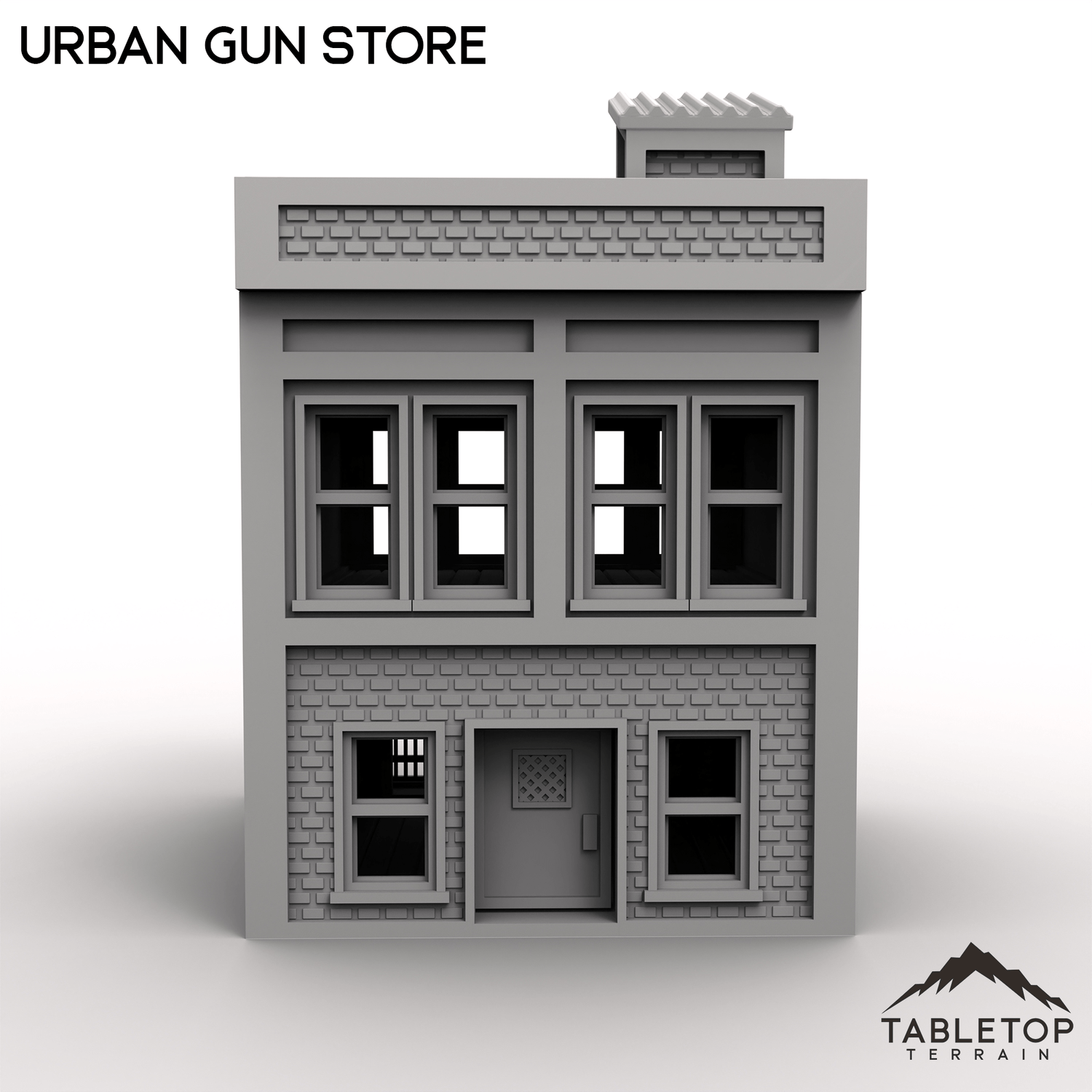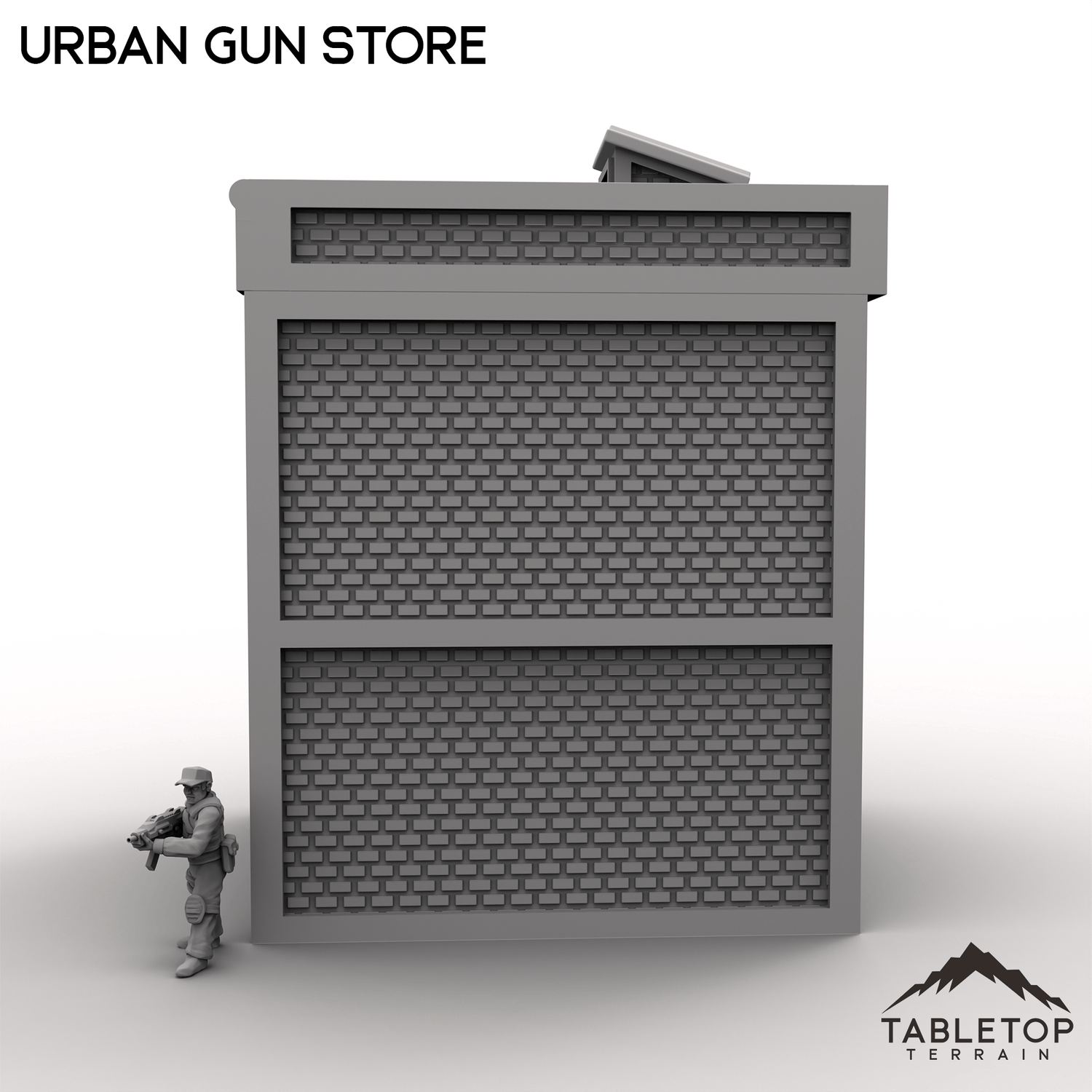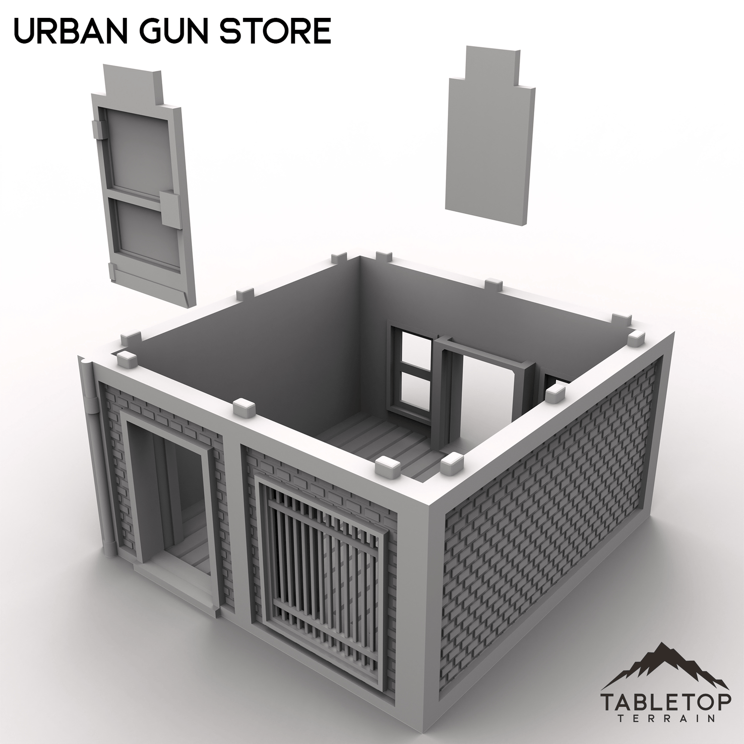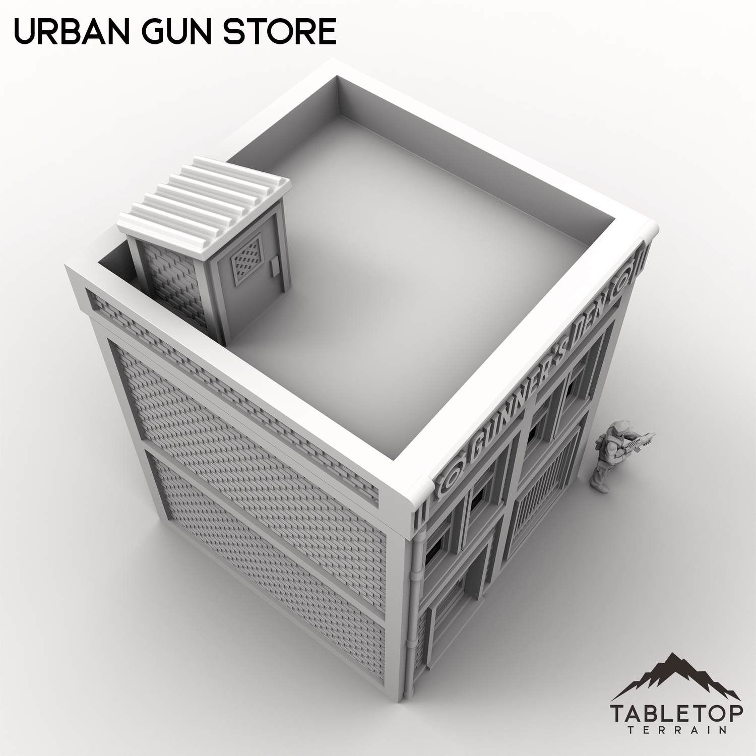 Expand your modern tabletop game's layout with the Urban Gun Store! Perfect for urban or industrial tabletop settings, serving as a key location for storage, missions, or battles. Each story has an interior floor, and features both a front and back entrance with sliding doors.