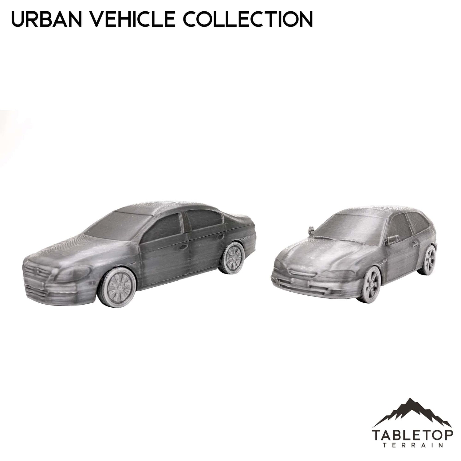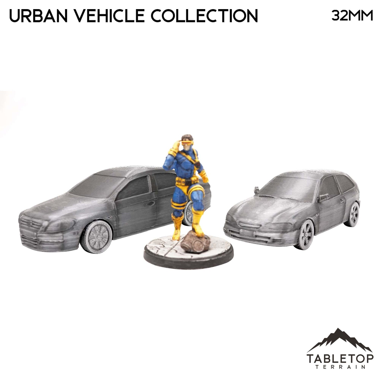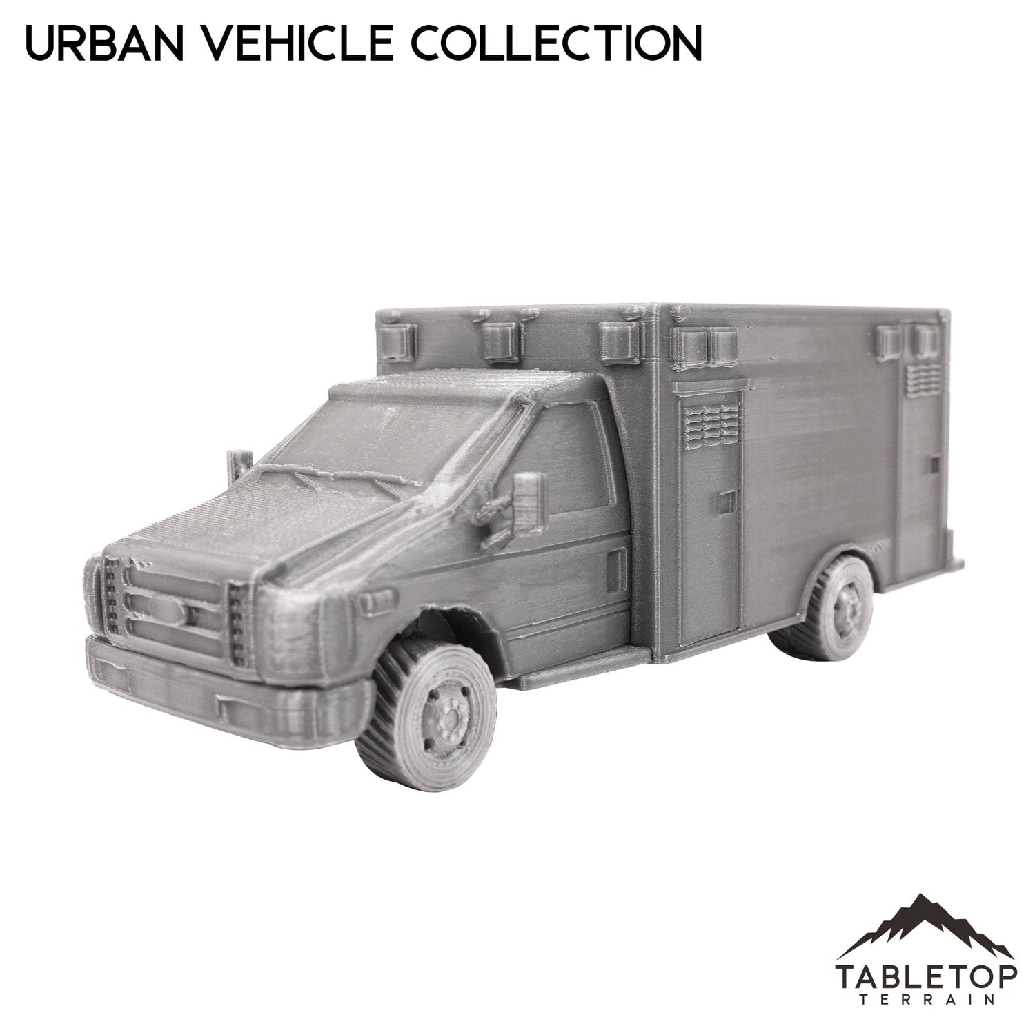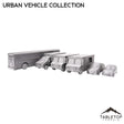 The Urban Vehicle Collection is a set of Urban vehicles for the tabletop. They require a little assembly- each vehicle's wheels need to be glued to the vehicle. The City Bus and Ambulance come in two pieces and need to be glued together at the middle. The Vehicle Collection is available in 40mm, 32mm and 28mm scale.