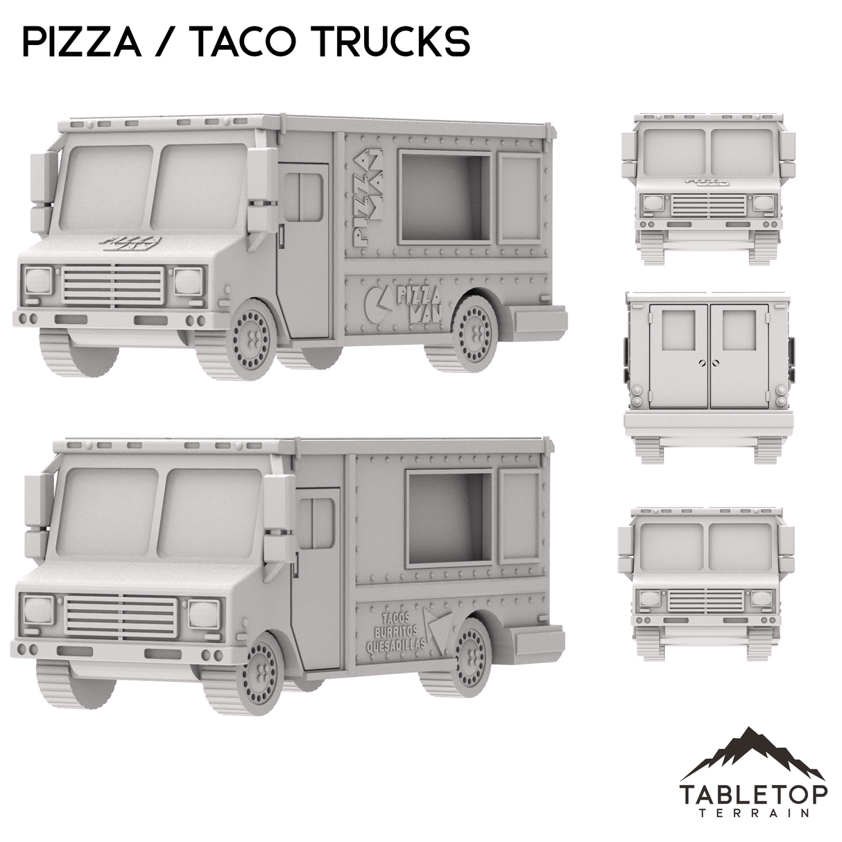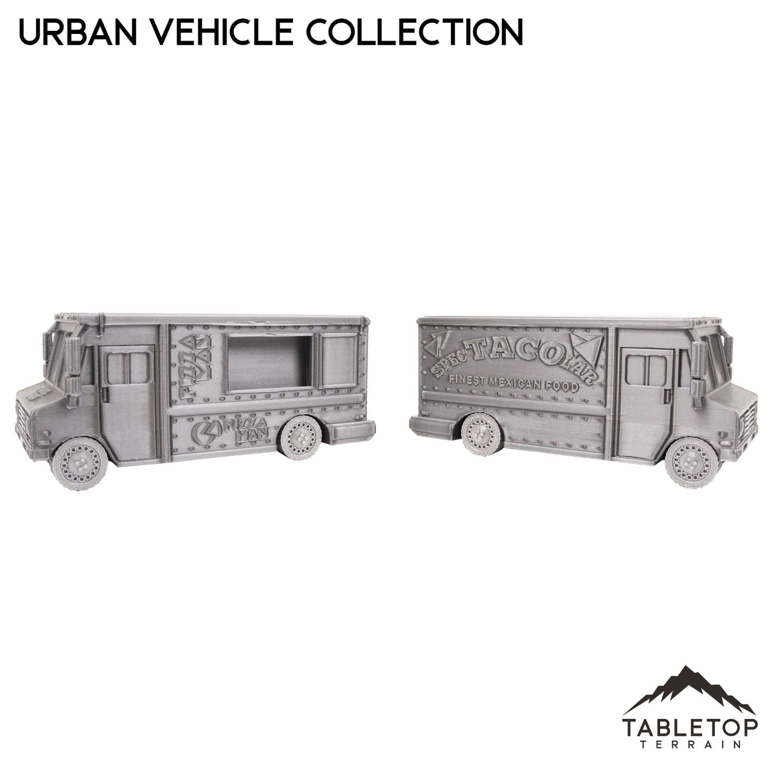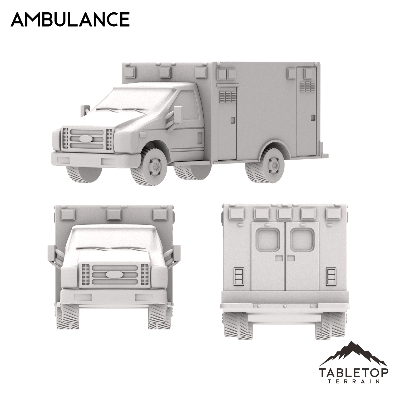 The Urban Vehicle Collection is a set of Urban vehicles for the tabletop. They require a little assembly- each vehicle's wheels need to be glued to the vehicle. The City Bus and Ambulance come in two pieces and need to be glued together at the middle. The Vehicle Collection is available in 40mm, 32mm and 28mm scale.