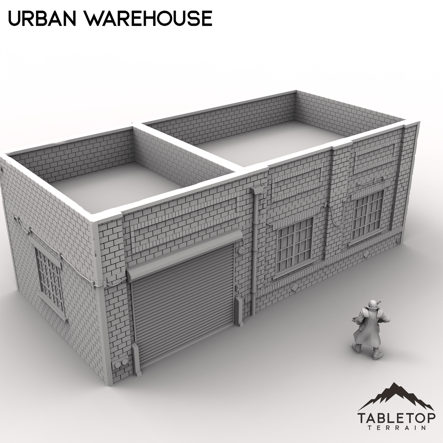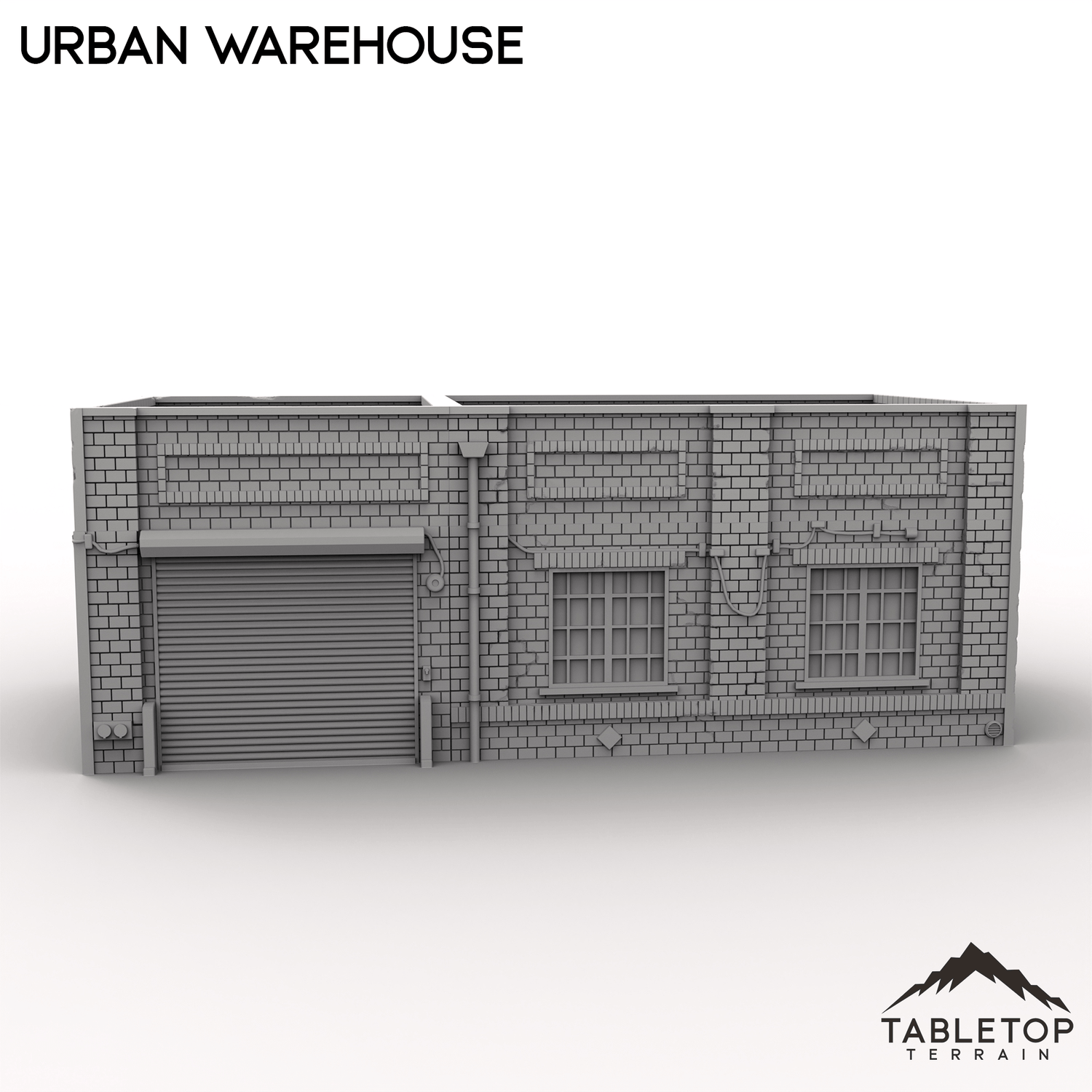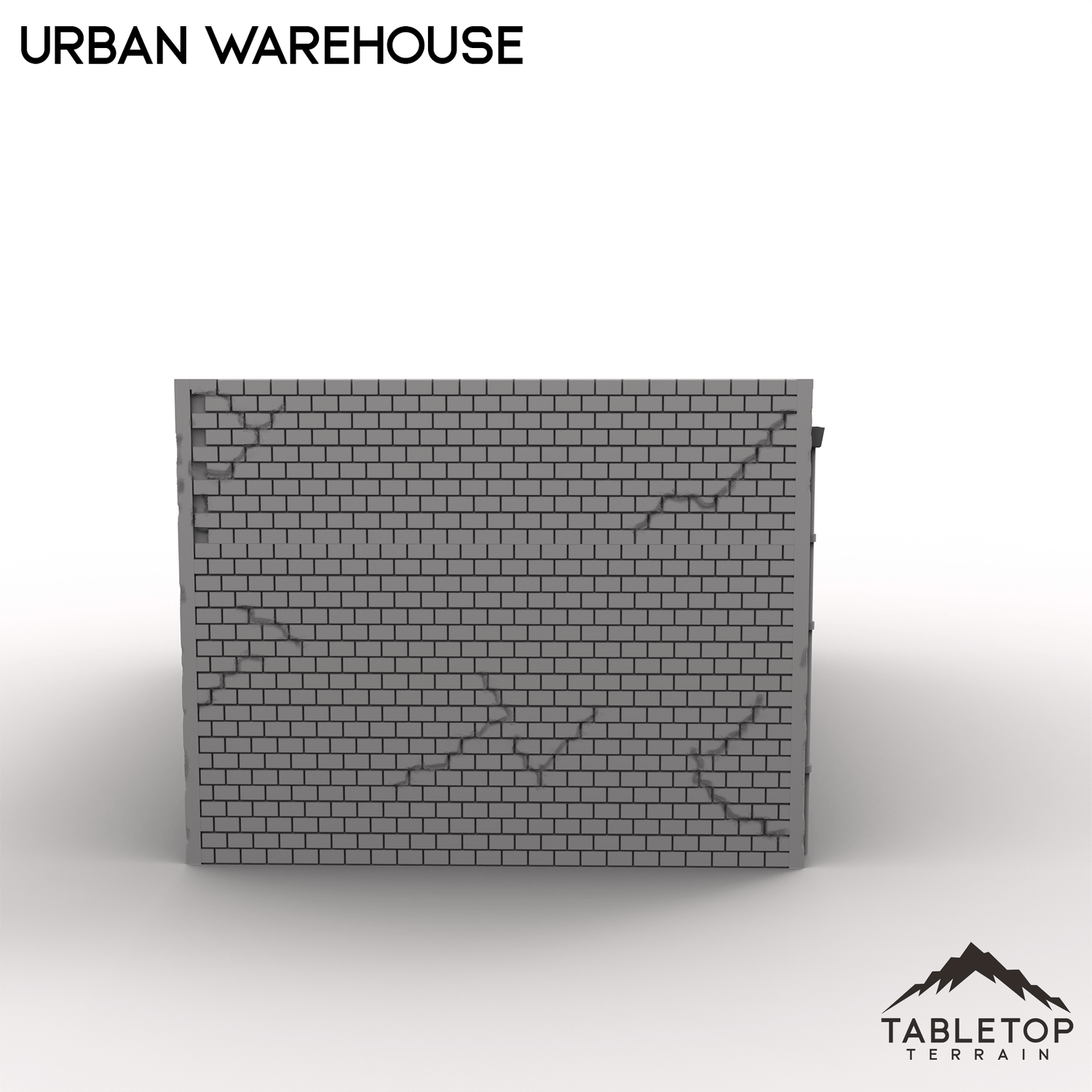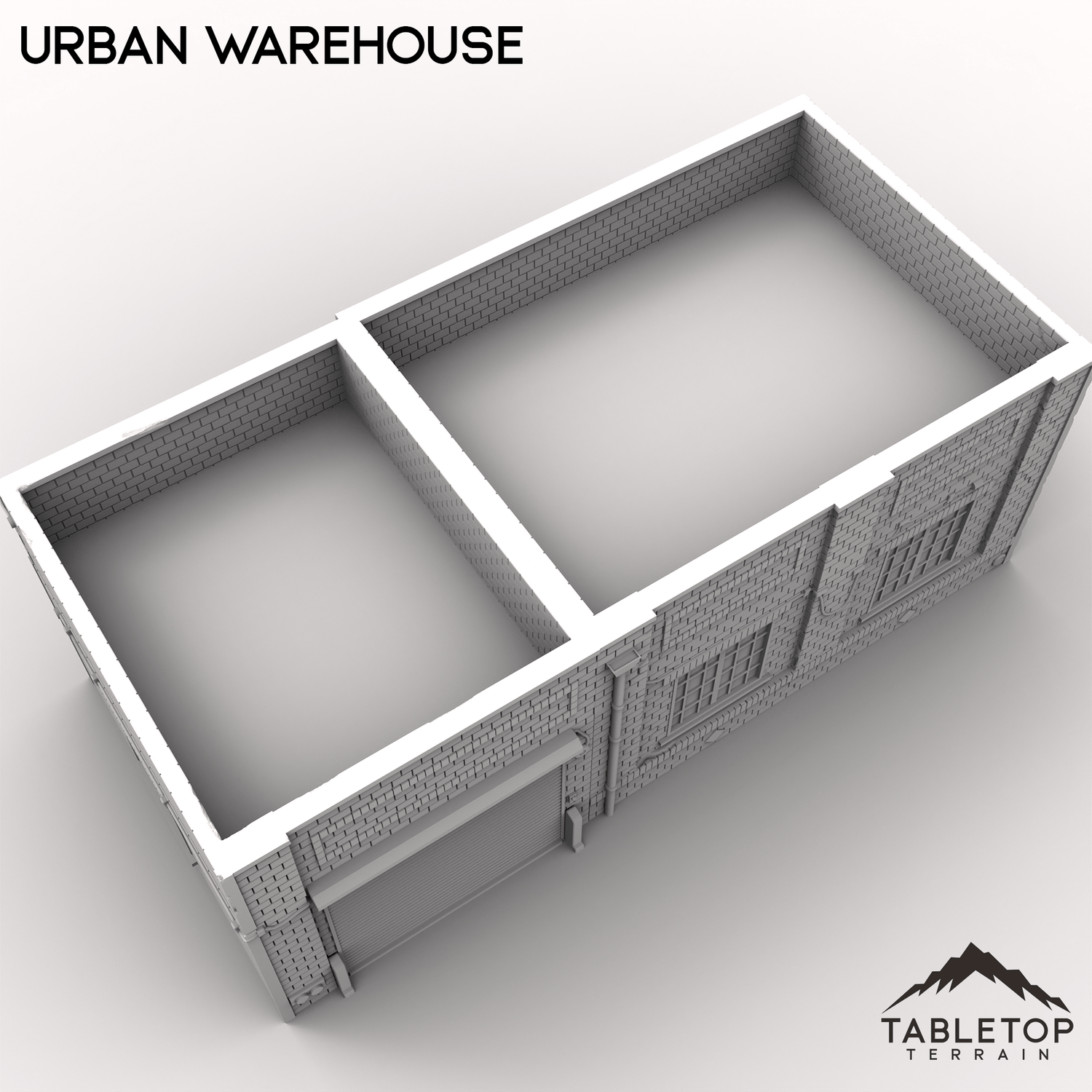 A sturdy industrial Urban Warehouse with a large open roof and a prominent loading door at the front. The structure features brickwork textures and metal panel details, adding an aged and utilitarian look. Perfect for urban or industrial tabletop settings, serving as a key location for storage, missions, or battles.