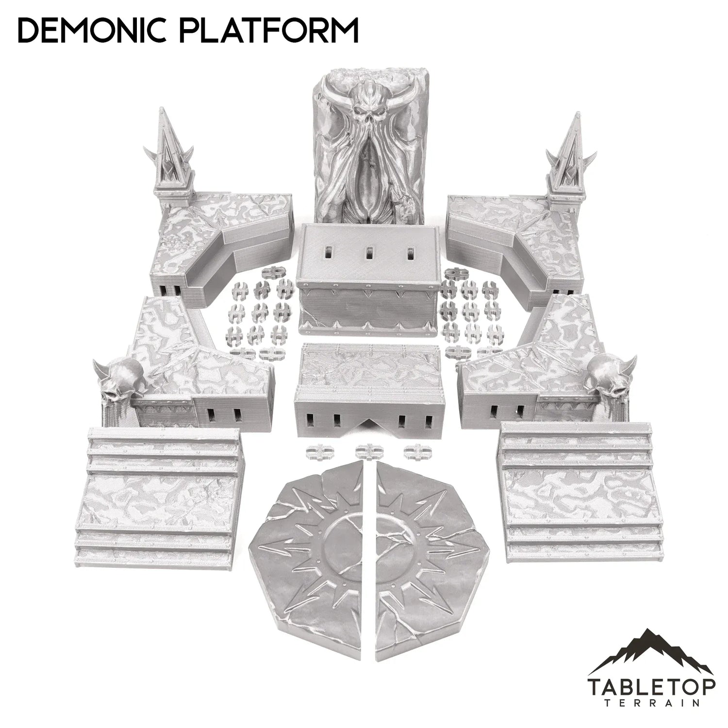 The Demonic Platform is a set of 11 Openlock pieces that clip together to form the platform. It can be broken apart for condensed storage.