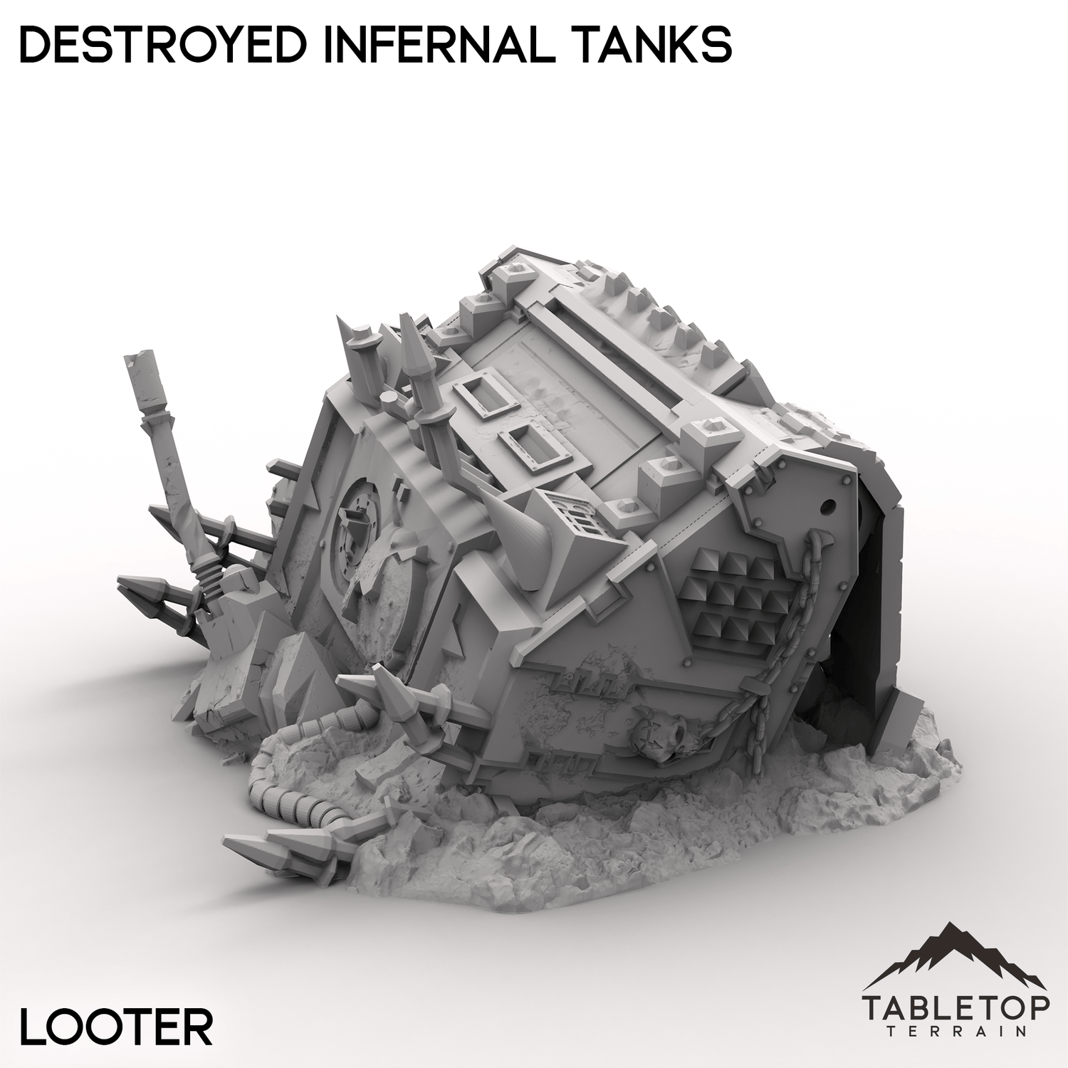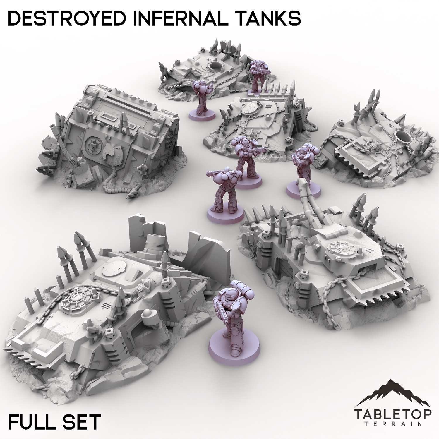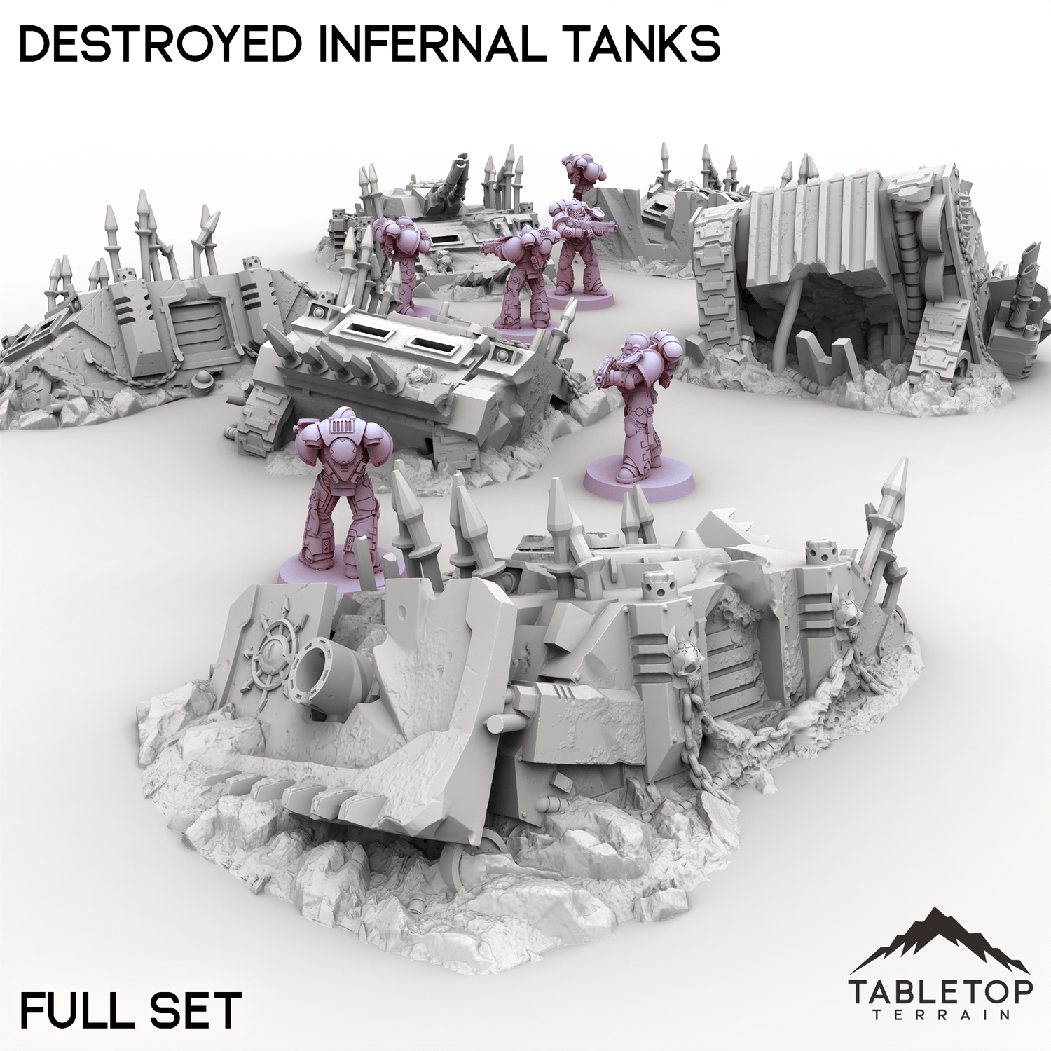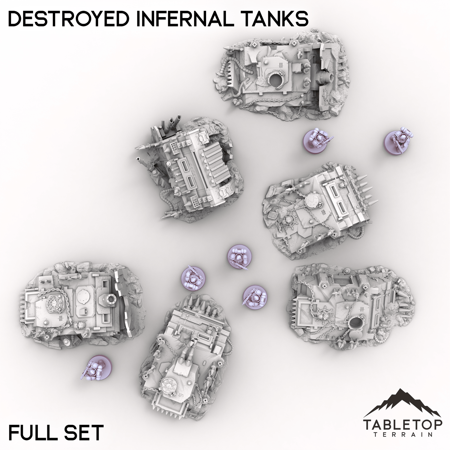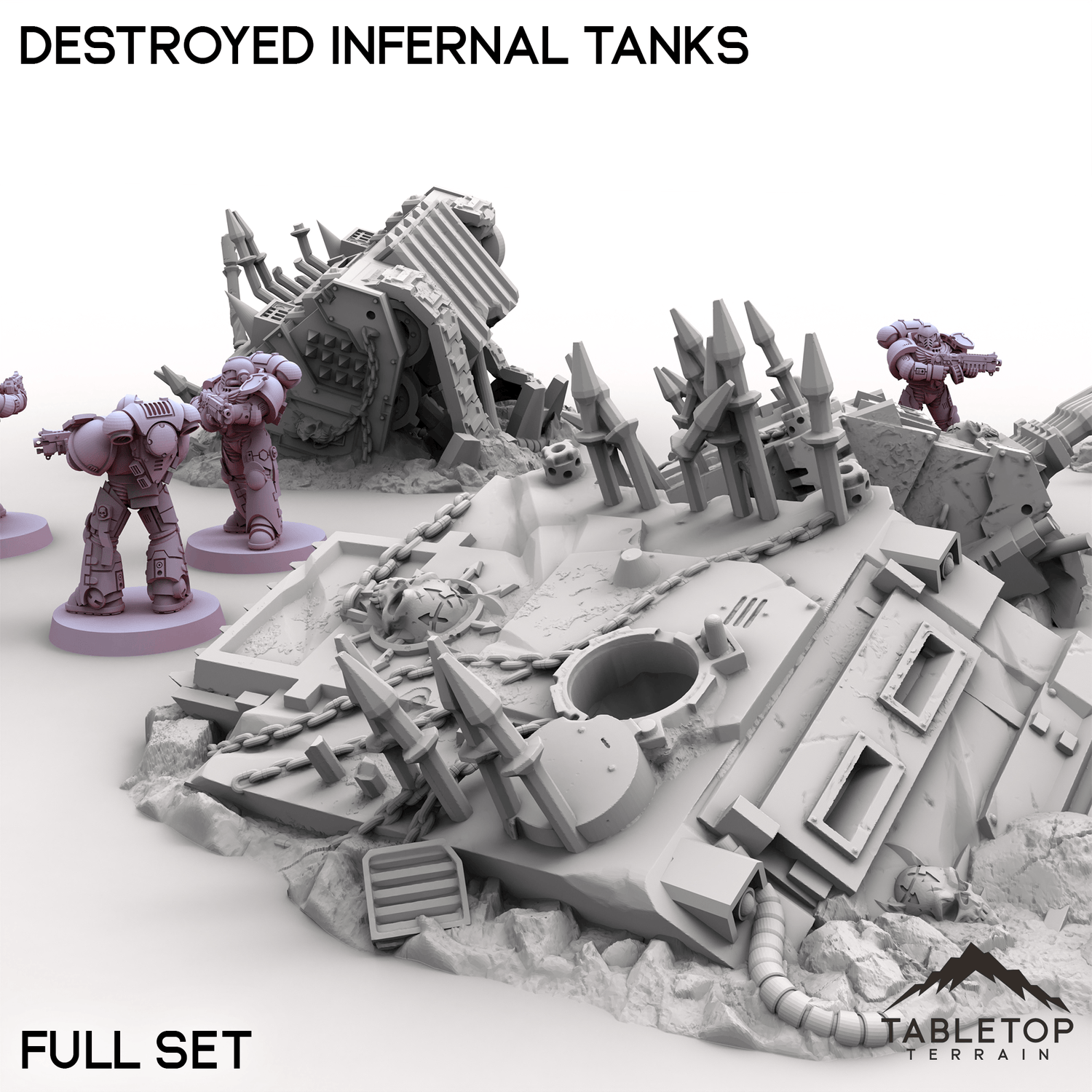 The Destroyed Infernal Tanks adds gritty, war-torn realism to your battlefield. Each wreck is packed with detail such as broken treads, cratered armor, and bent barrels. Perfect as terrain, cover, or battlefield markers, these ruined machines of the dark powers bring your warzone scenes to life.