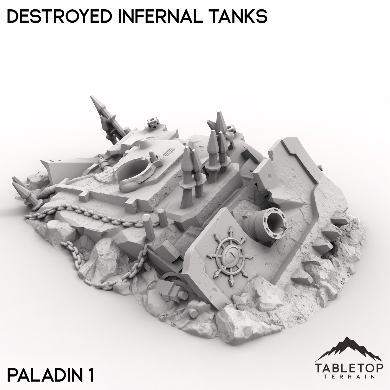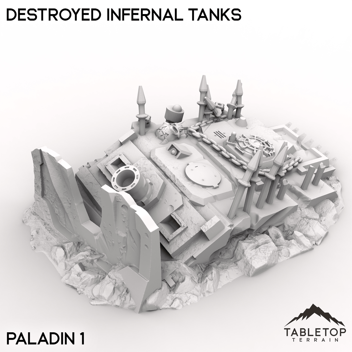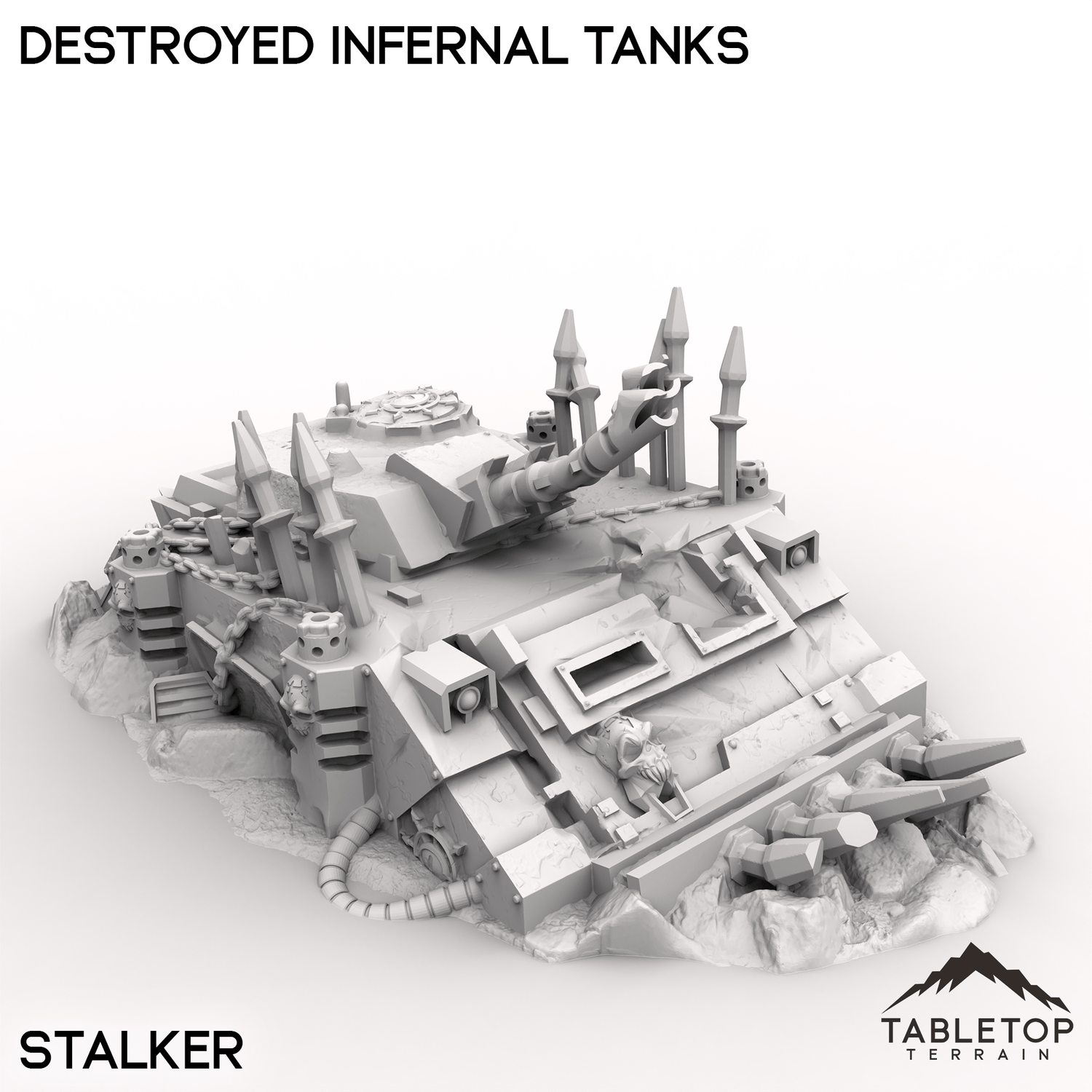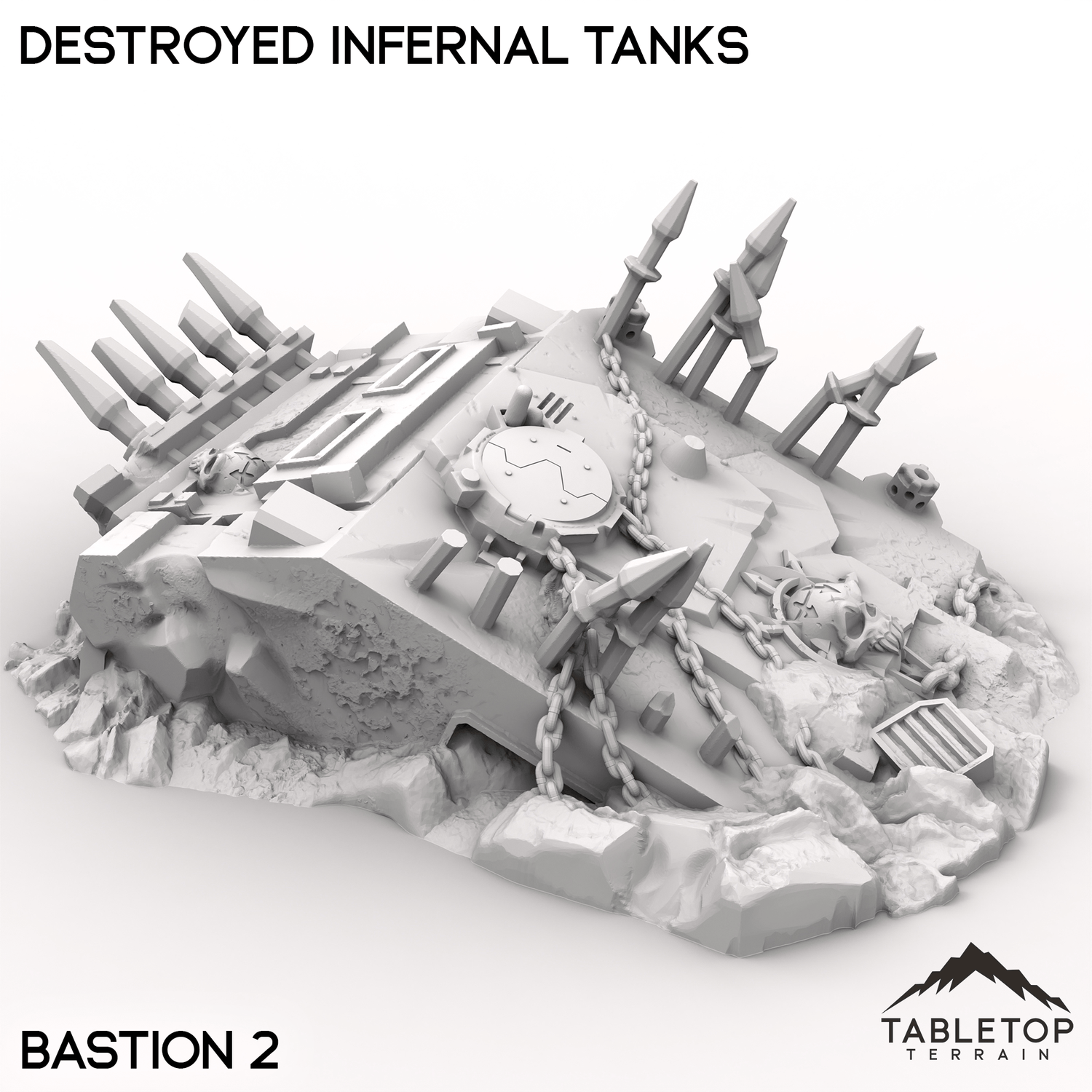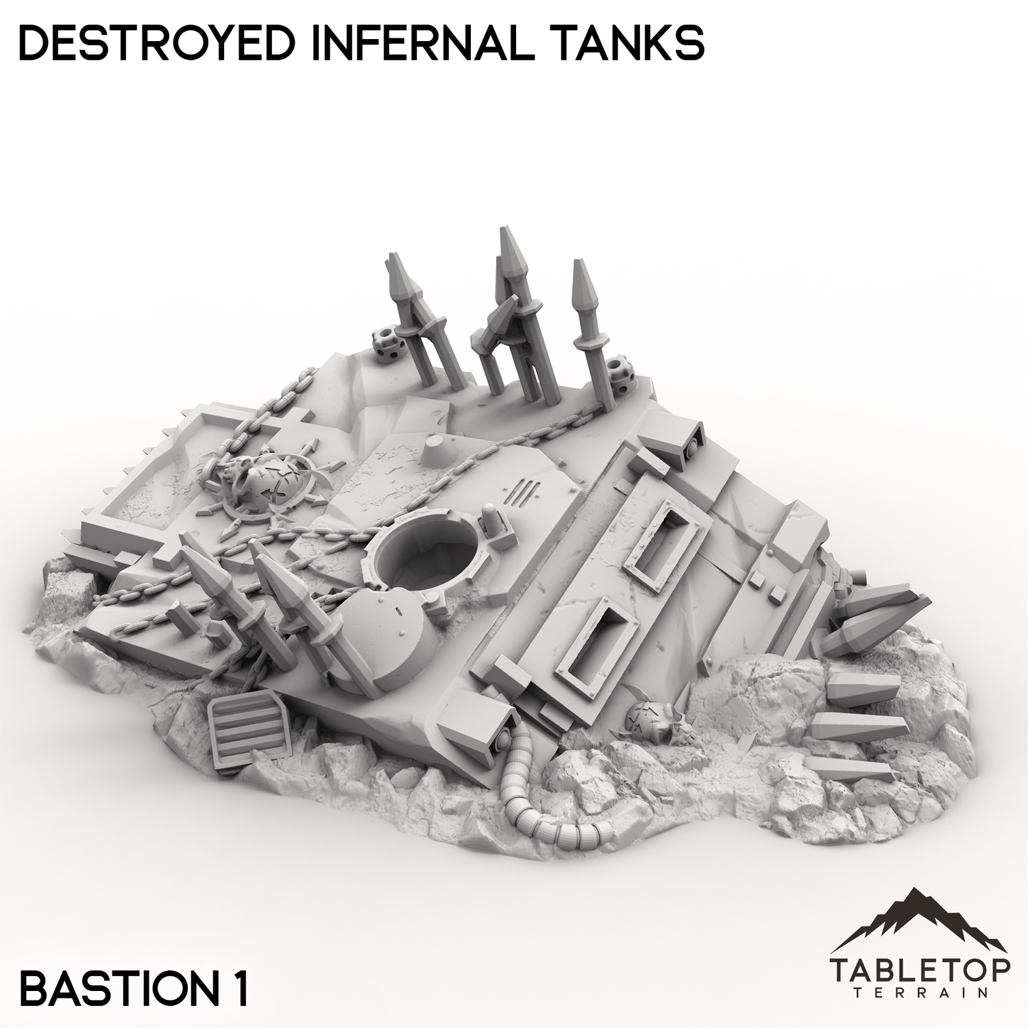 The Destroyed Infernal Tanks adds gritty, war-torn realism to your battlefield. Each wreck is packed with detail such as broken treads, cratered armor, and bent barrels. Perfect as terrain, cover, or battlefield markers, these ruined machines of the dark powers bring your warzone scenes to life.