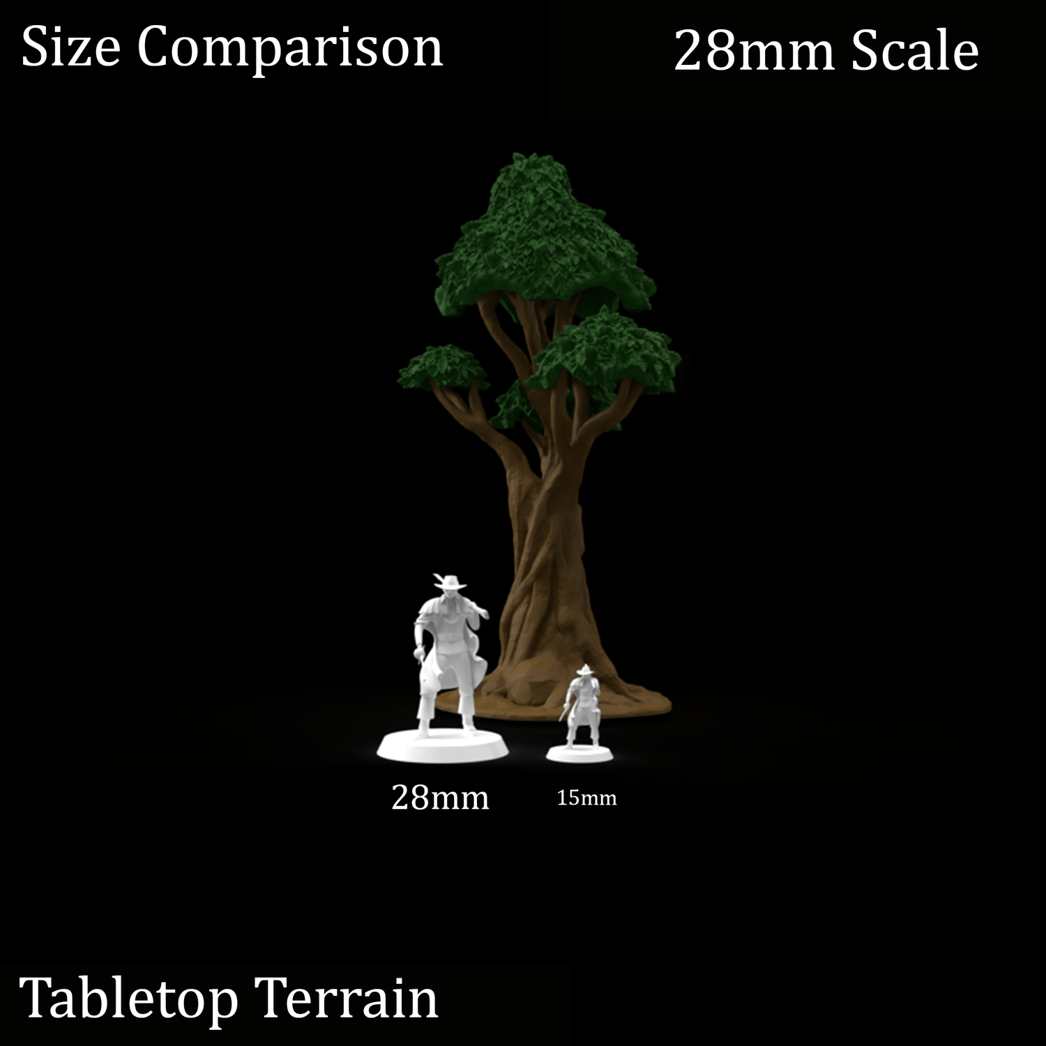 In 28mm scale, the largest tree measures 91x91x174mm / 3.6x3.6x6.8 inches.