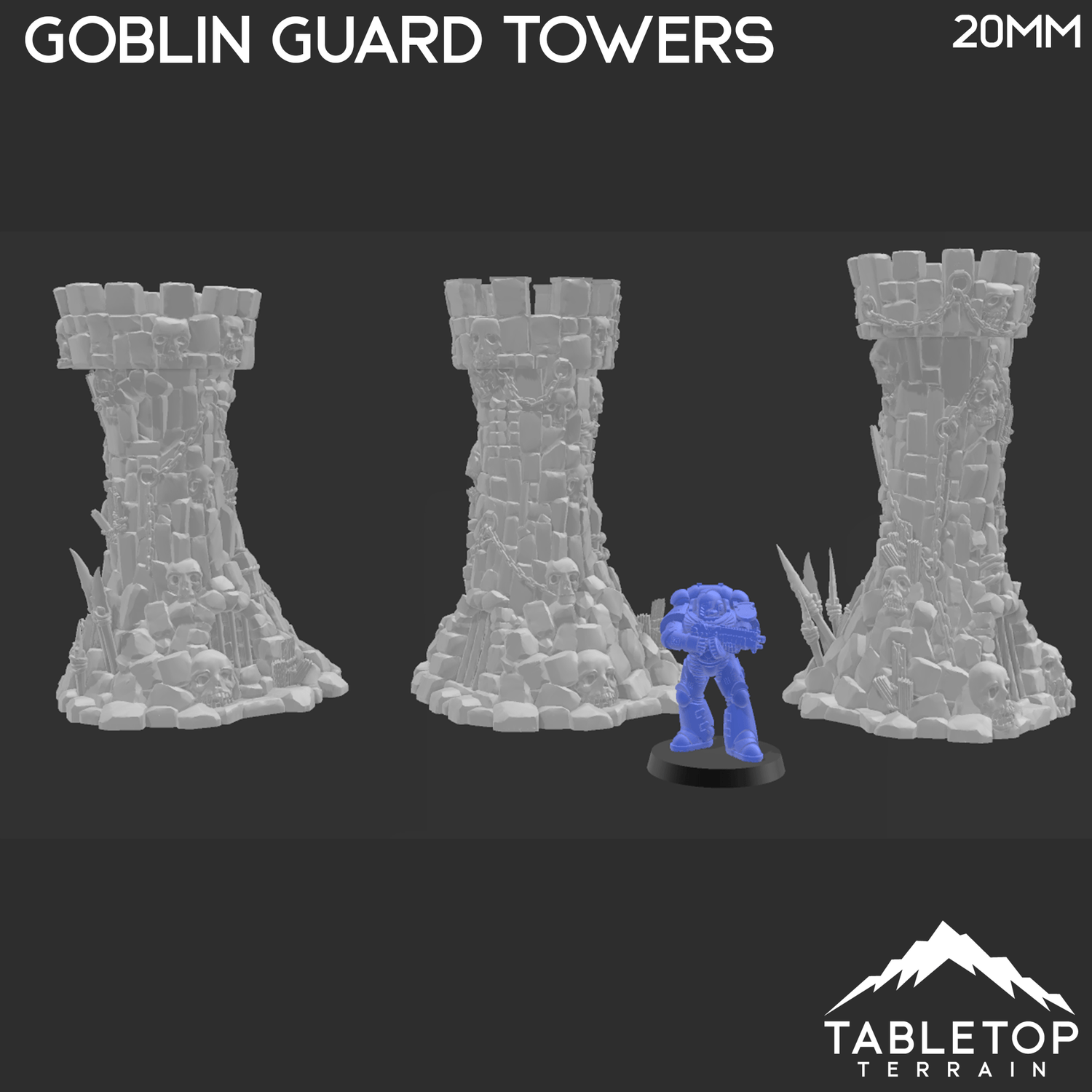 The Goblin Guard towers is a set of three fantasy-styled towers with removable roofs, designed to fit in with the rest of the Goblin Grotto set. They are perfect for Dungeons and Dragons DND, Age of Sigmar AOS, Kings of War, Malifaux, Frostgrave, or other fantasy games.