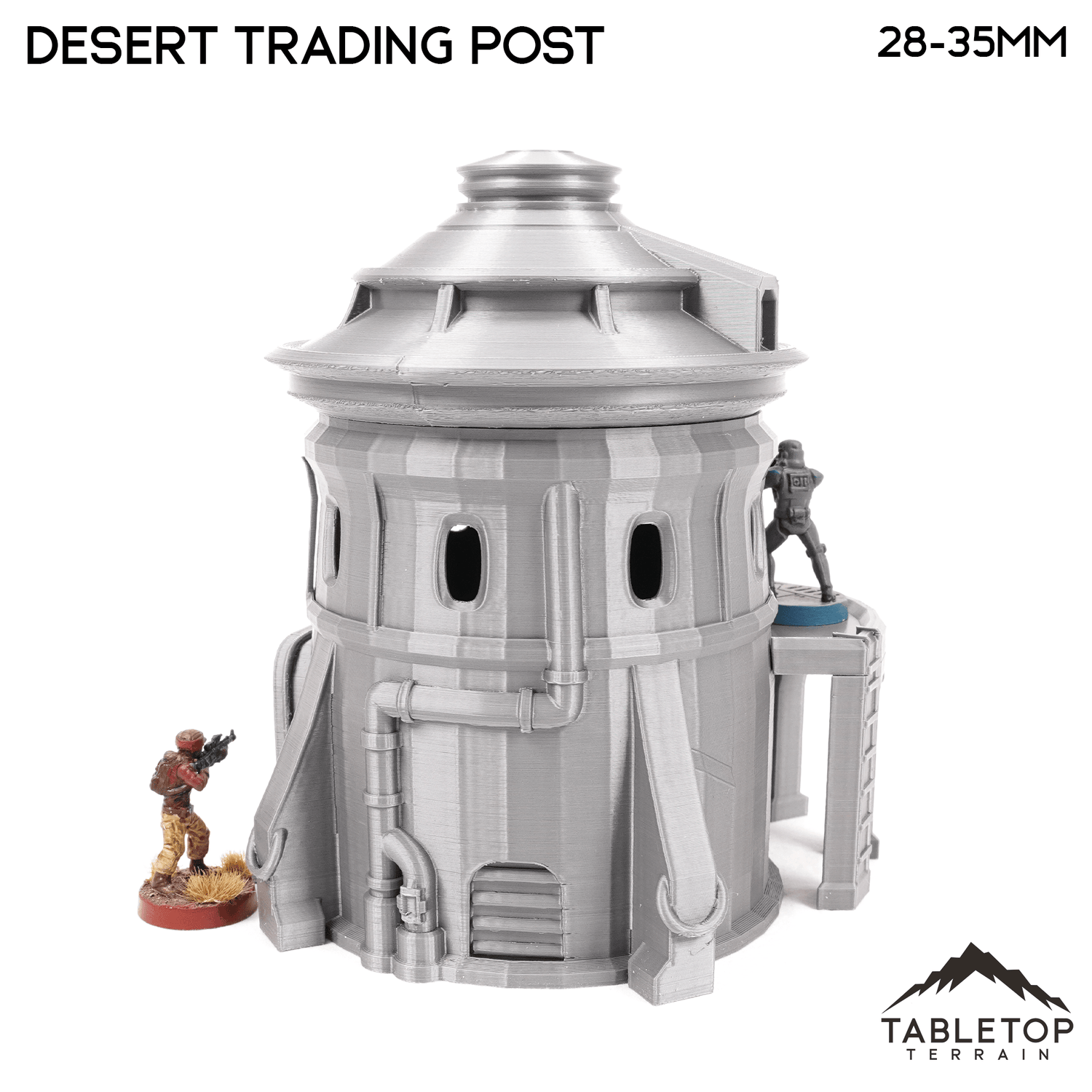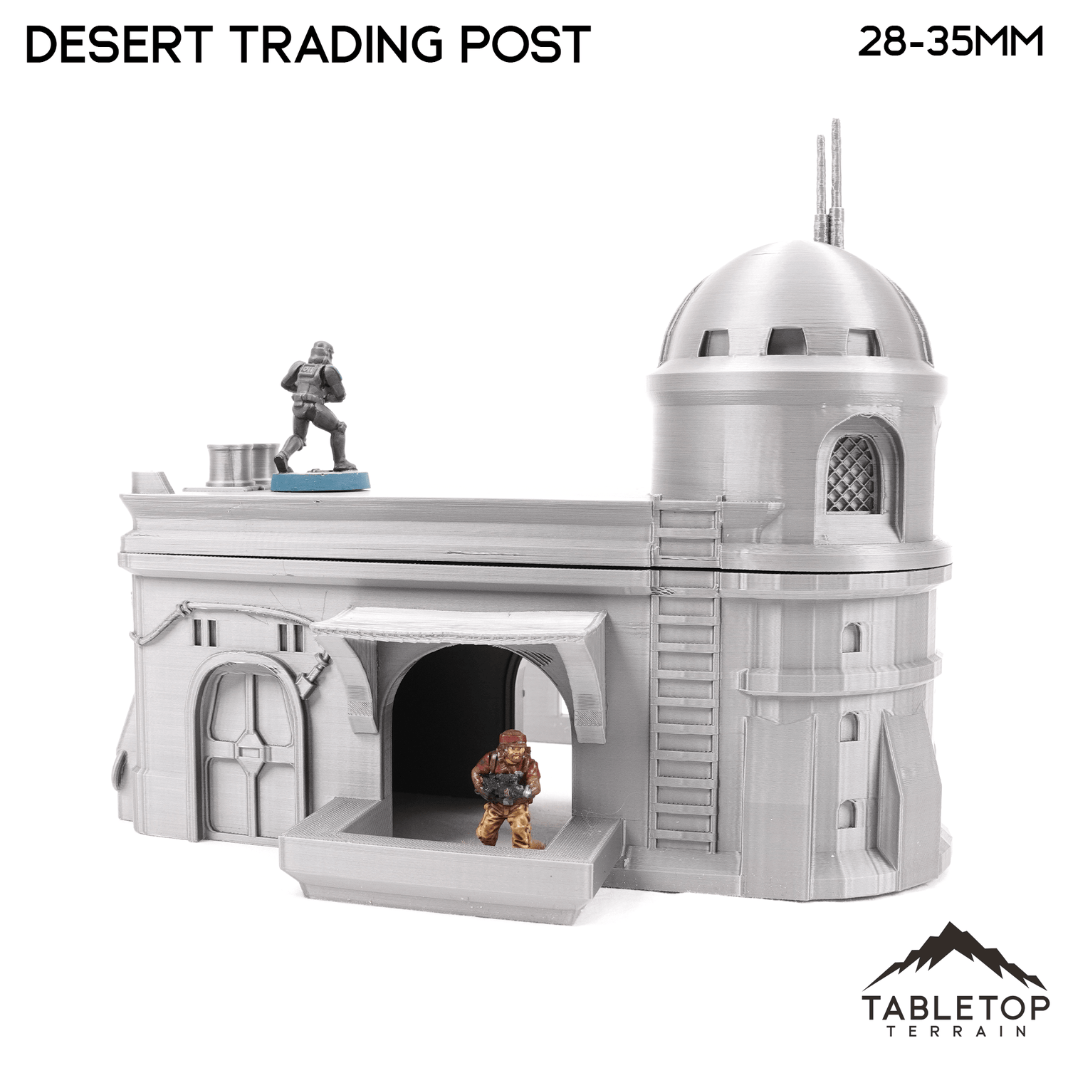 The Desert Trading Post set is a trading building with an attached courtyard and a house with a covered side patio. The Trading house is printed in 40mm, 28-35mm (1:47), 20mm, and 15mm scale. We recommend the 40mm scale for Shatterpoint and the 28-35mm (1:47) scale for Legion.