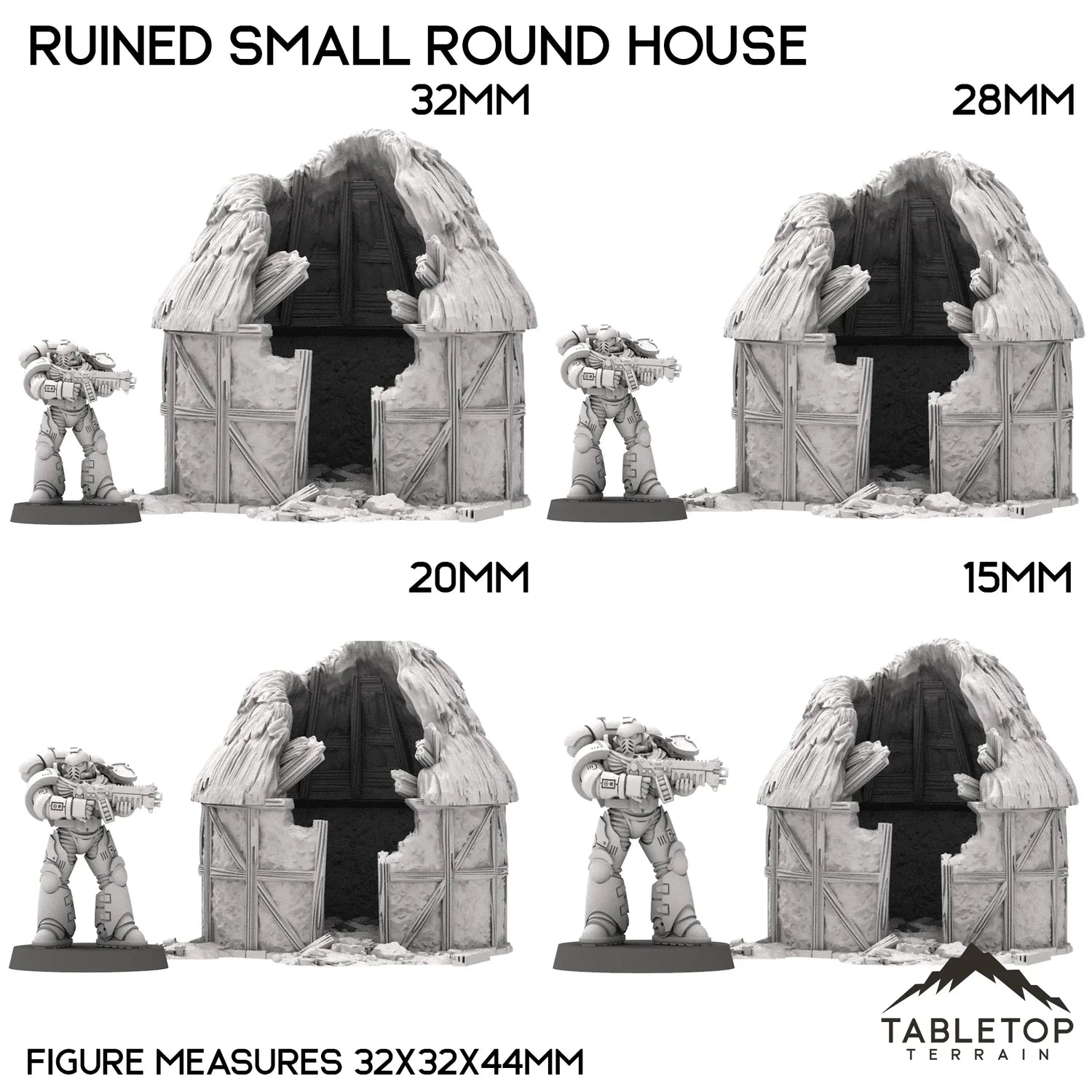 In 32mm scale, the building measures 127x126x96mm / 5.0x4.9x3.8 inches.