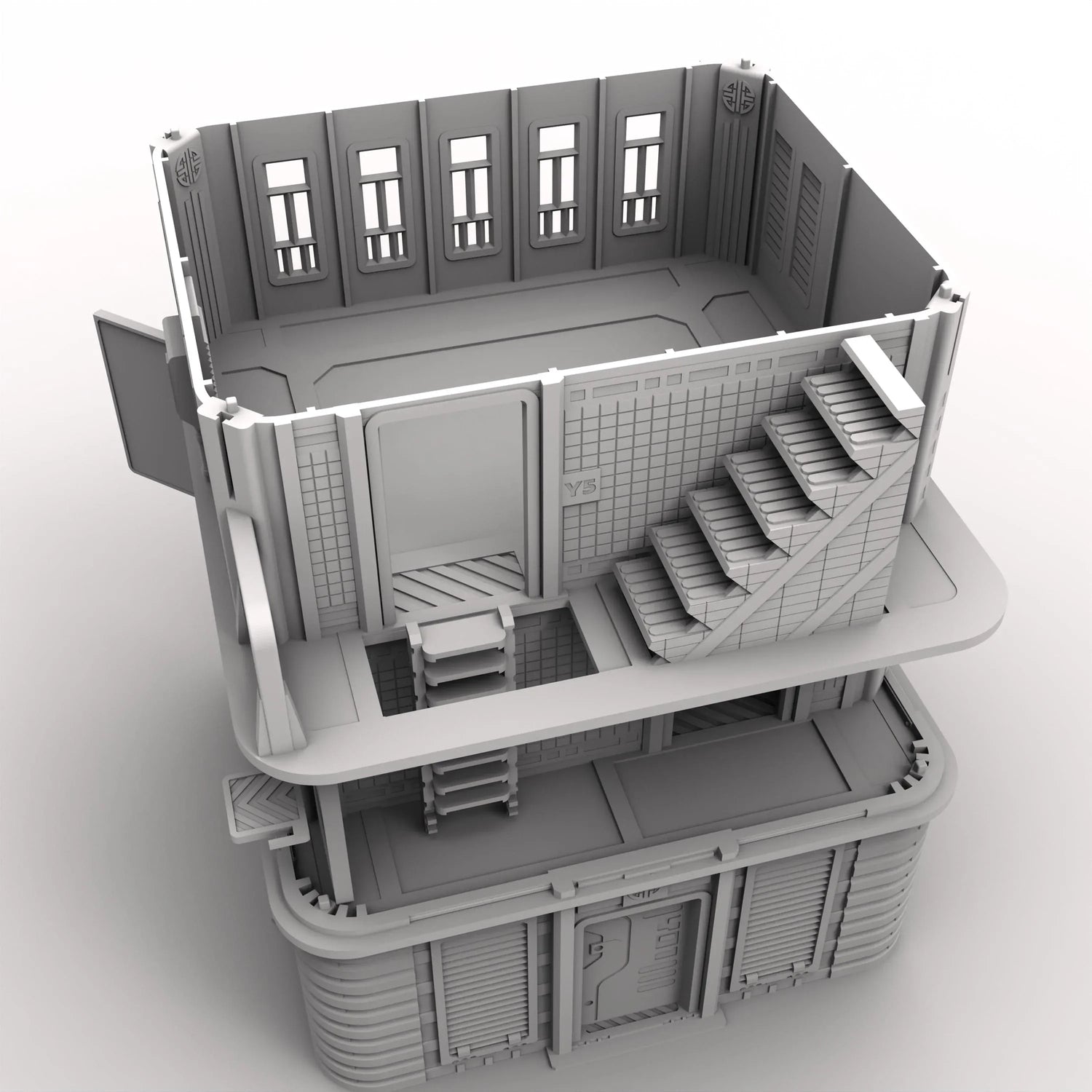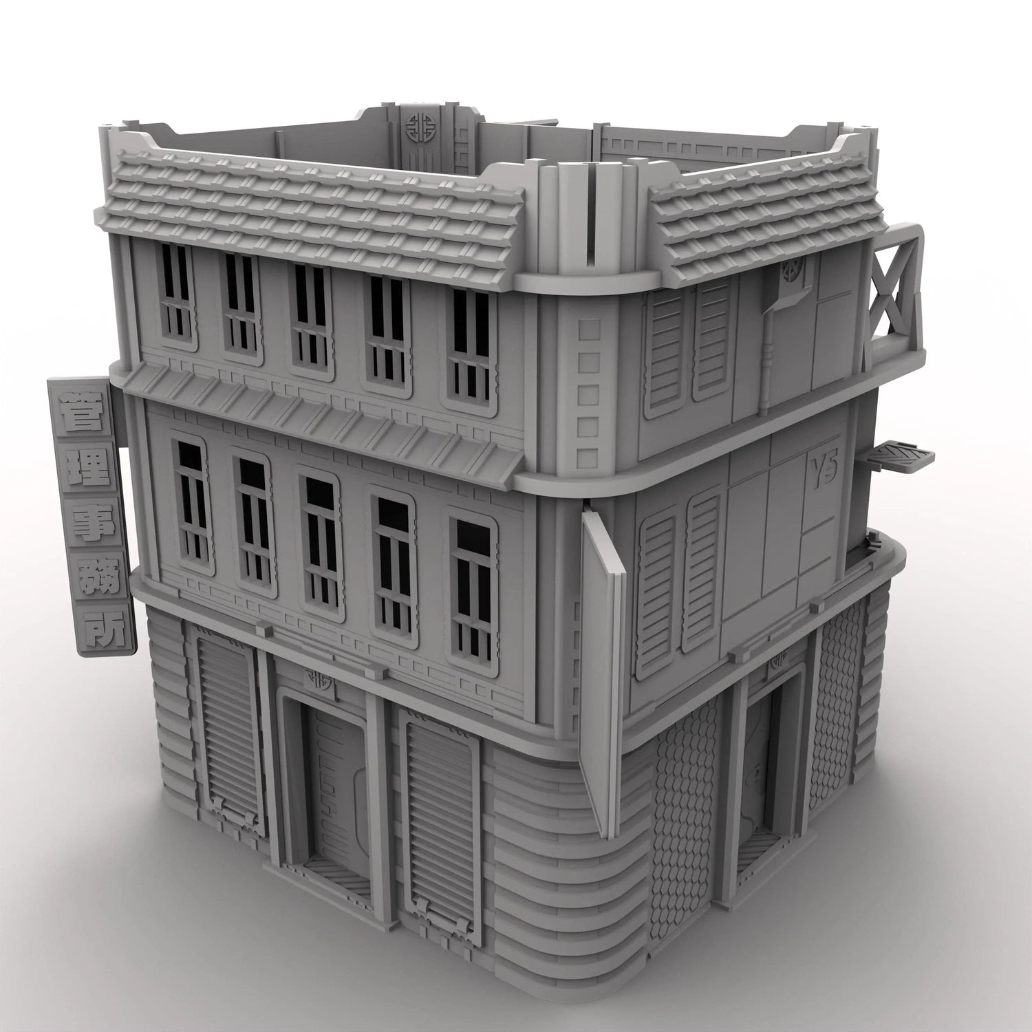 The Toncho is a three-story urban building featuring a flat roof and walls crowded with signage. Exterior ladders, and exposed stairways give it a dangerous urban feel that would be right at home in a cyberpunk setting.