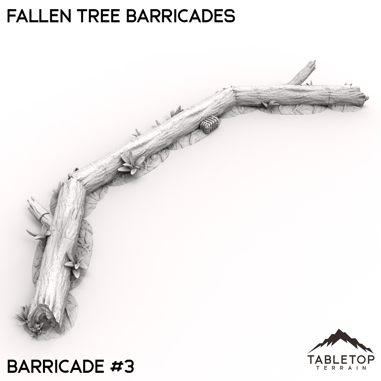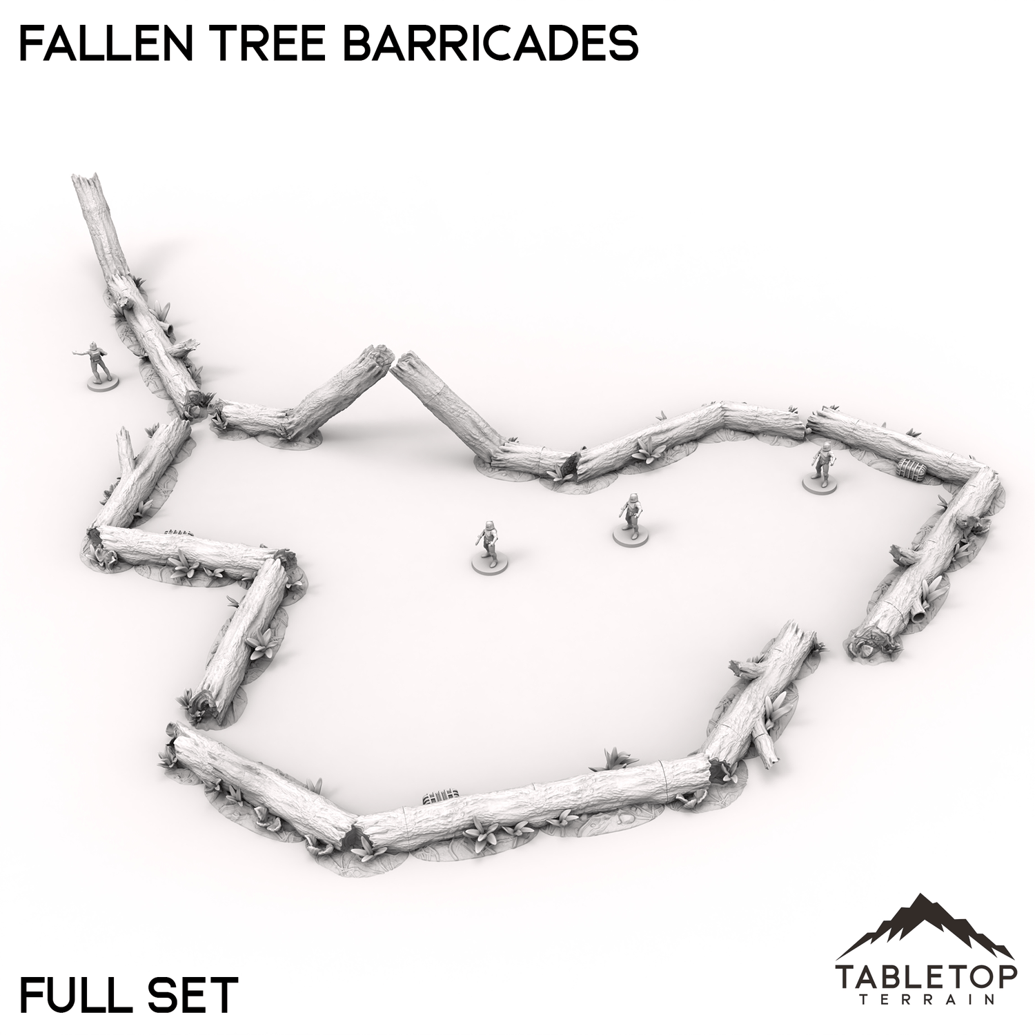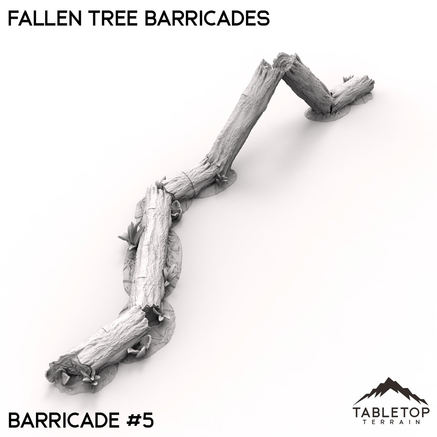Fallen tree barricades, made from toppled logs and broken branches, form a natural defense across rugged terrain. The twisted trunks and thick limbs provide cover and block access, ideal for fortifying forest paths or woodland camps. Moss and debris gather around the base, blending these makeshift barriers into their surroundings.