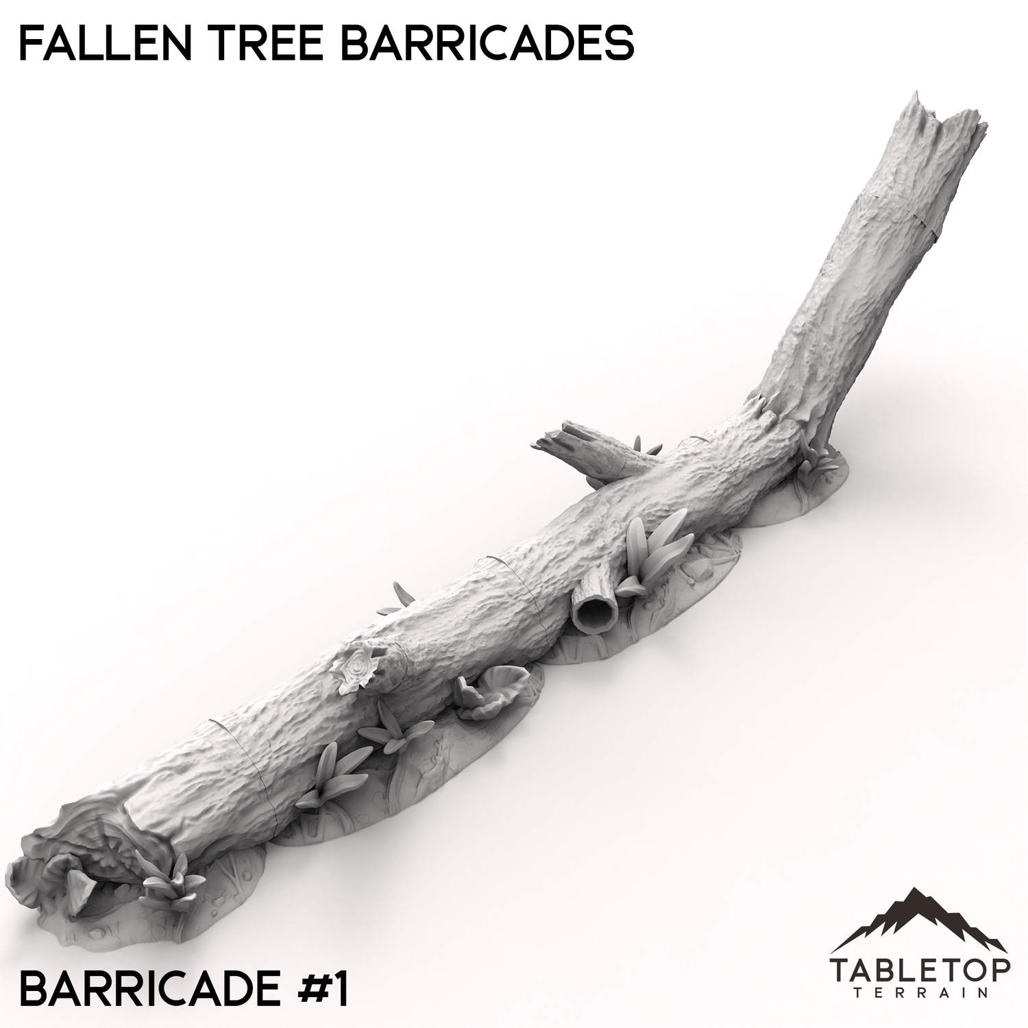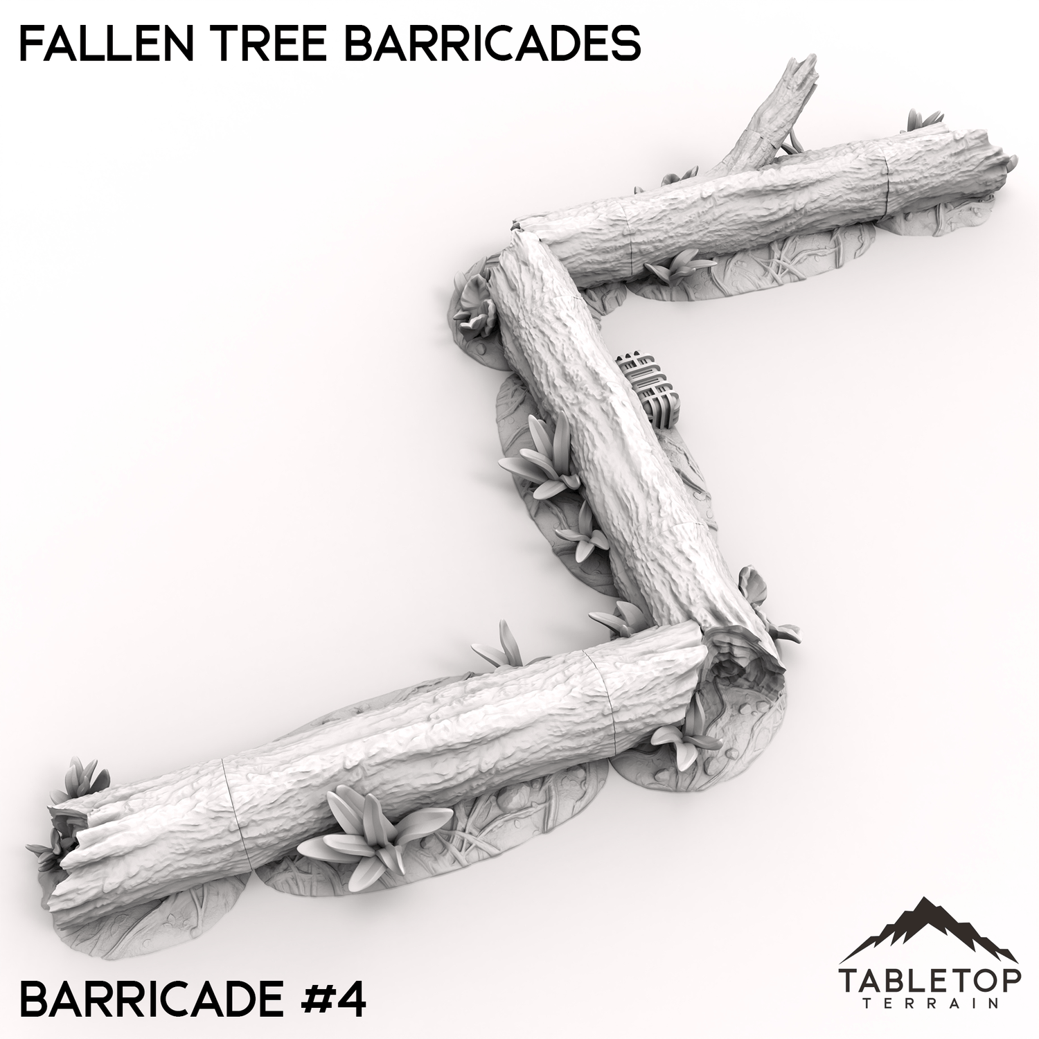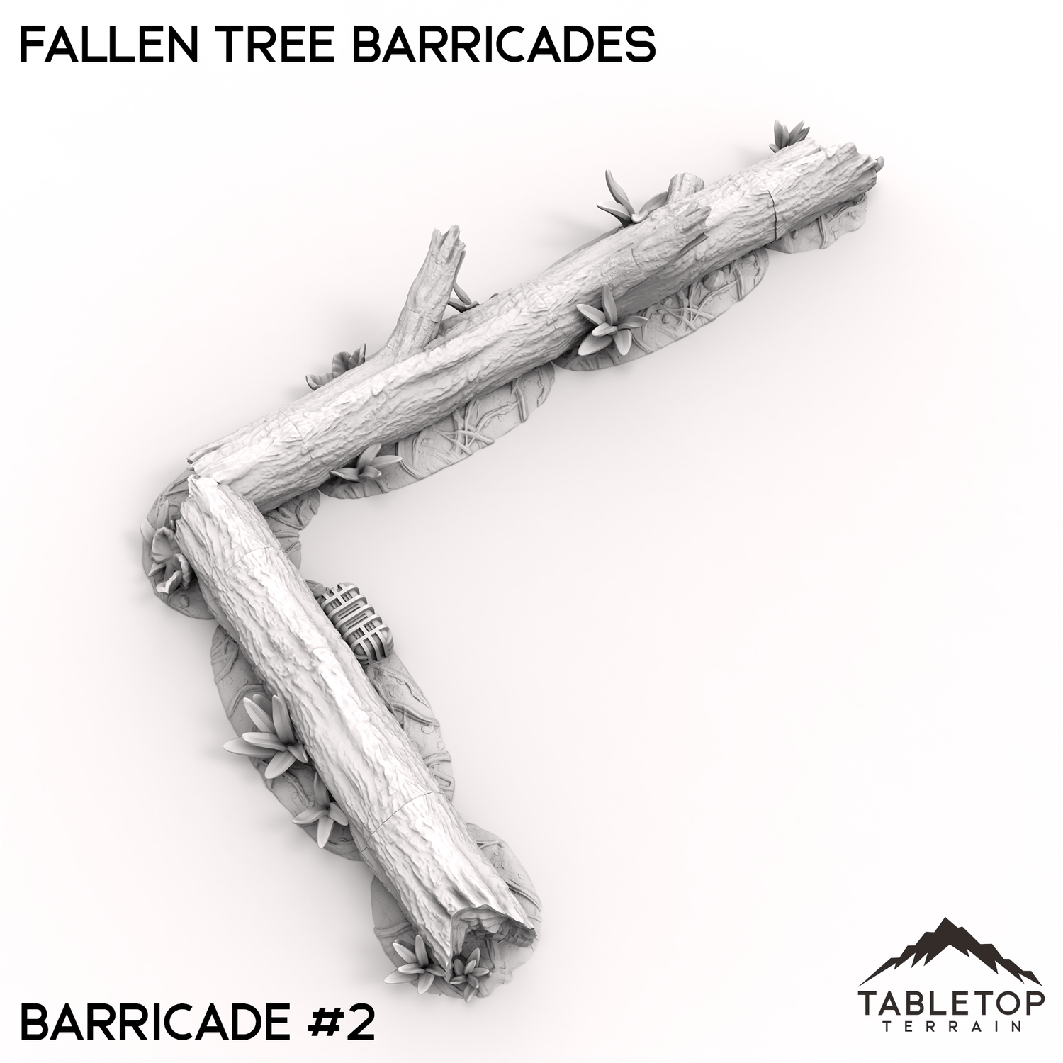 Fallen tree barricades, made from toppled logs and broken branches, form a natural defense across rugged terrain. The twisted trunks and thick limbs provide cover and block access, ideal for fortifying forest paths or woodland camps. Moss and debris gather around the base, blending these makeshift barriers into their surroundings.
