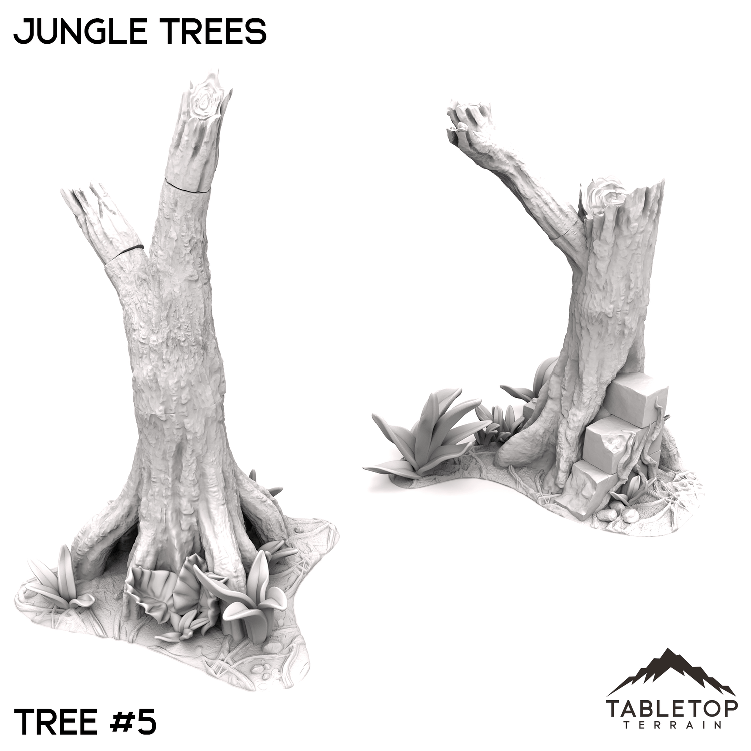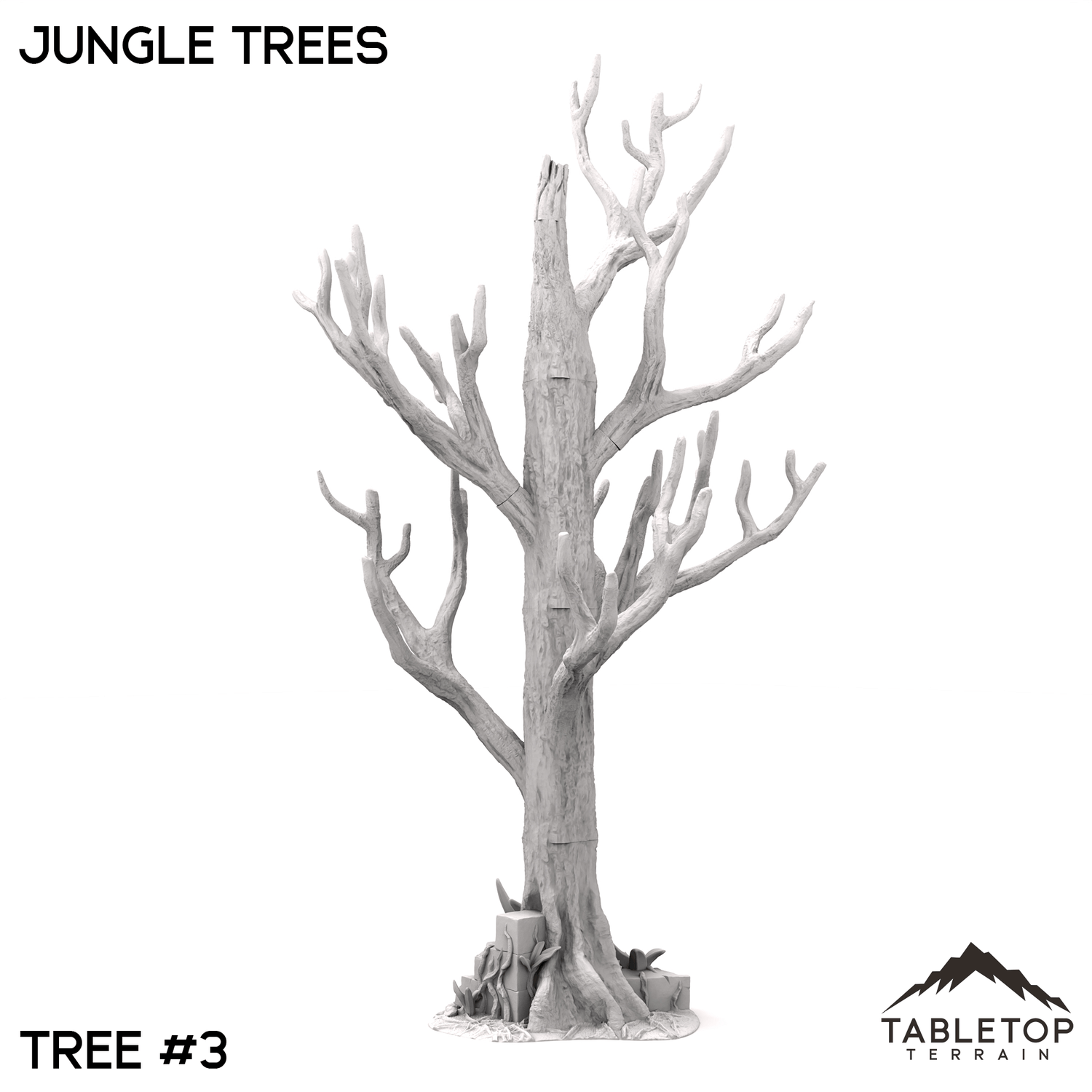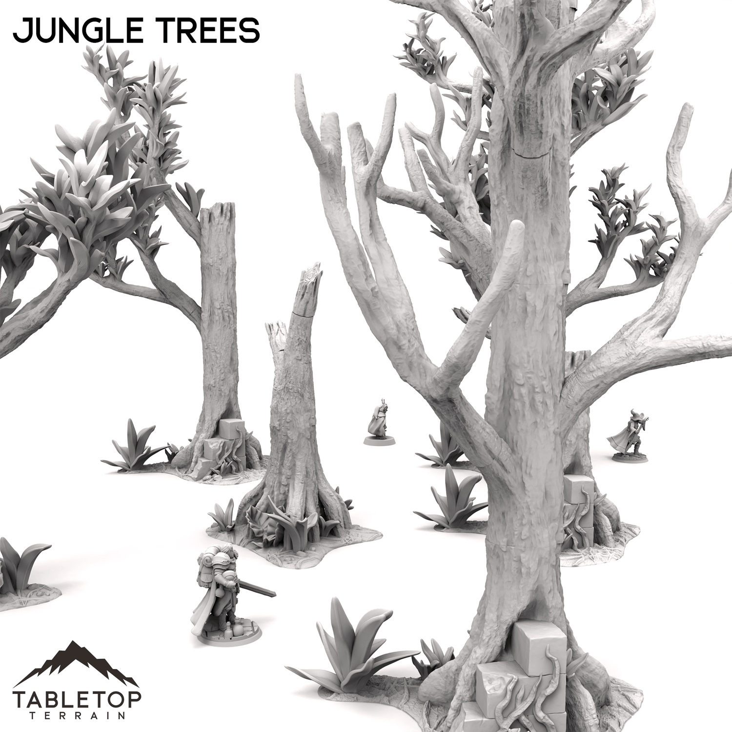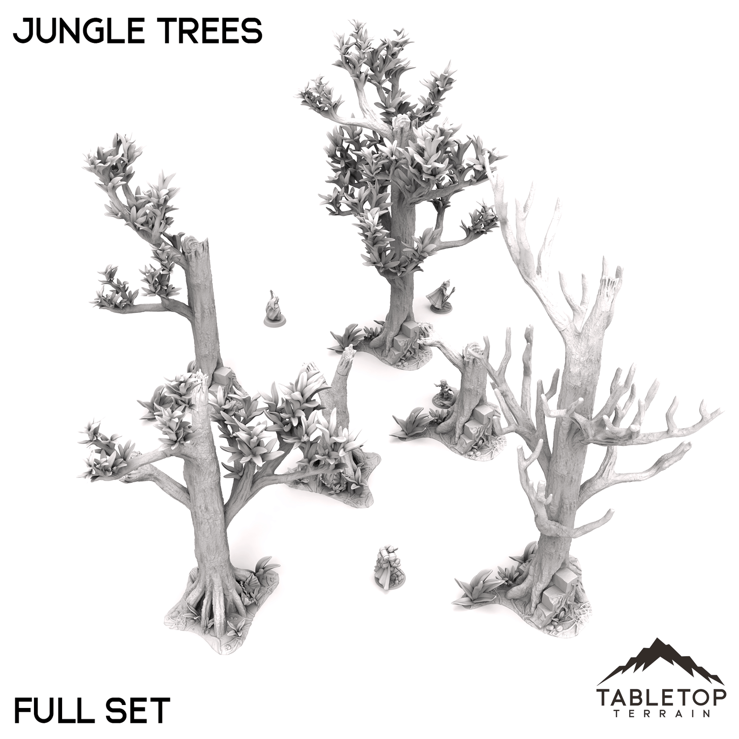 Towering jungle trees stretch toward the sky, their broad leaves casting deep shadows across the forest floor. Some stand tall and vibrant, while others are long-dead, their bare branches twisting eerily in the air. Buy each one individually or the set at a discount
