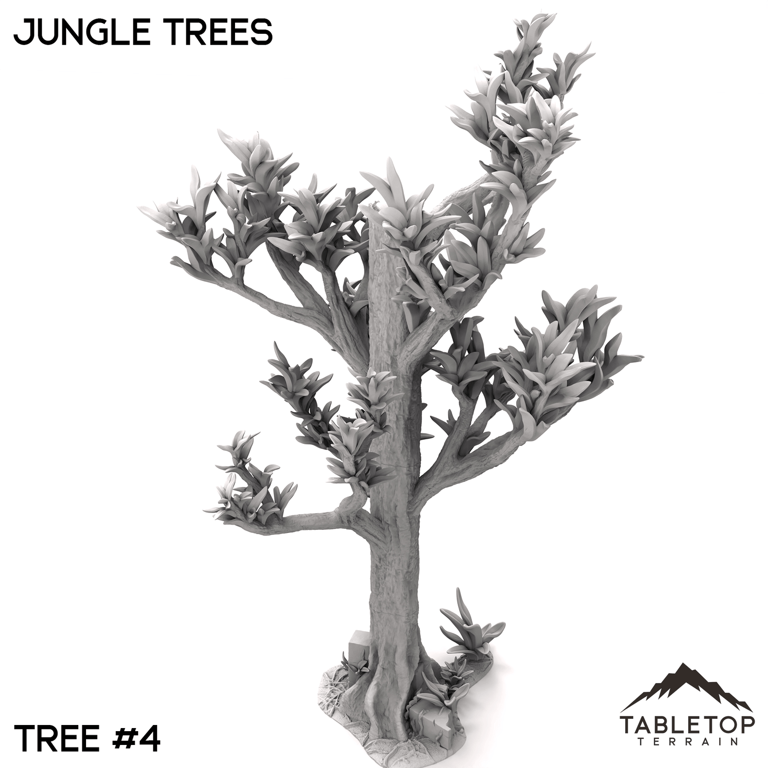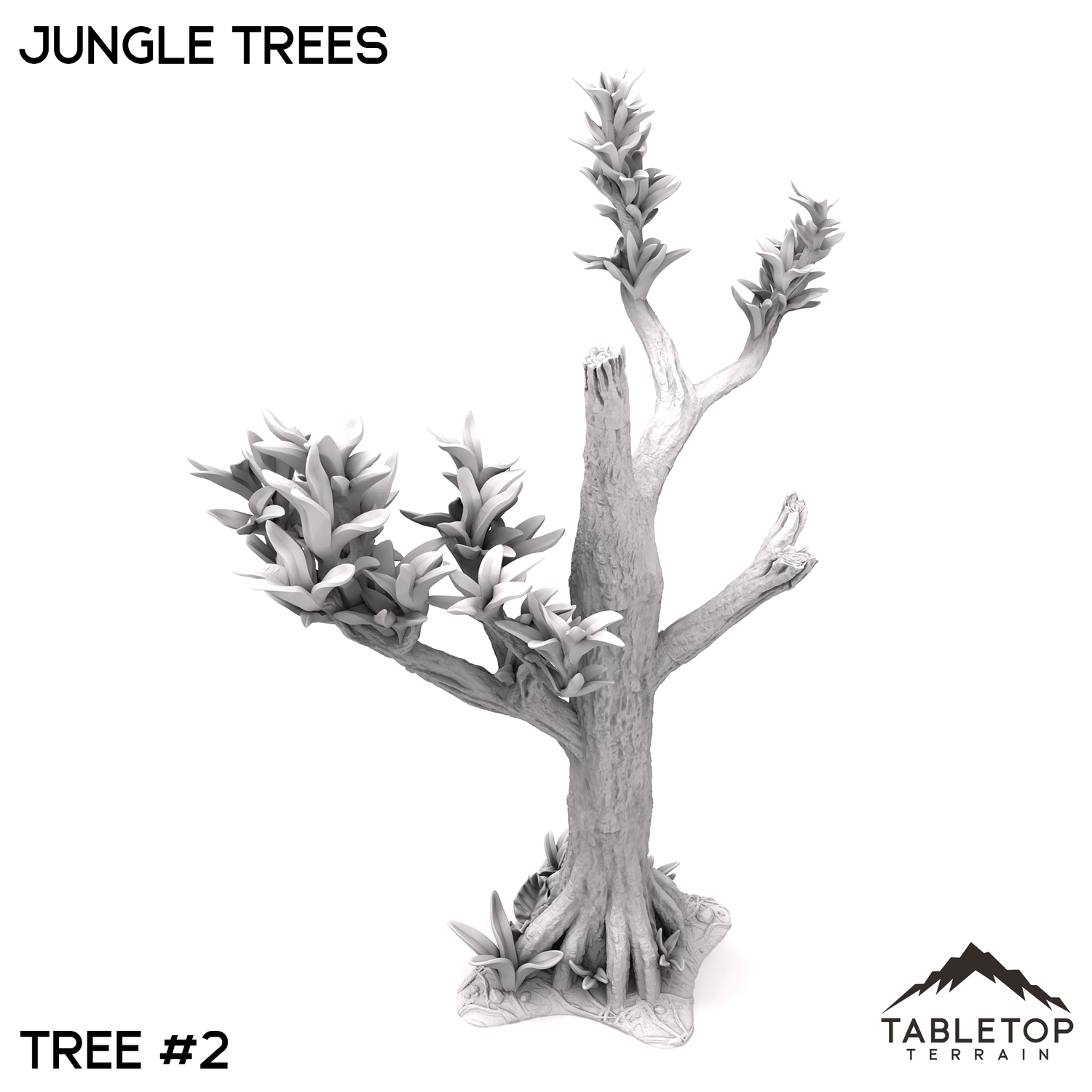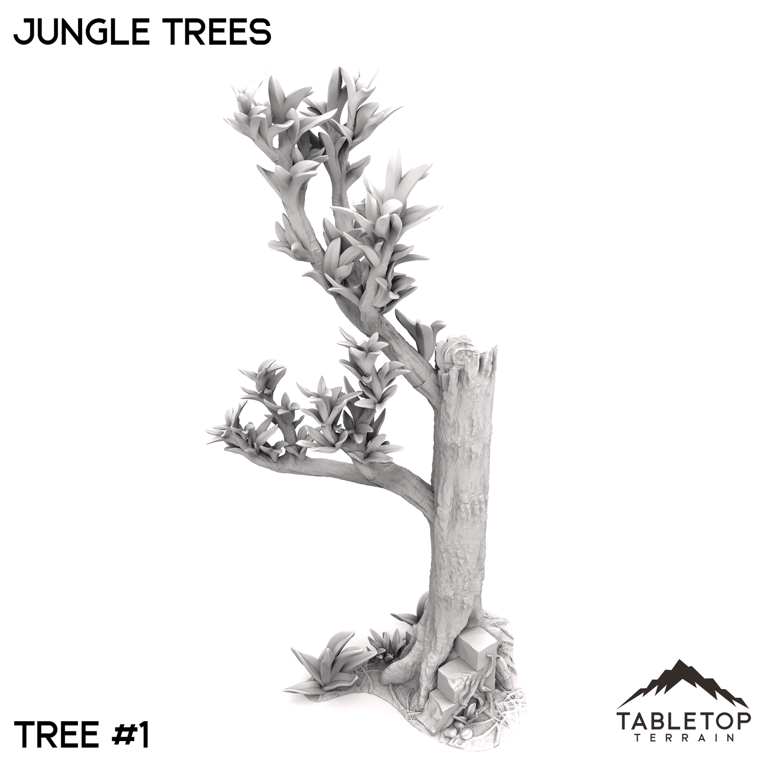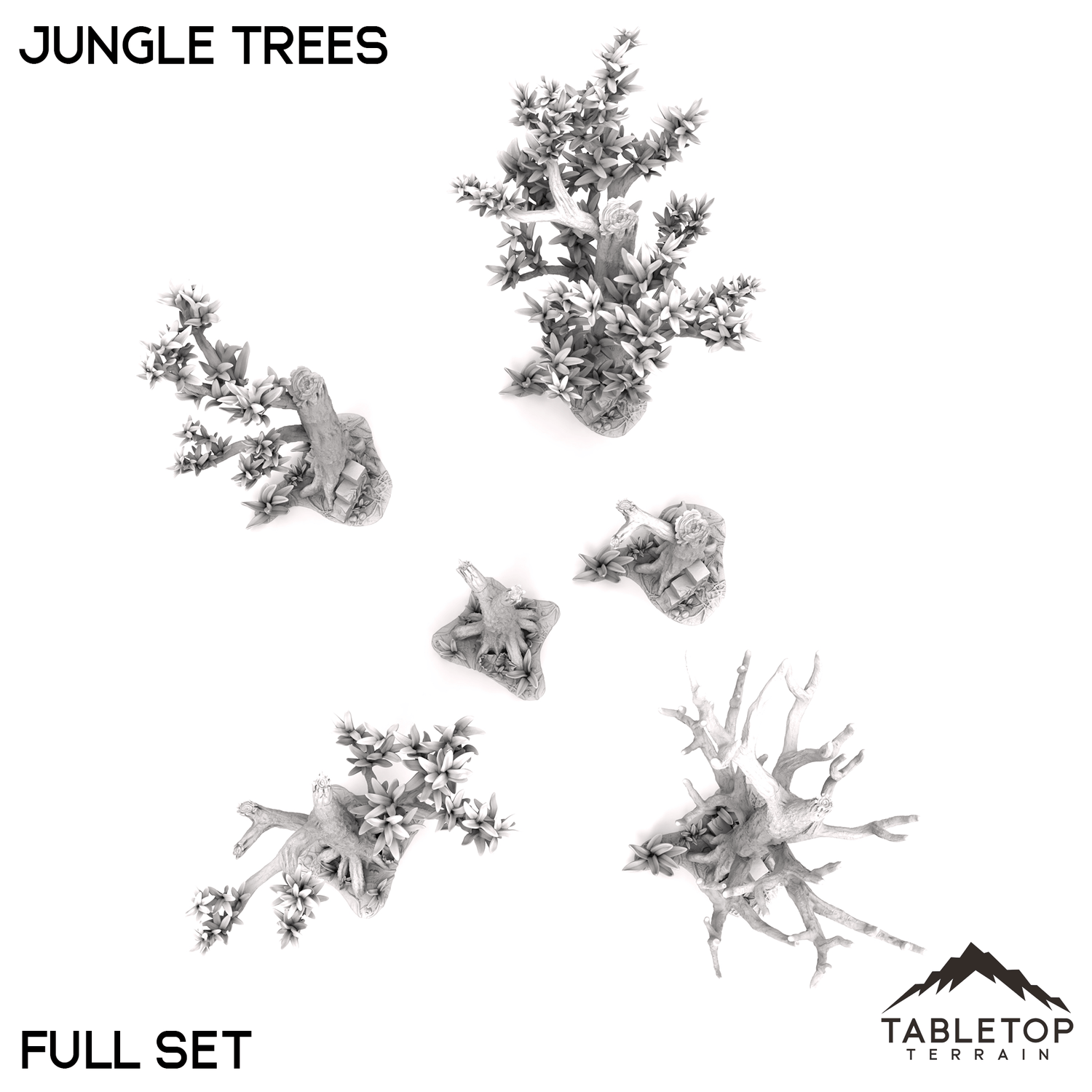 Towering jungle trees stretch toward the sky, their broad leaves casting deep shadows across the forest floor. Some stand tall and vibrant, while others are long-dead, their bare branches twisting eerily in the air. Buy each one individually or the set at a discount