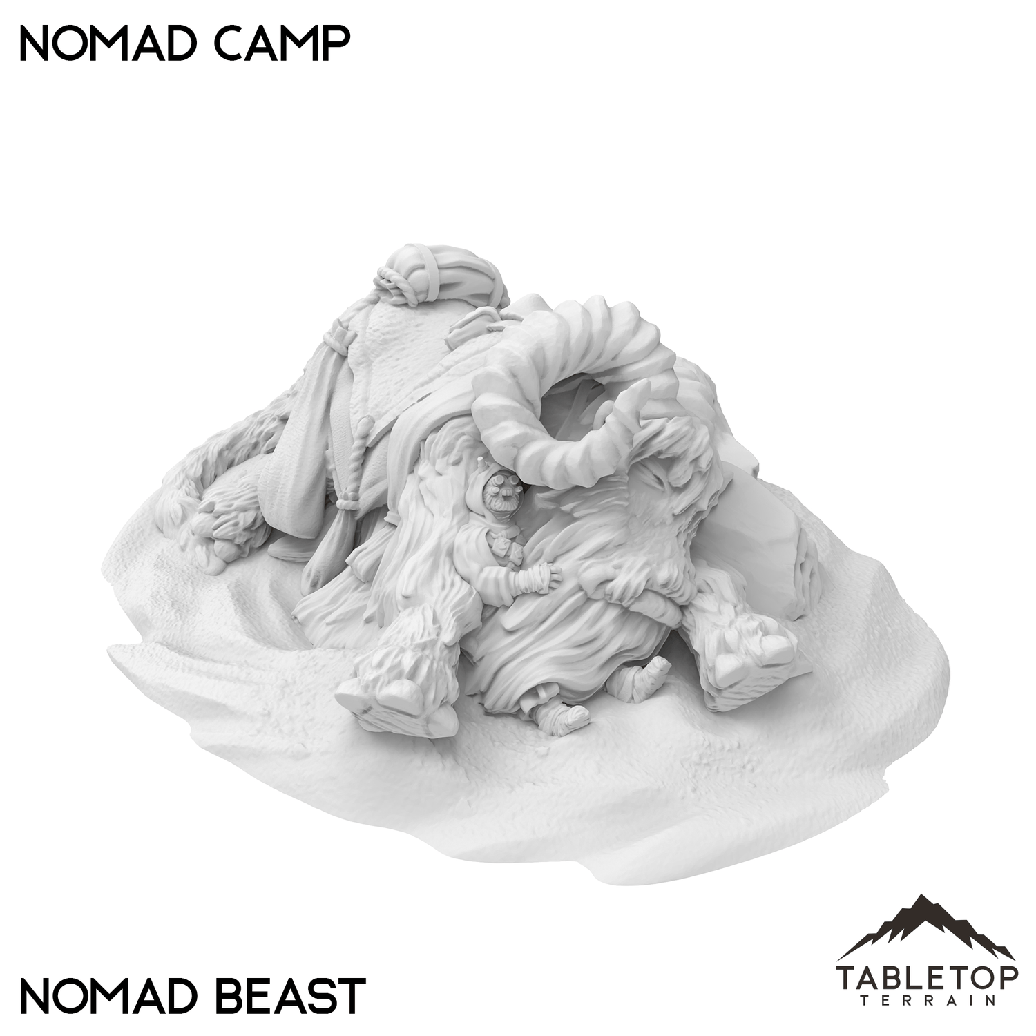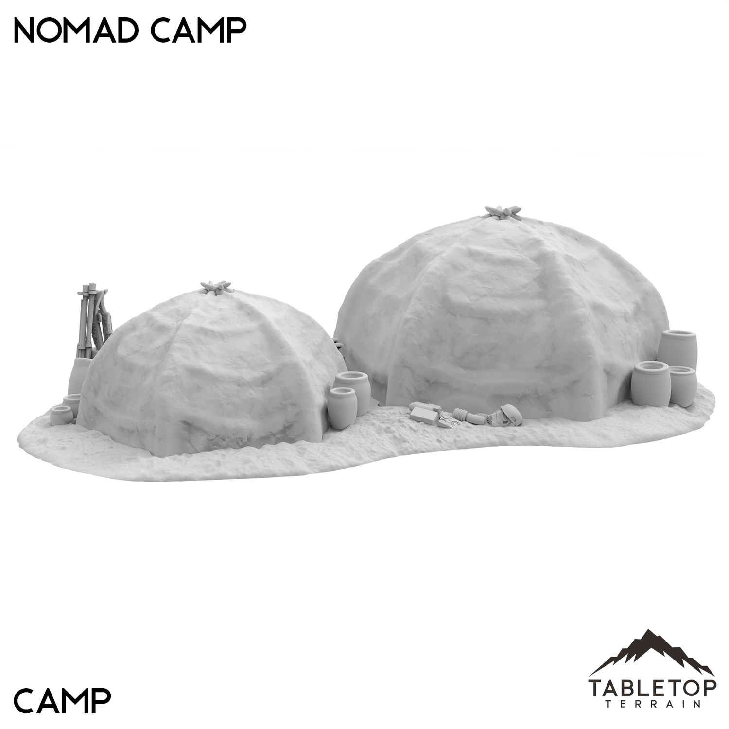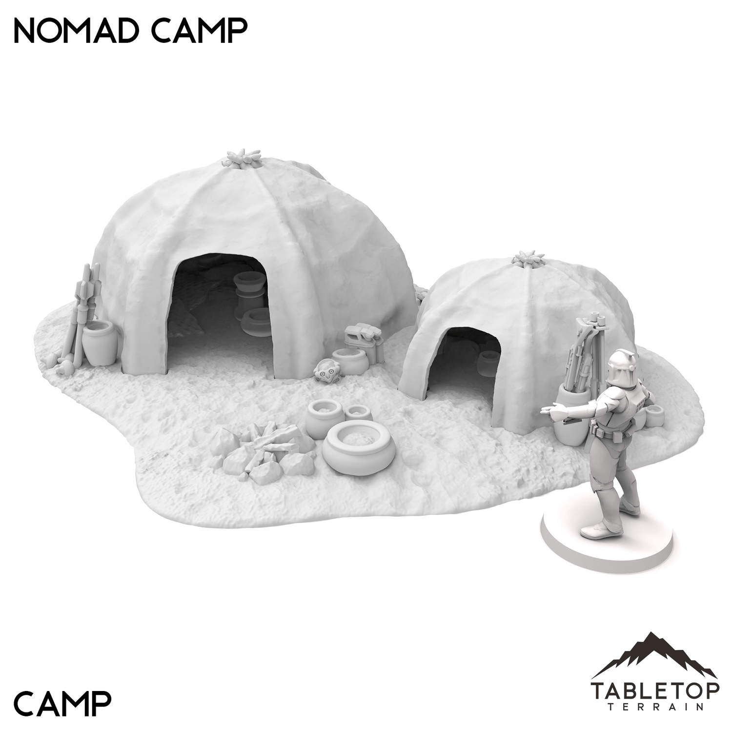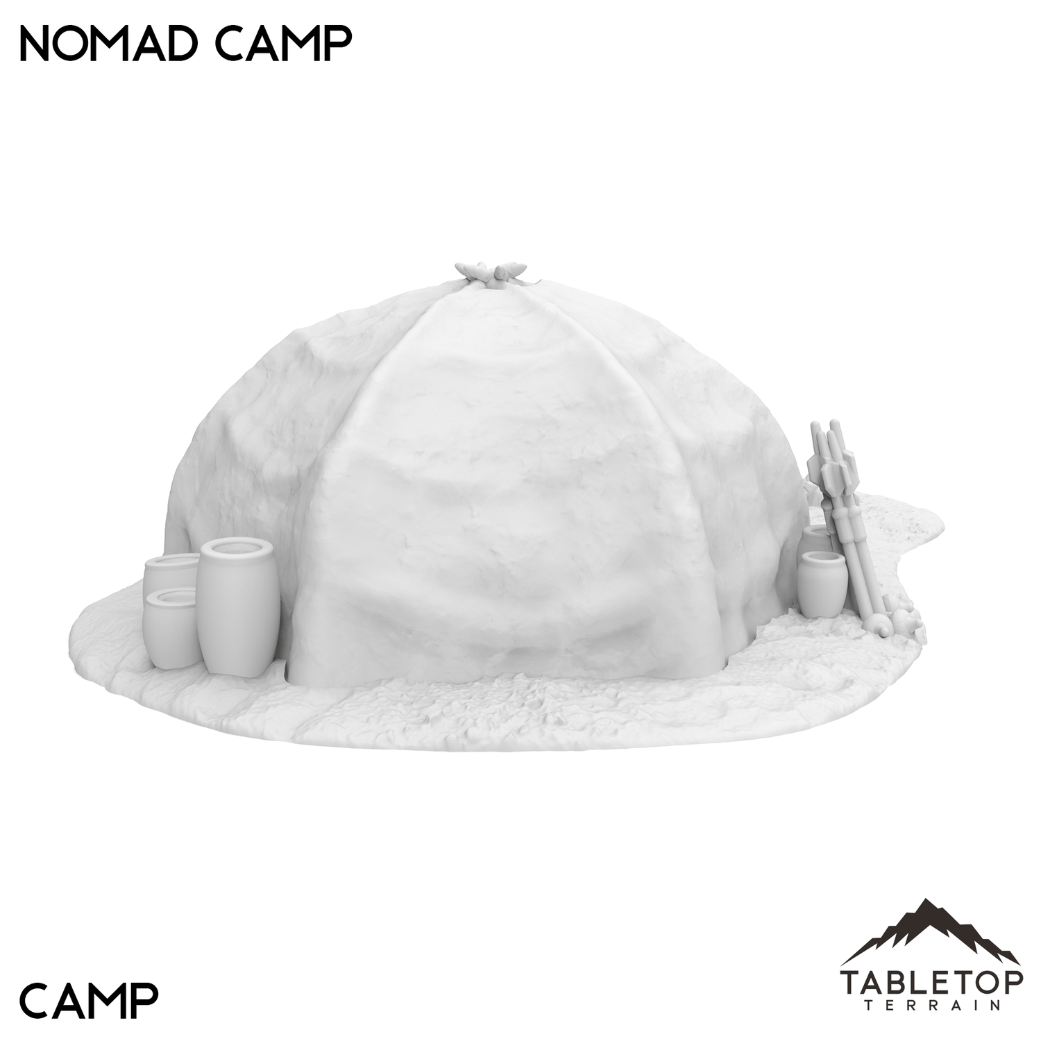 Two weathered tents stand in the desert, surrounded by scattered supplies and simple tools. This nomad camp, with its basic shelters and sparse provisions, offers a temporary home amid the shifting sands. Inside, the flicker of a fire keeps the night at bay as travelers rest before their next journey while nomad beasts are resting outside after a day of travel.