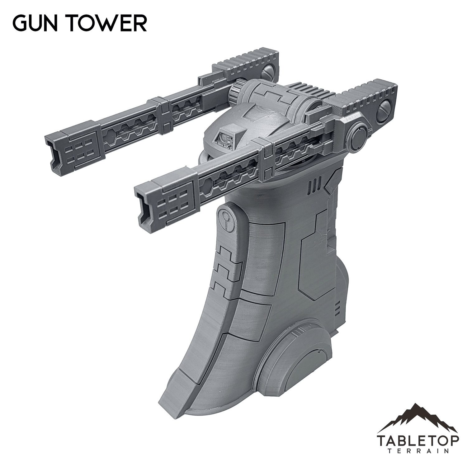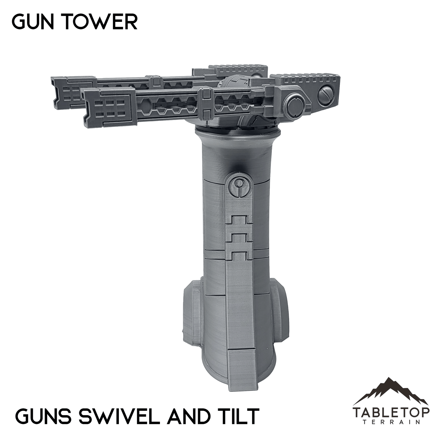 The Greater Good Gun Tower is a tall standing articulating gun. The two cannons can both swivel and tilt as needed. It is assembled with Openlock clips, allowing for easy assembly without glue.