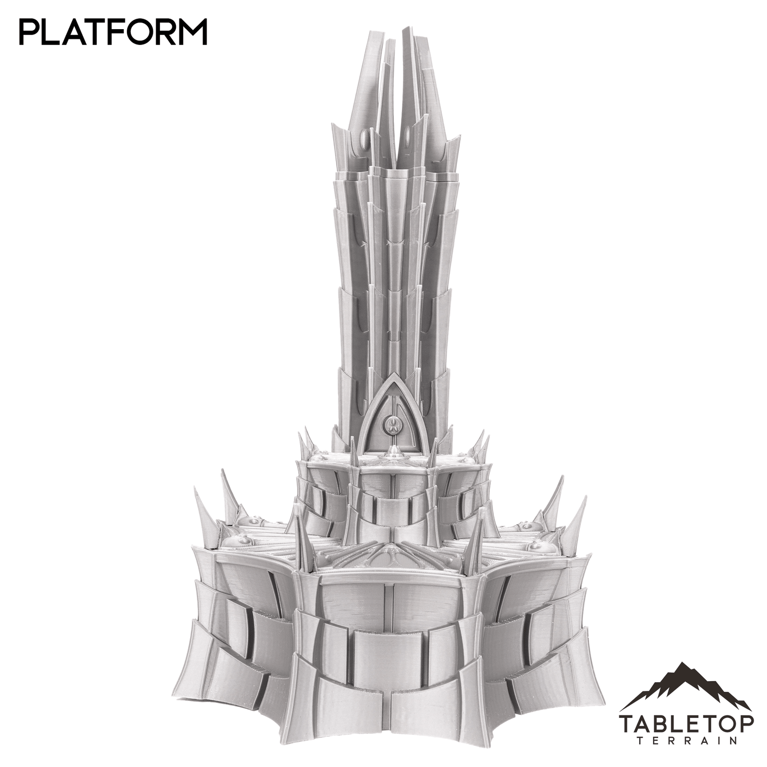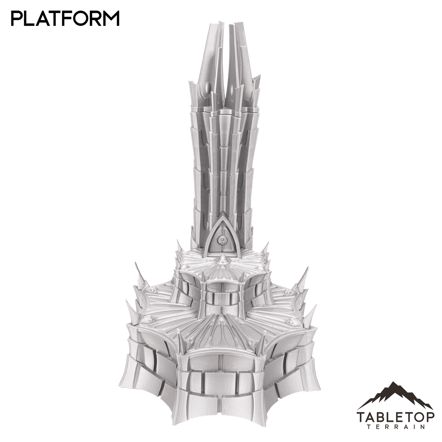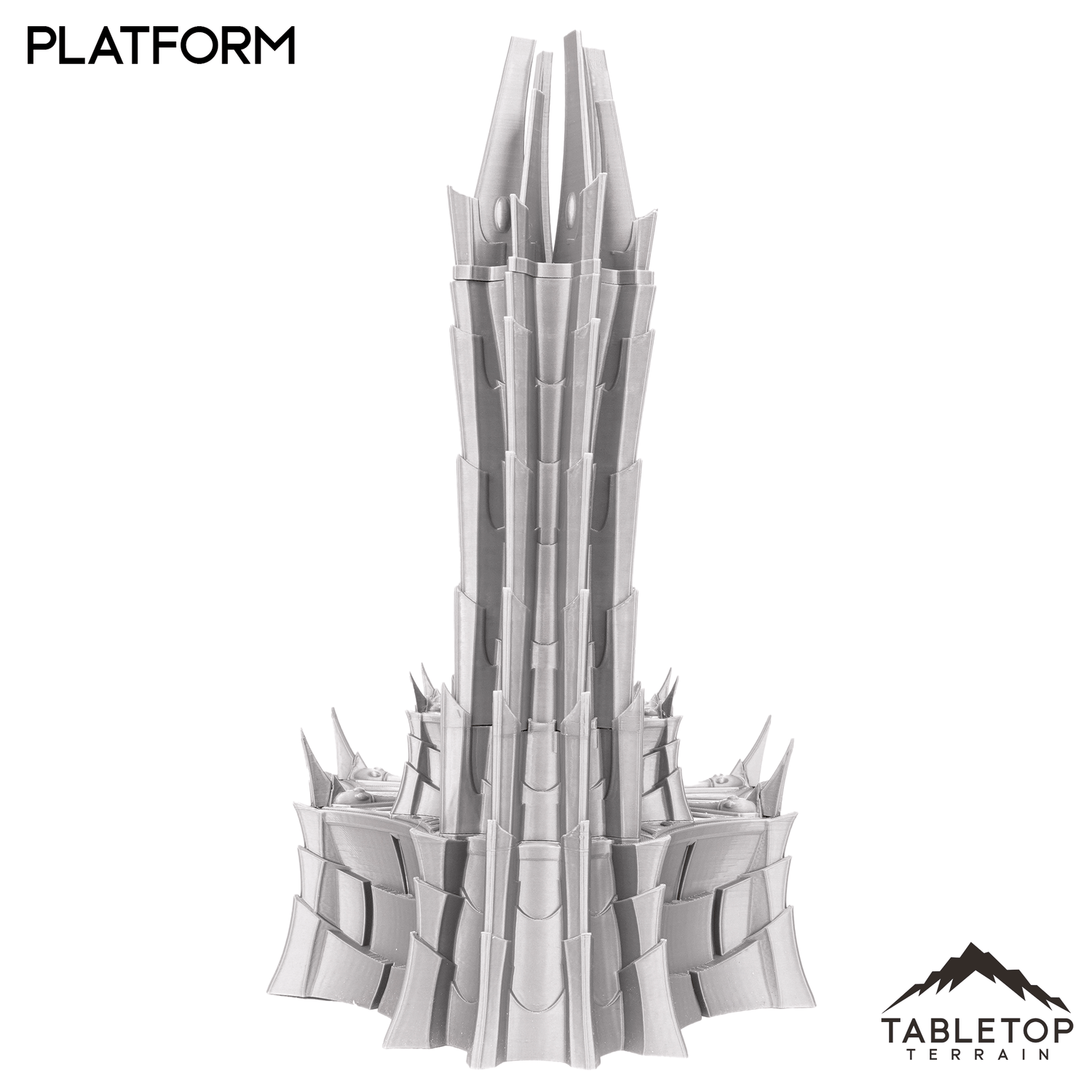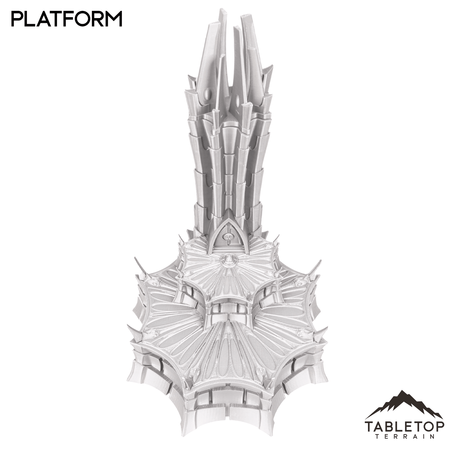 The Platform is a tall raised platform with spire attached to it. It has an upper door and two elevated positions for minis to stand. It's a part of The Dark City of Irazar, a sci-fi Space Elves themed table set, perfect for science fiction or fantasy wargaming. It would work great for a fantasy elven city. Compatible with Space Elves models, this set would work great for thematic Space Elves terrain.