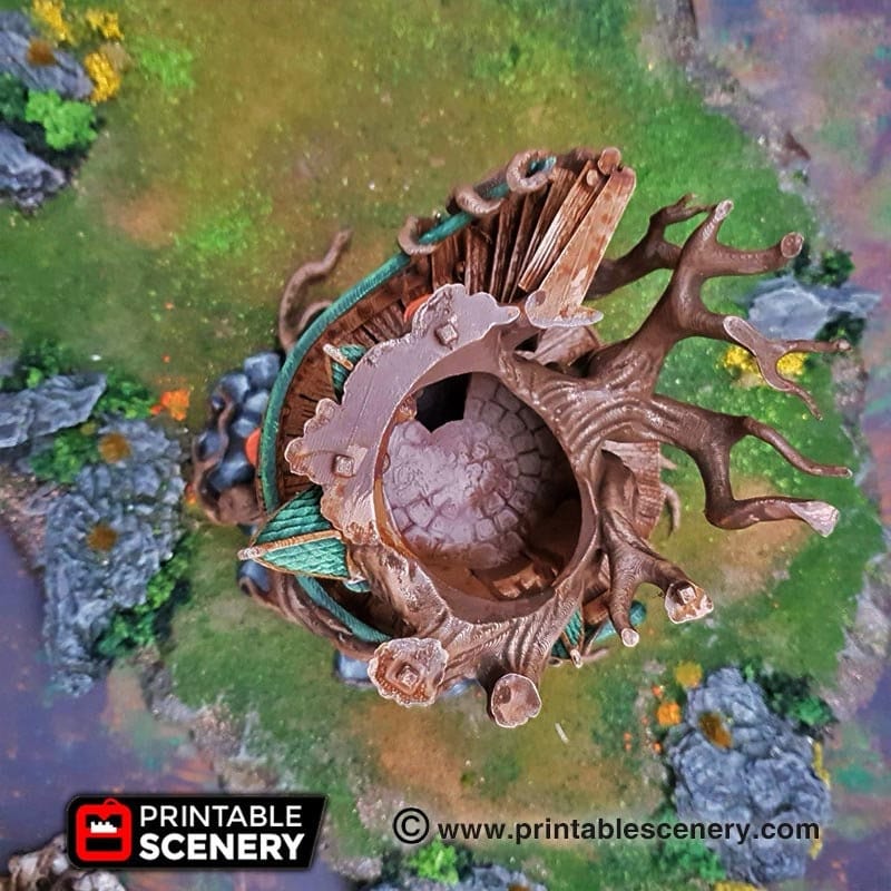 The Gloomwood Treehouse is a multi-story, Elven styled treehouse. It features removable roofs and two functioning doors. The treehouse would be perfect for fantasy games such as Dungeons and Dragons (DND), Age of Sigmar (AoS), Pathfinder, Frostgrave, or Conquest.