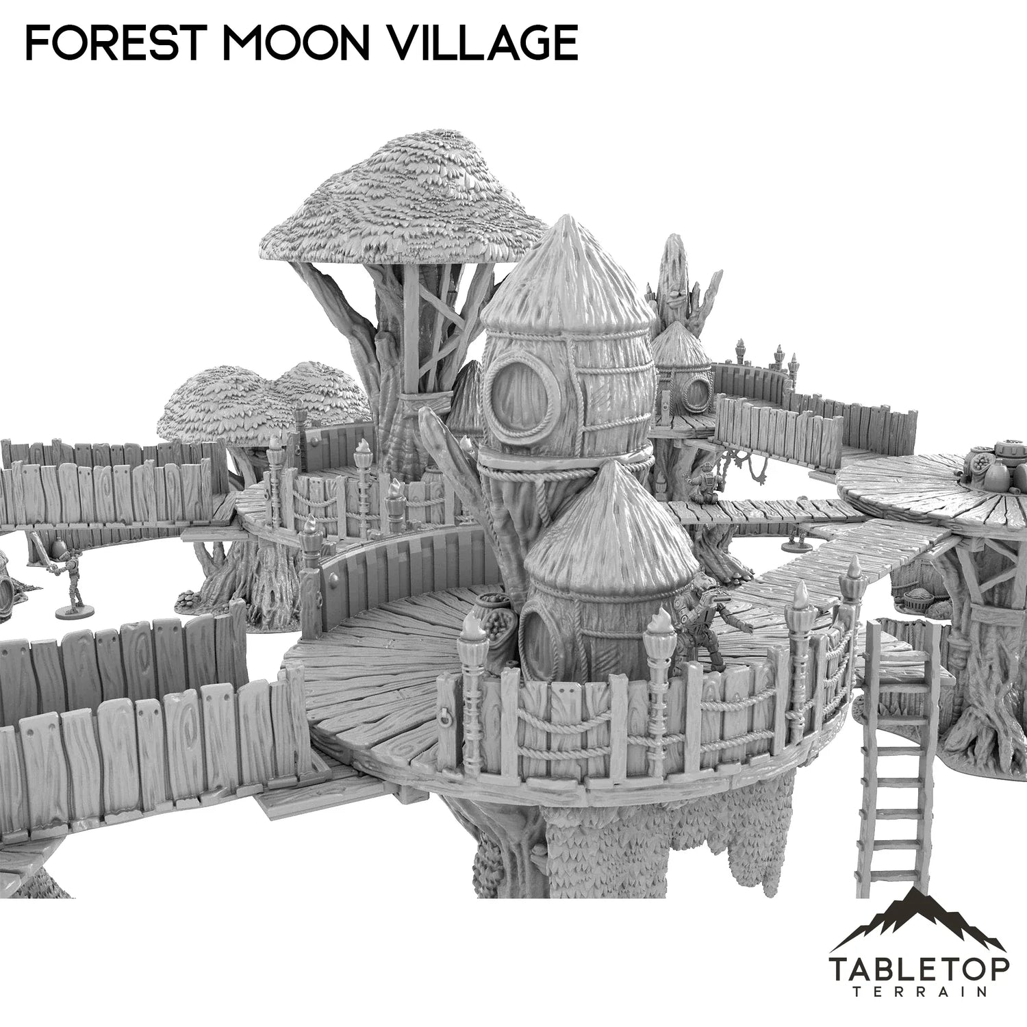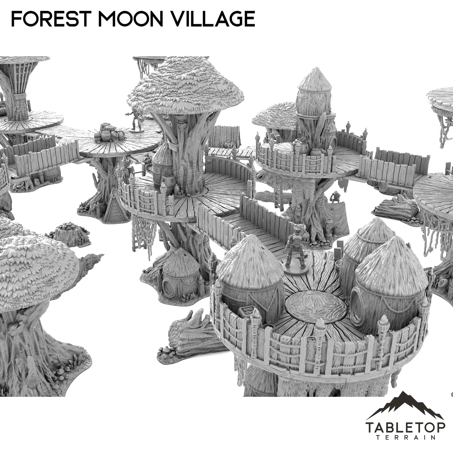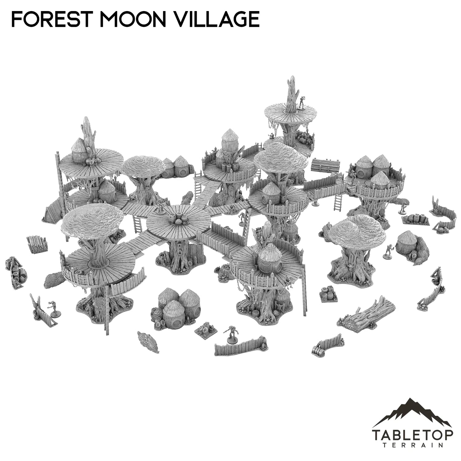 The Forest Moon Village set allows you to create a modular treetop town with variable height trees, various size platforms, walkways, ladders, and stairs. Highly detailed and scaled to 28-40mm miniatures size, this bundle looks amazing on the tabletop and can be changed to countless different table variations.
