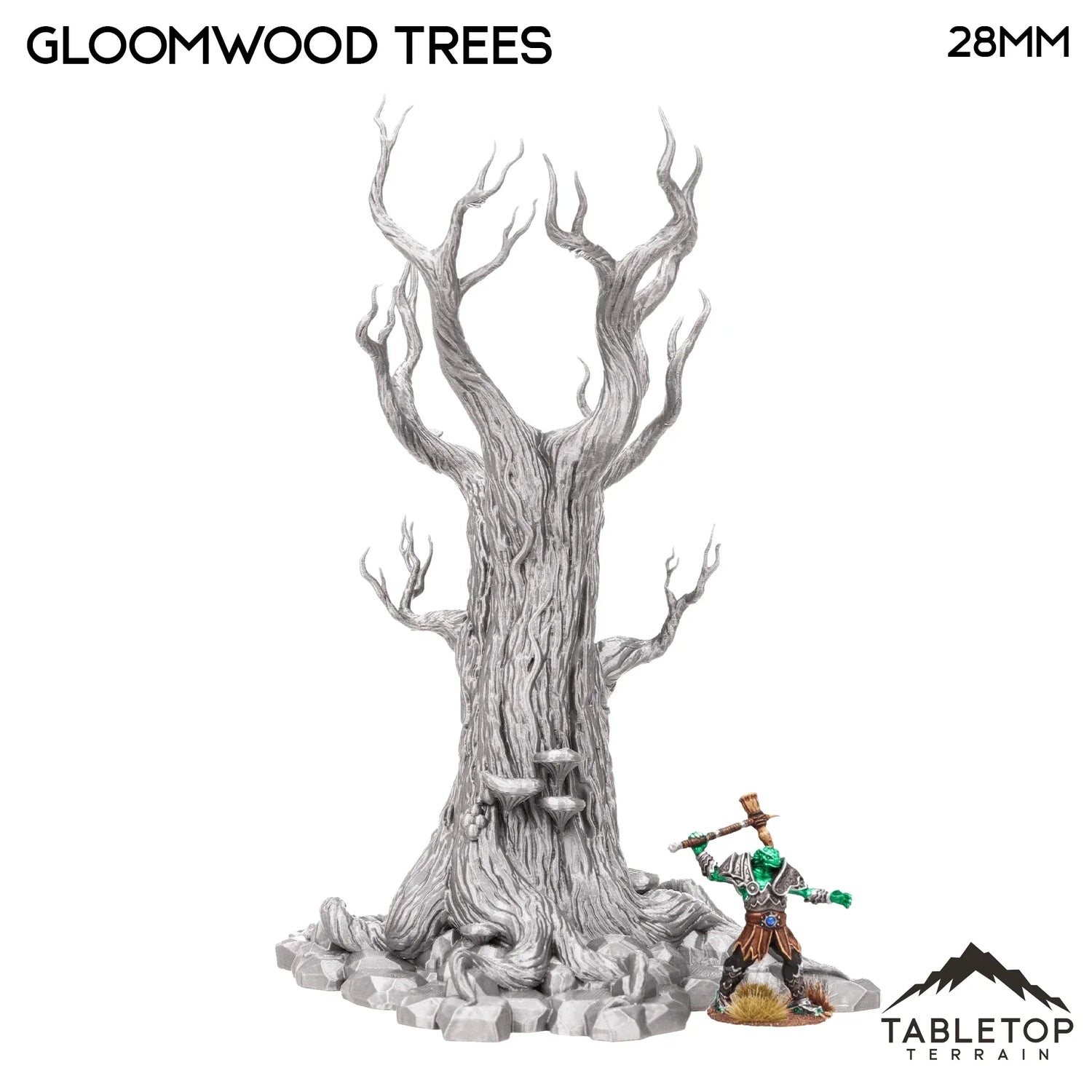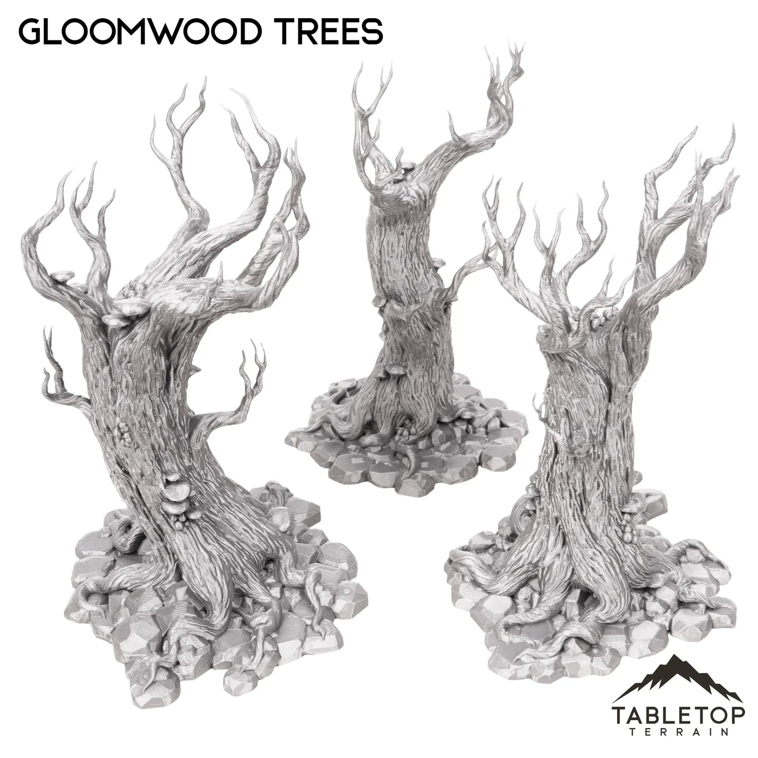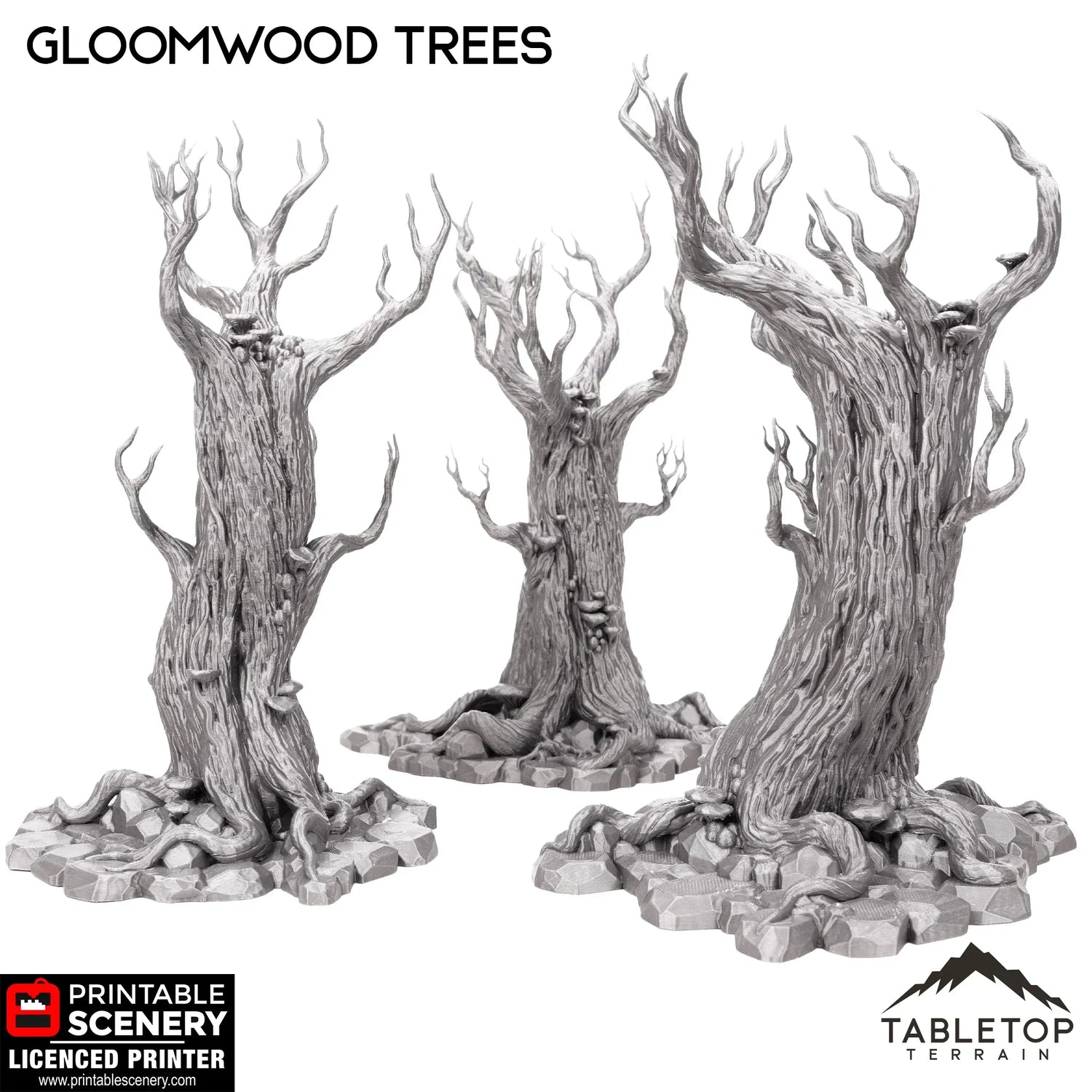 The Gloomwood trees are a set of 3 fantasy trees with mushrooms on them. The branches stick out and create a thematic elven tree. The trees would be perfect for a variety of different fantasy games.