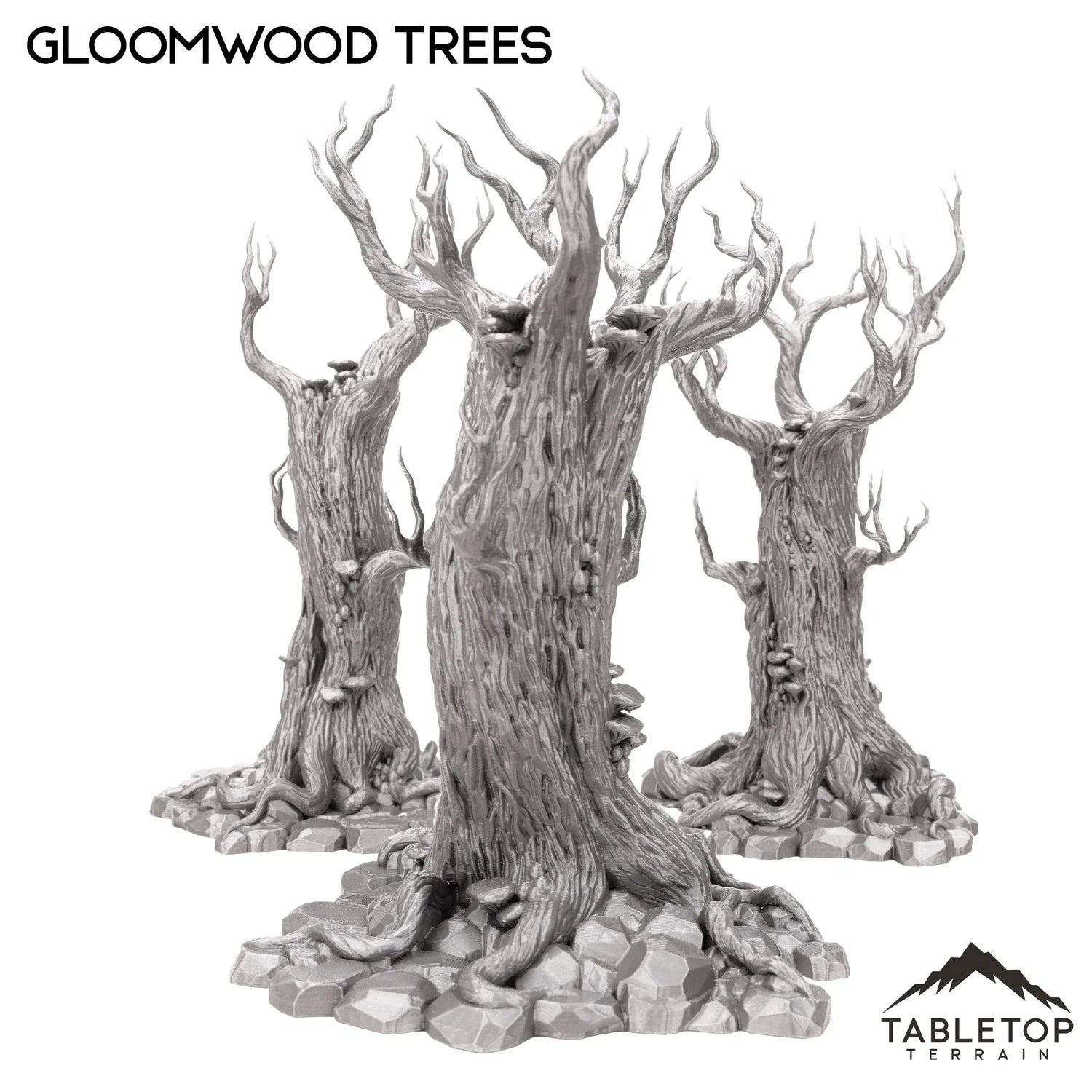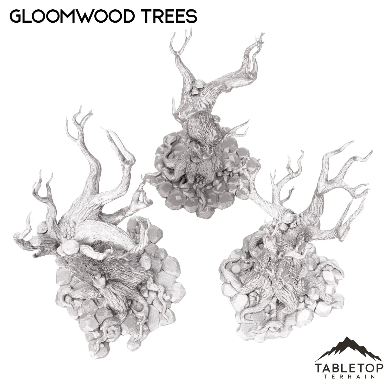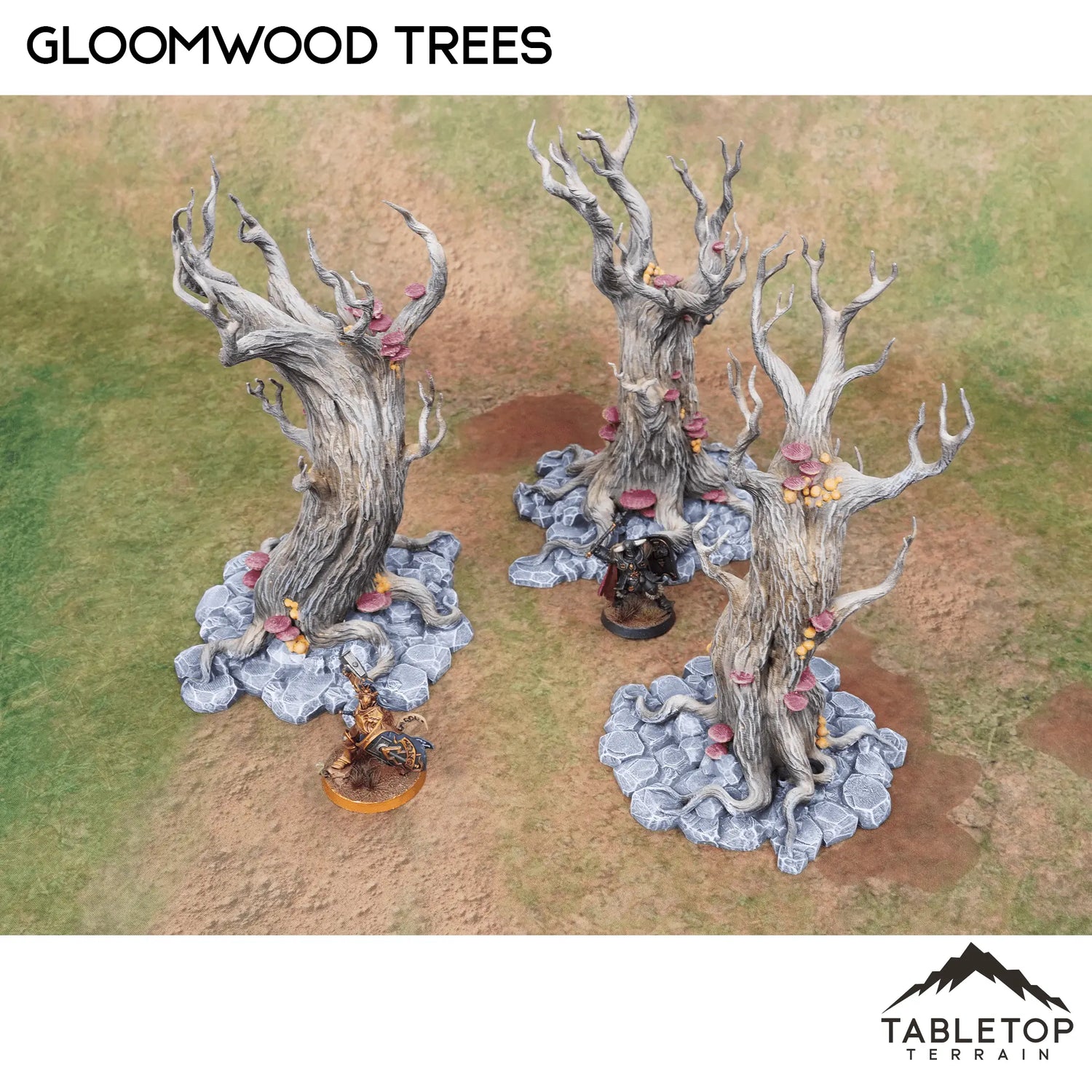The Gloomwood trees are a set of 3 fantasy trees with mushrooms on them. The branches stick out and create a thematic elven tree. The trees would be perfect for a variety of different fantasy games.