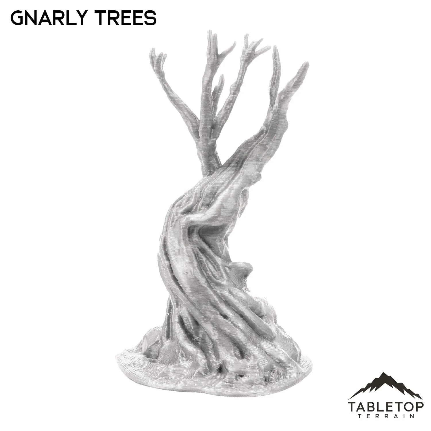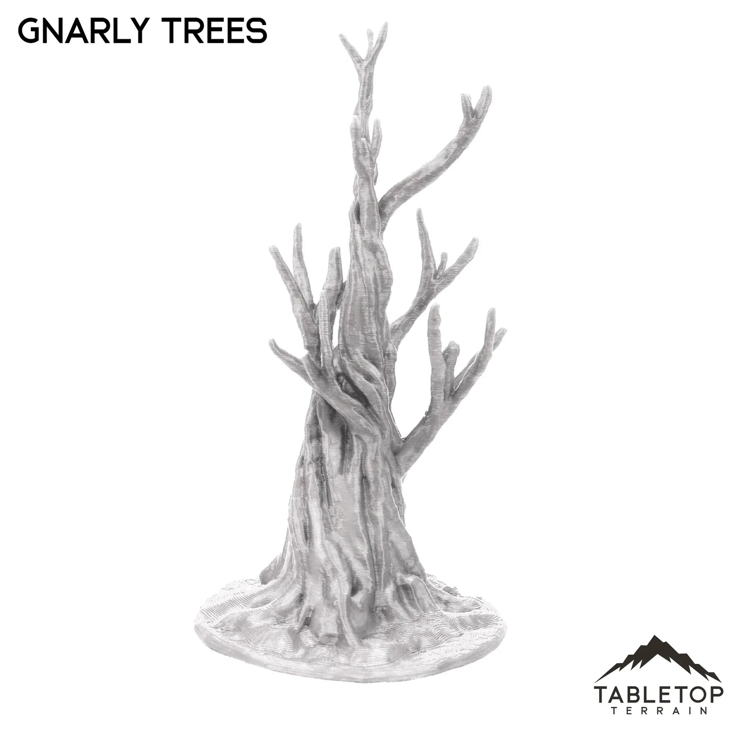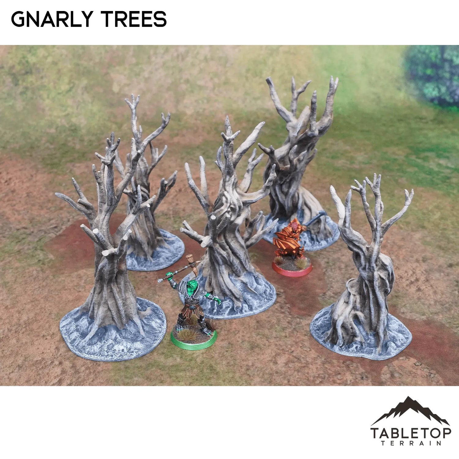 The Gnarly Trees set is a collection of 5 twisting, gnarled, ancient trees. The set comes without foliage for a more menacing look, but the trees are designed to work with foliage if needed. The set of trees will work nicely by itself as a small grove, or could be used to add depth and variety to other sets combined together. This set could work great for any fantasy or historical RPG/wargame.