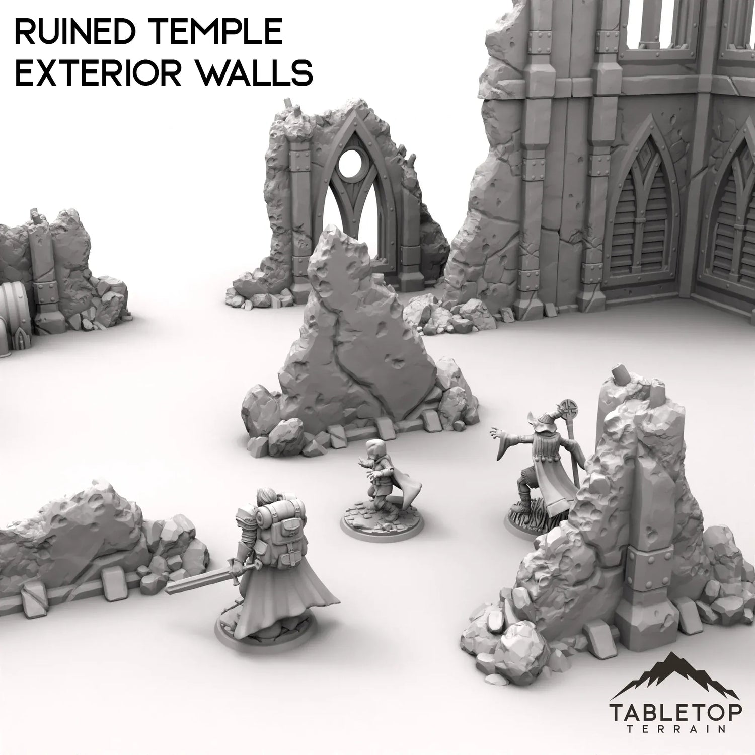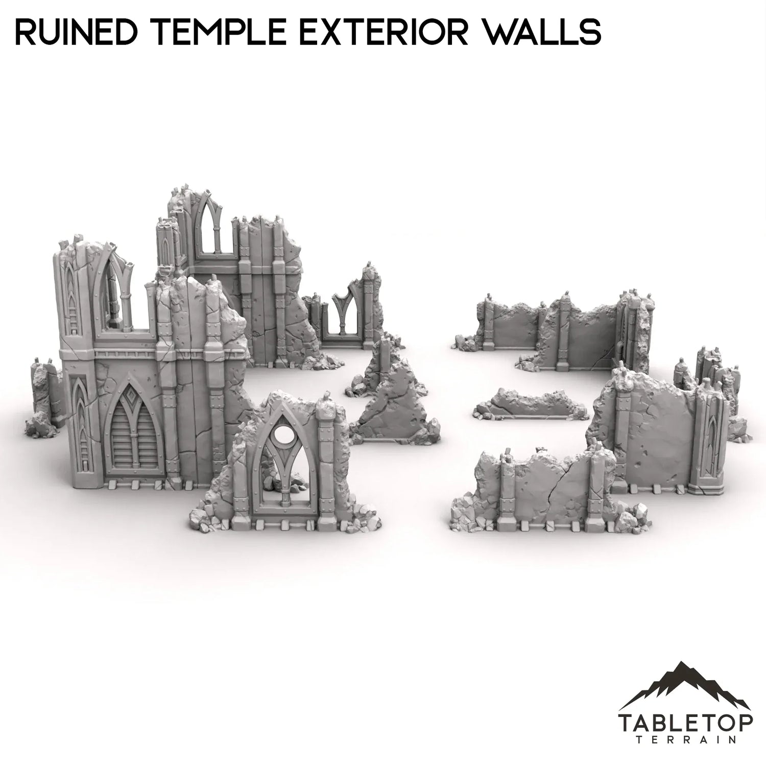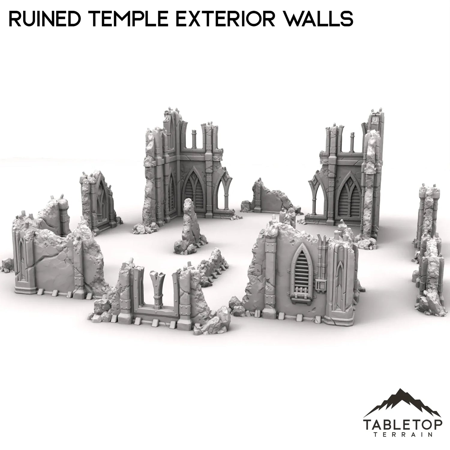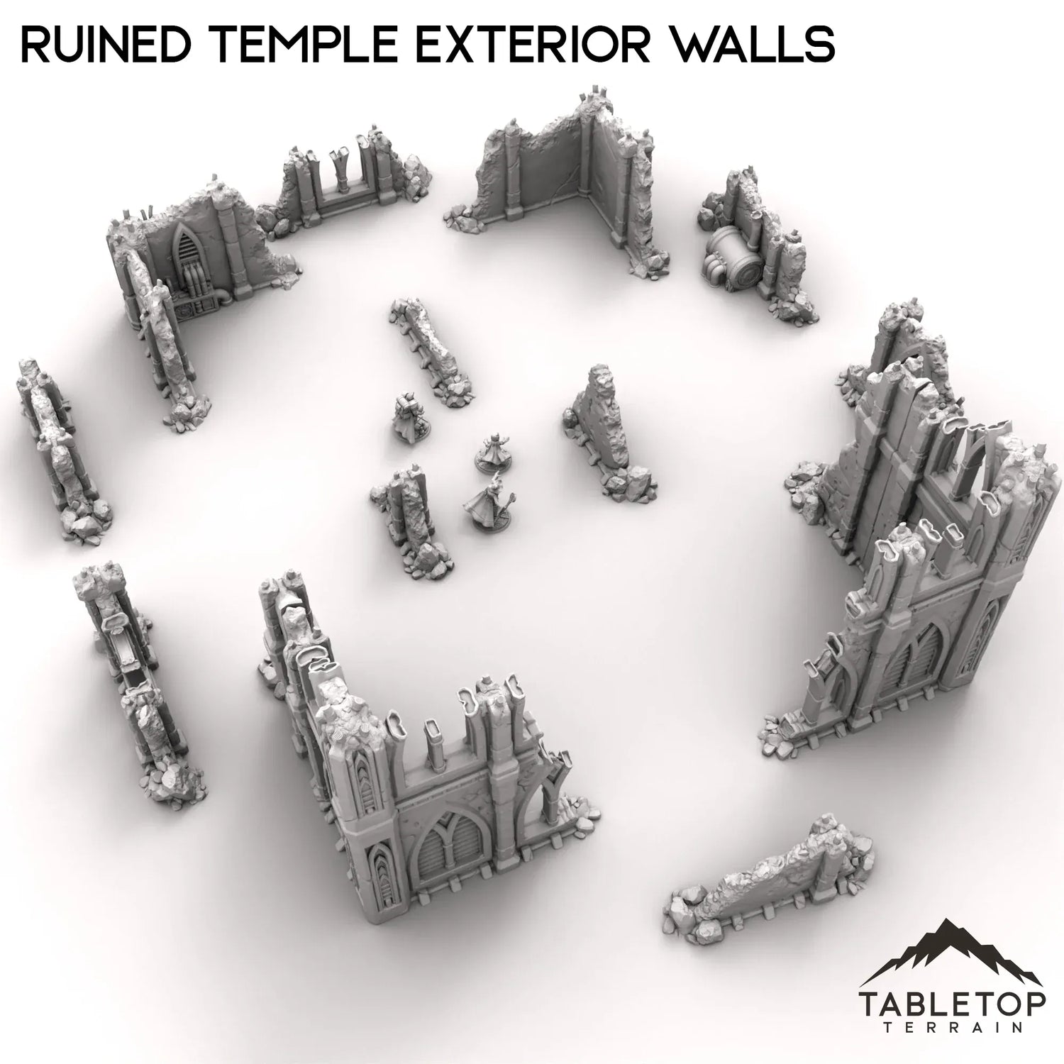 This set features the broken ruins of a large building. With multiple corner ruins and wall fragments to build your perfect terrain