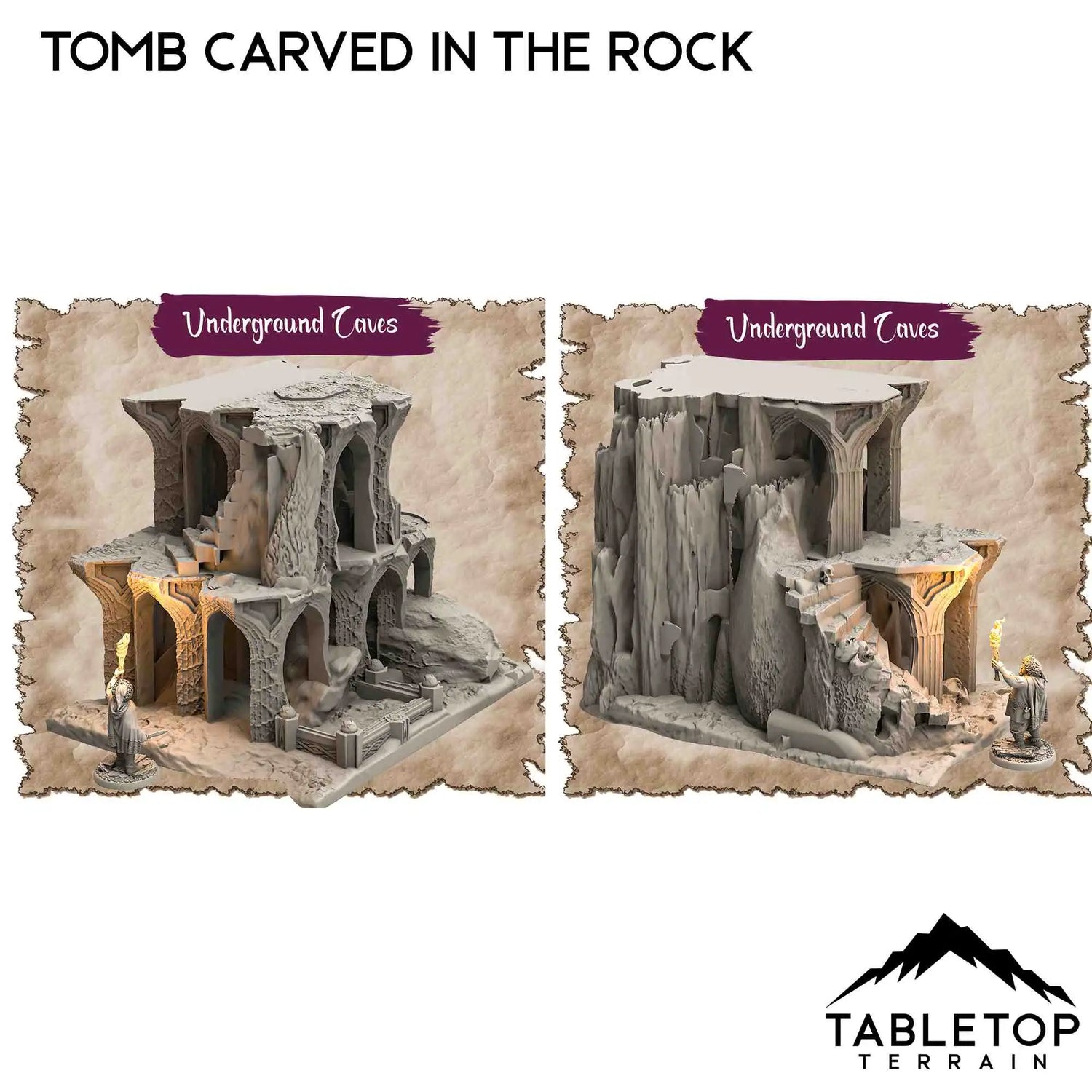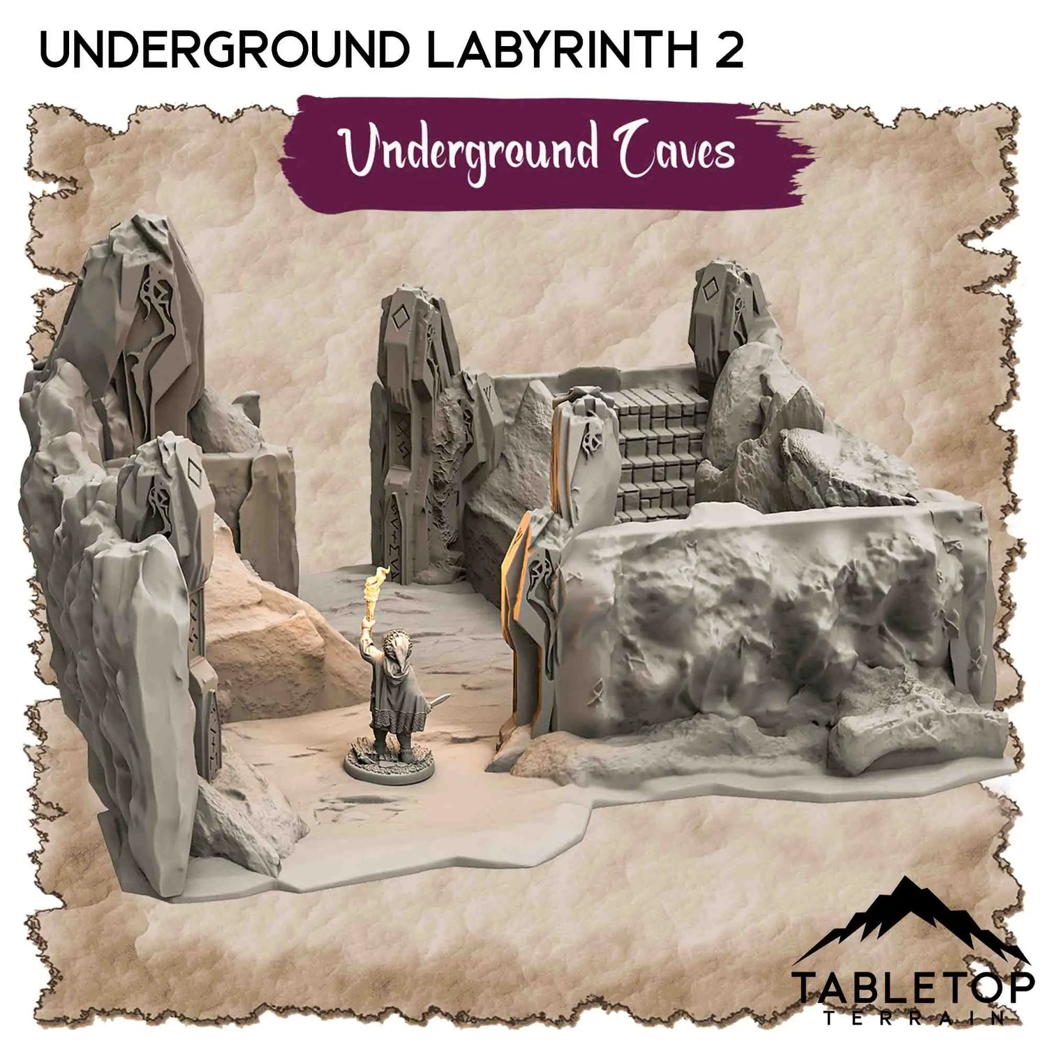 Underground Caves is a set of thematic dungeon terrain. Comprised of multiple pieces, you can create a full dungeon experience from this set. It combines fantasy and science fiction details, making it great for either genre.