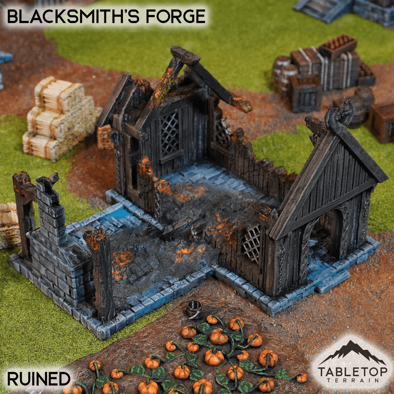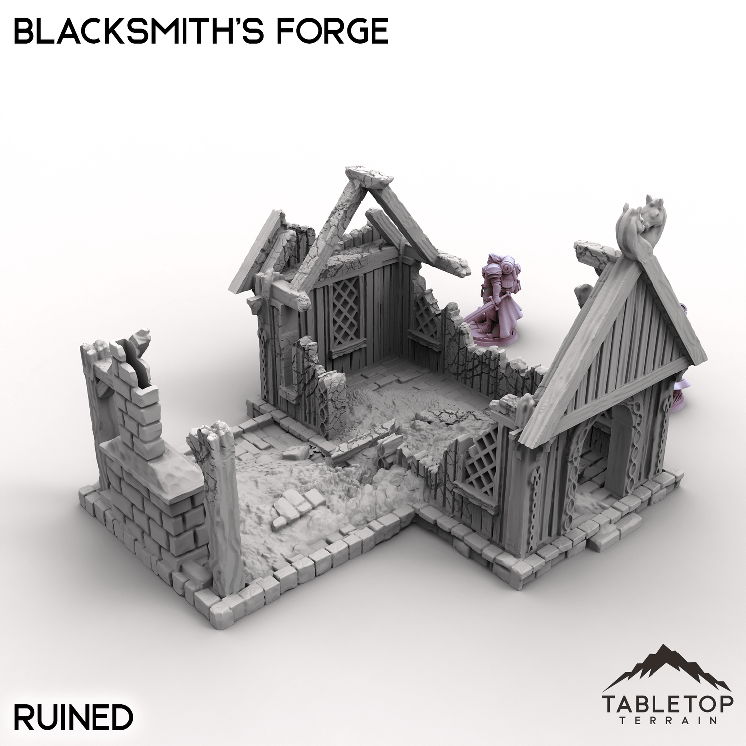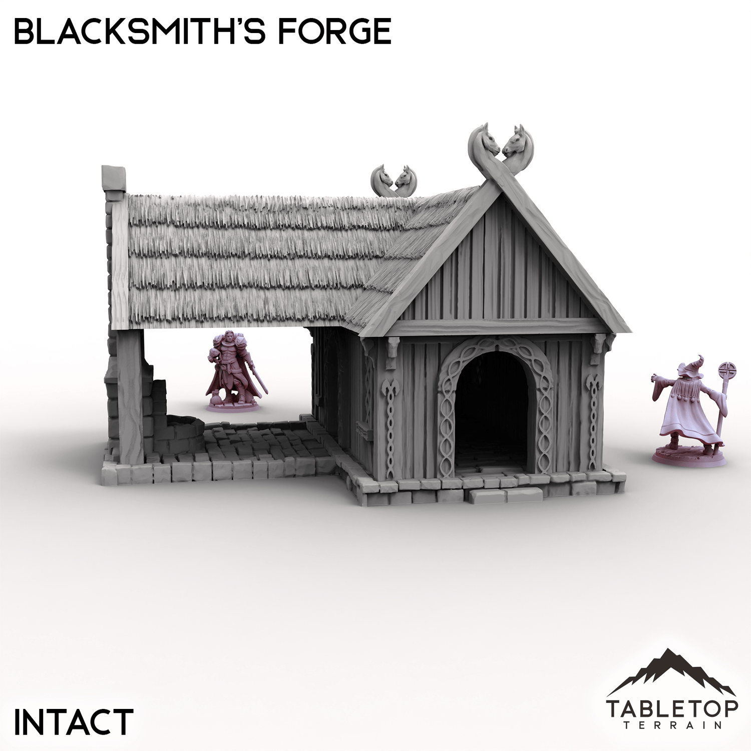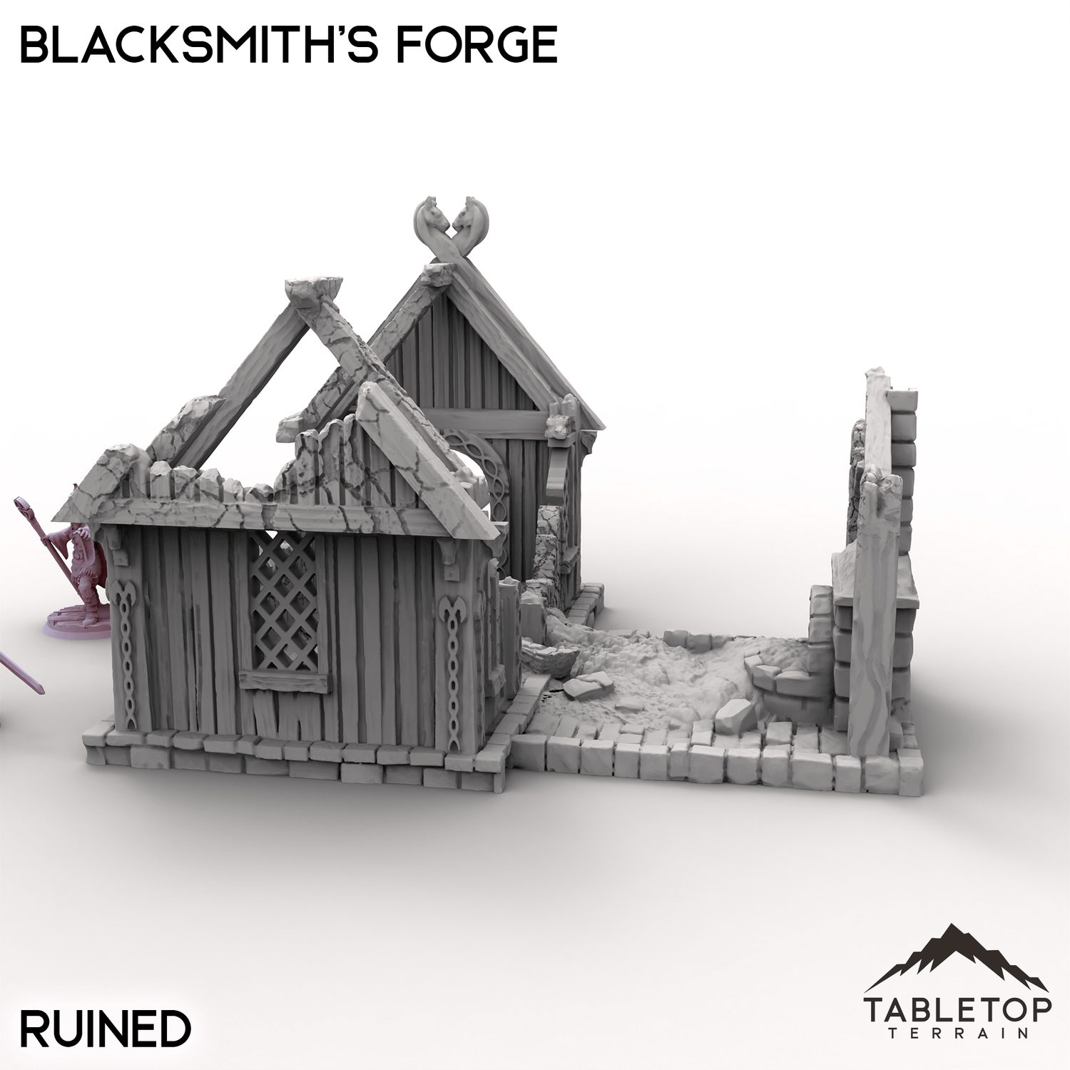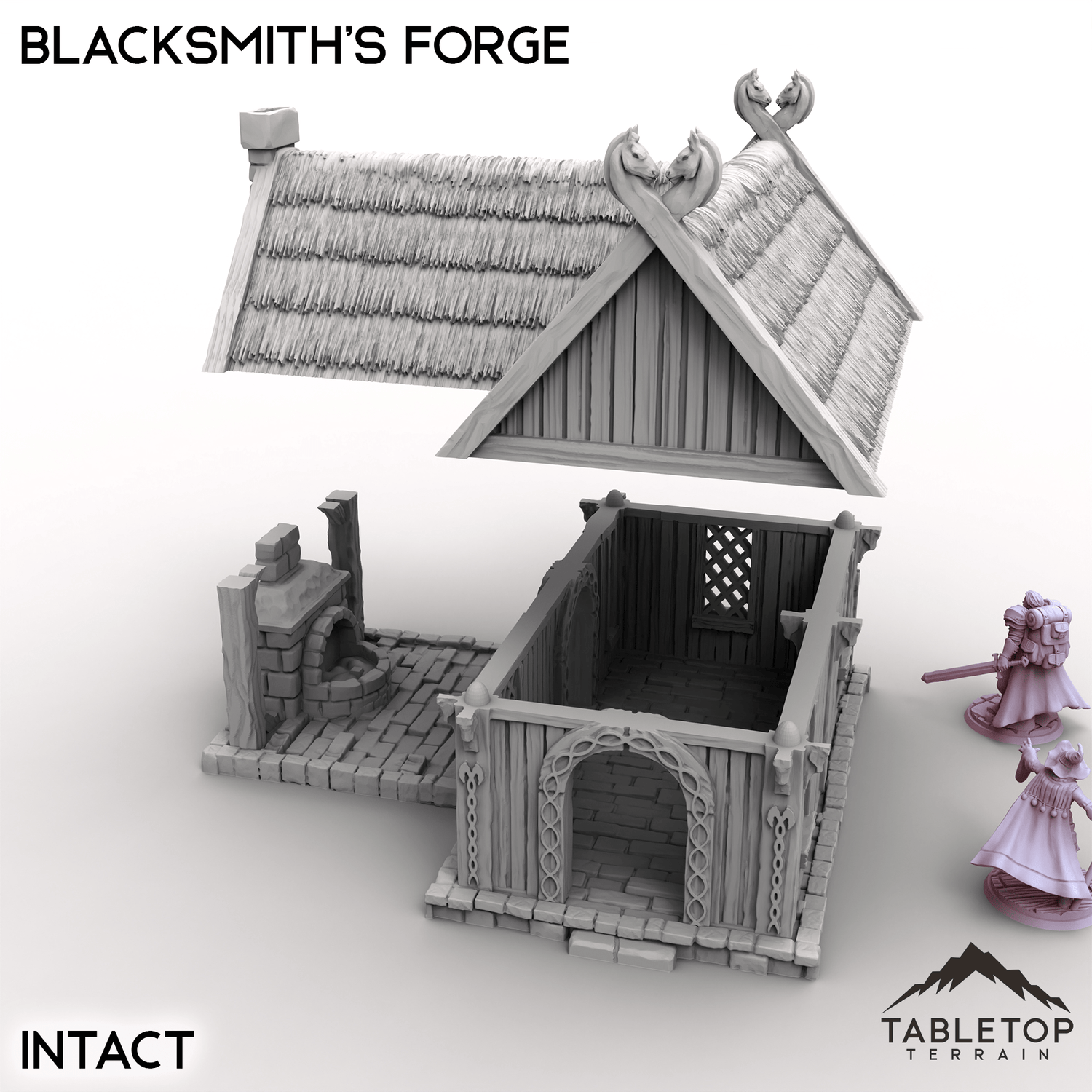 The Blacksmith's Forge stands ready to craft whatever is needed for the people of Saxonia. The forge comes in either an Intact version, or a Ruined version, and features a detailed forge for smithing. The building is 3 stories tall, with detailed texturing both inside and out, with plenty of room to fit minis inside while in use. We recommend using this set with other buildings from the Kingdom of Saxonia set to mix and match a large town tabletop.