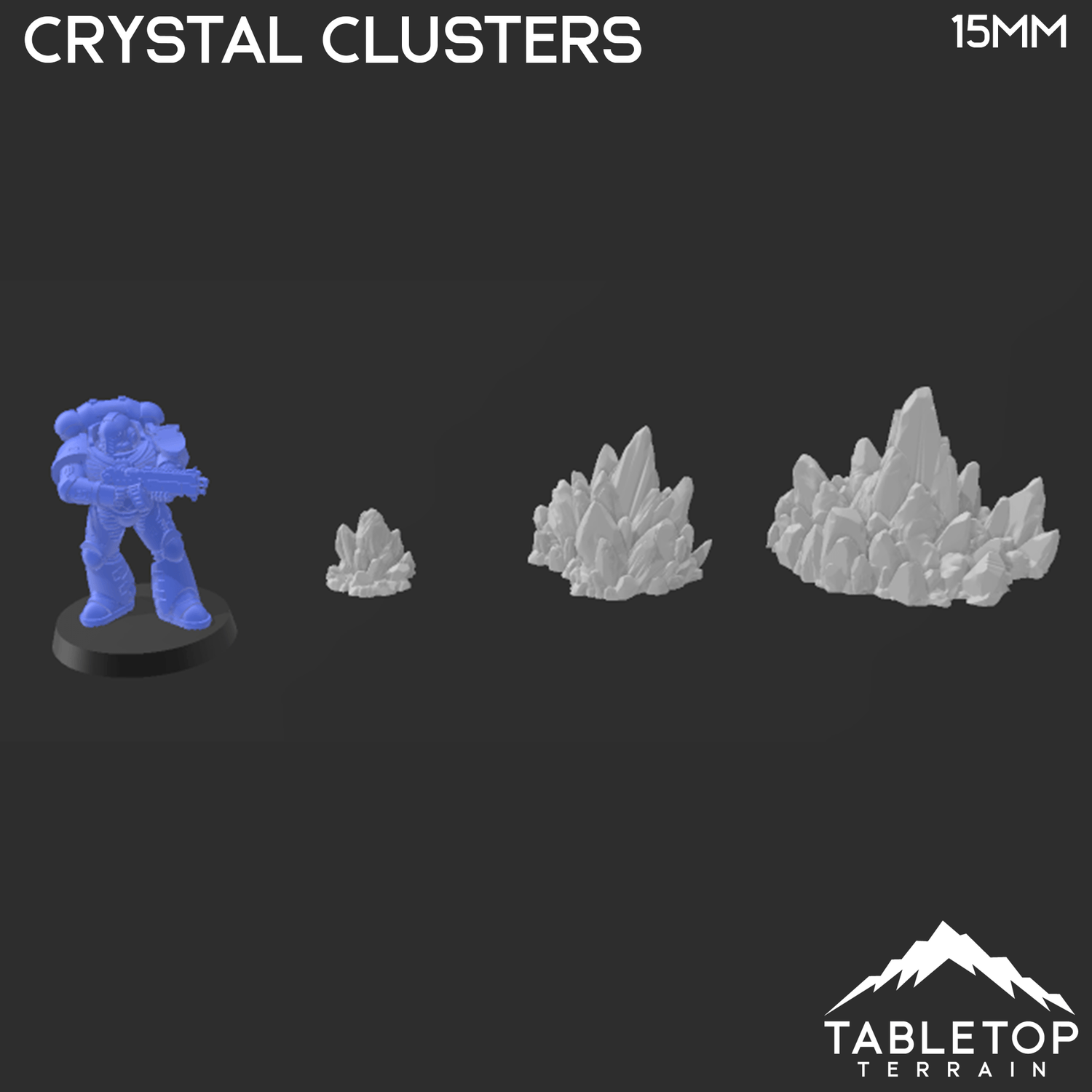 In 28mm scale, the largest crystal measures 80x80x51mm / 3.1x3.1x2.0 inches.