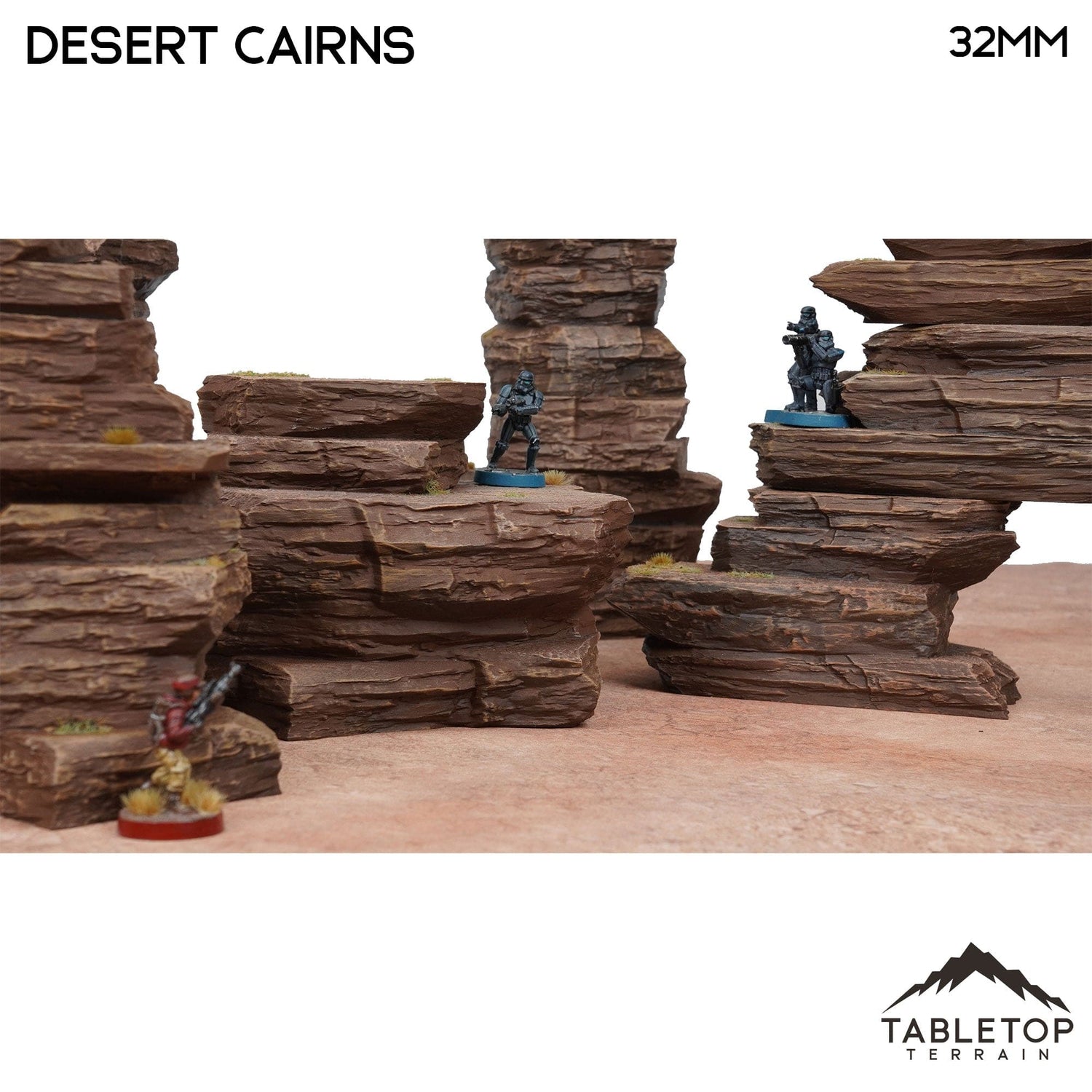 The Desert Cairns set features jagged rock formations rise from the barren landscape, their layered stone surfaces shaped by time and the elements. Towering spires, precarious stacks, and a weathered arch create treacherous obstacles on the battlefield, offering both vantage points and hidden paths. Ideal for harsh desert worlds or rugged badlands, this set brings a sense of desolation and danger to any tabletop.