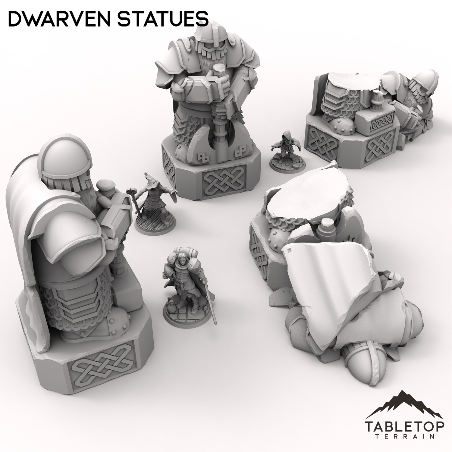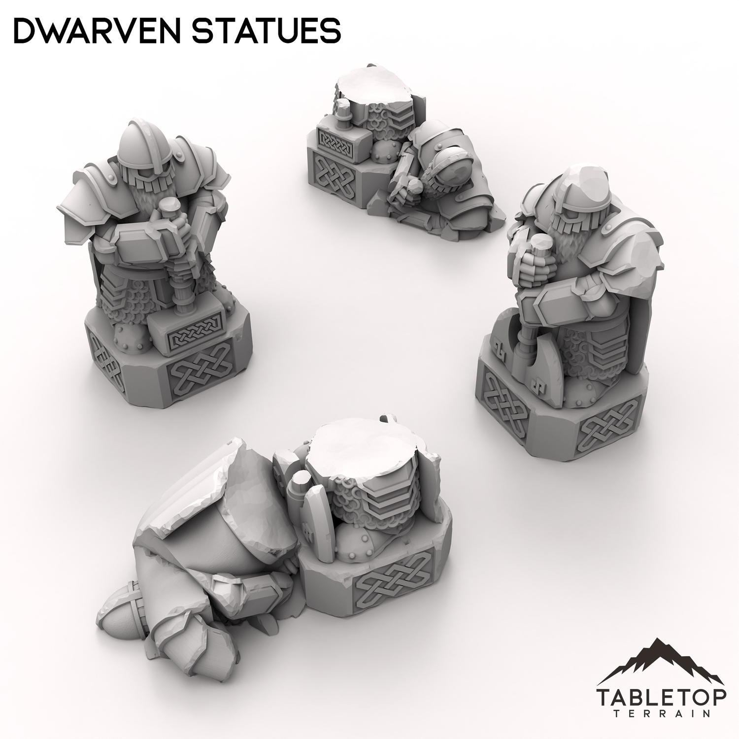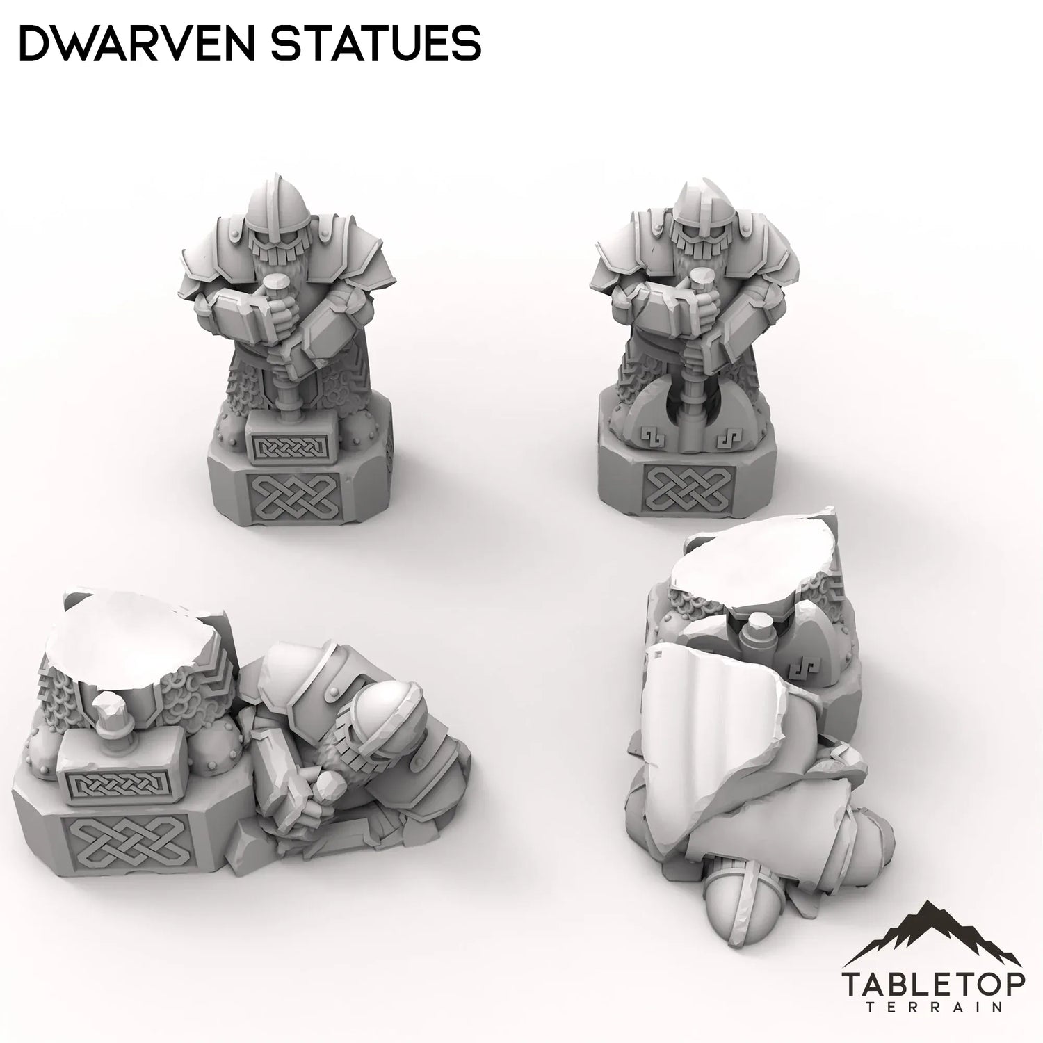 Four Dwarven statues to decorate your battlefields or RPGs. Two intact statues are accompanied by two destroyed versions.