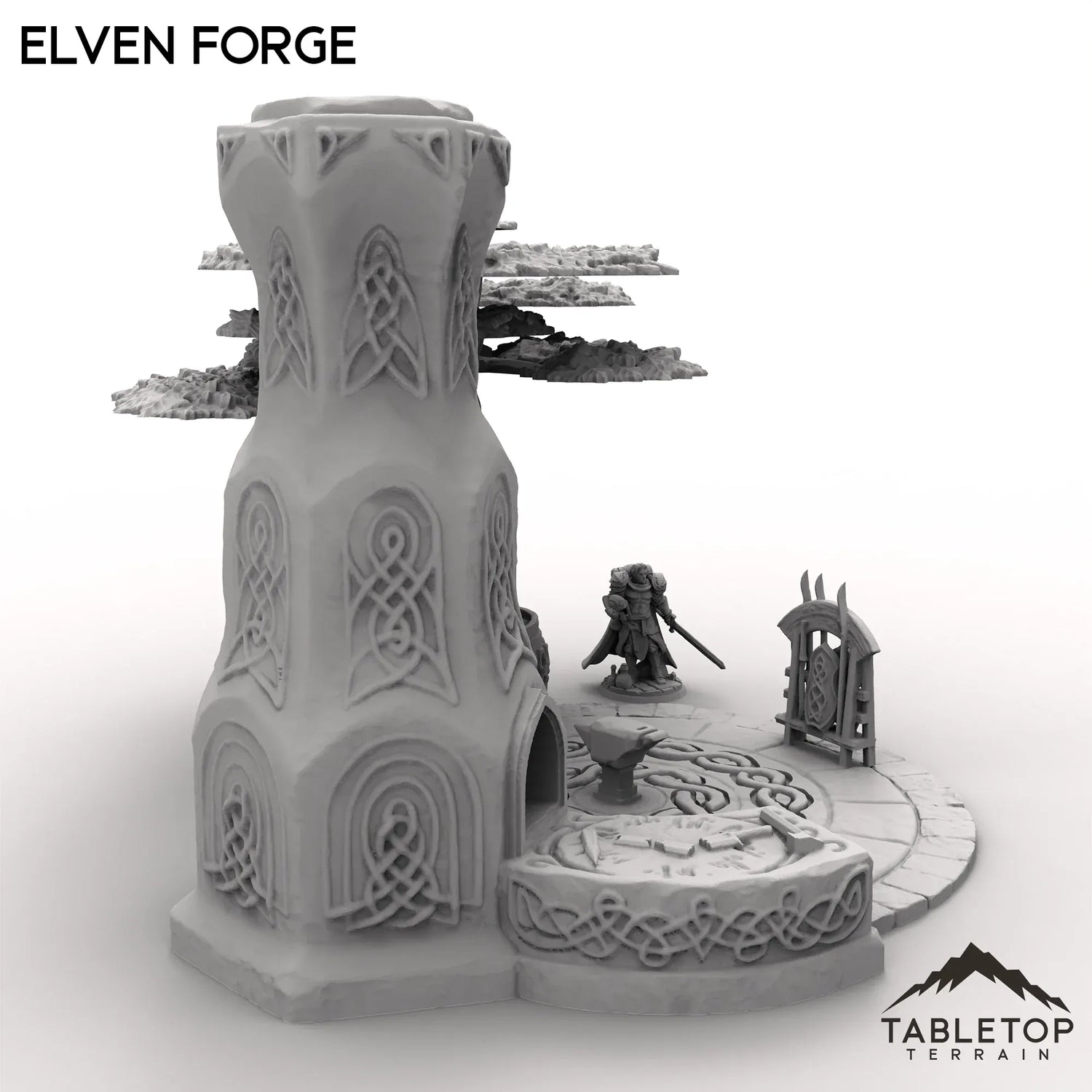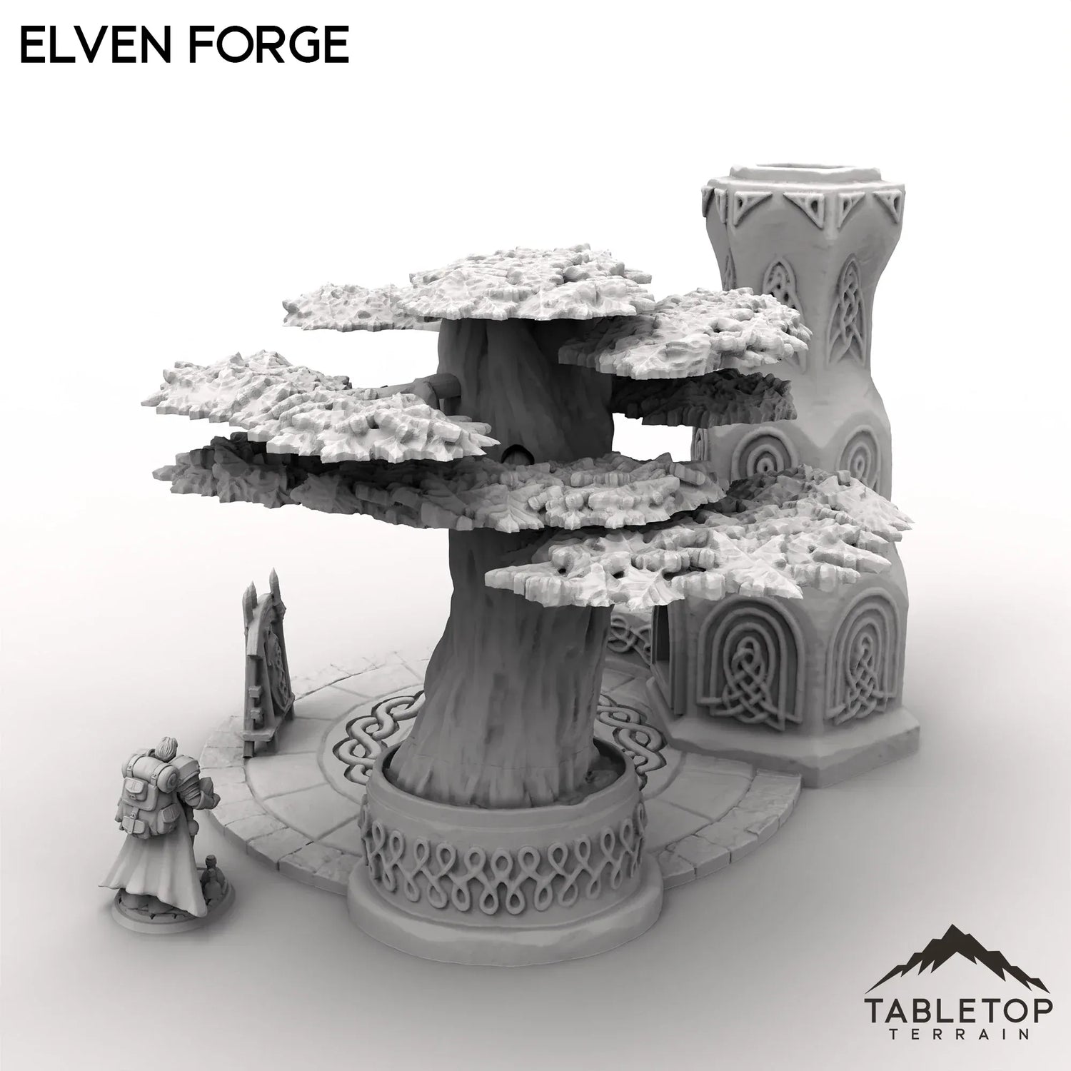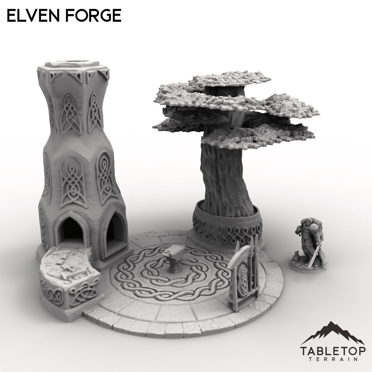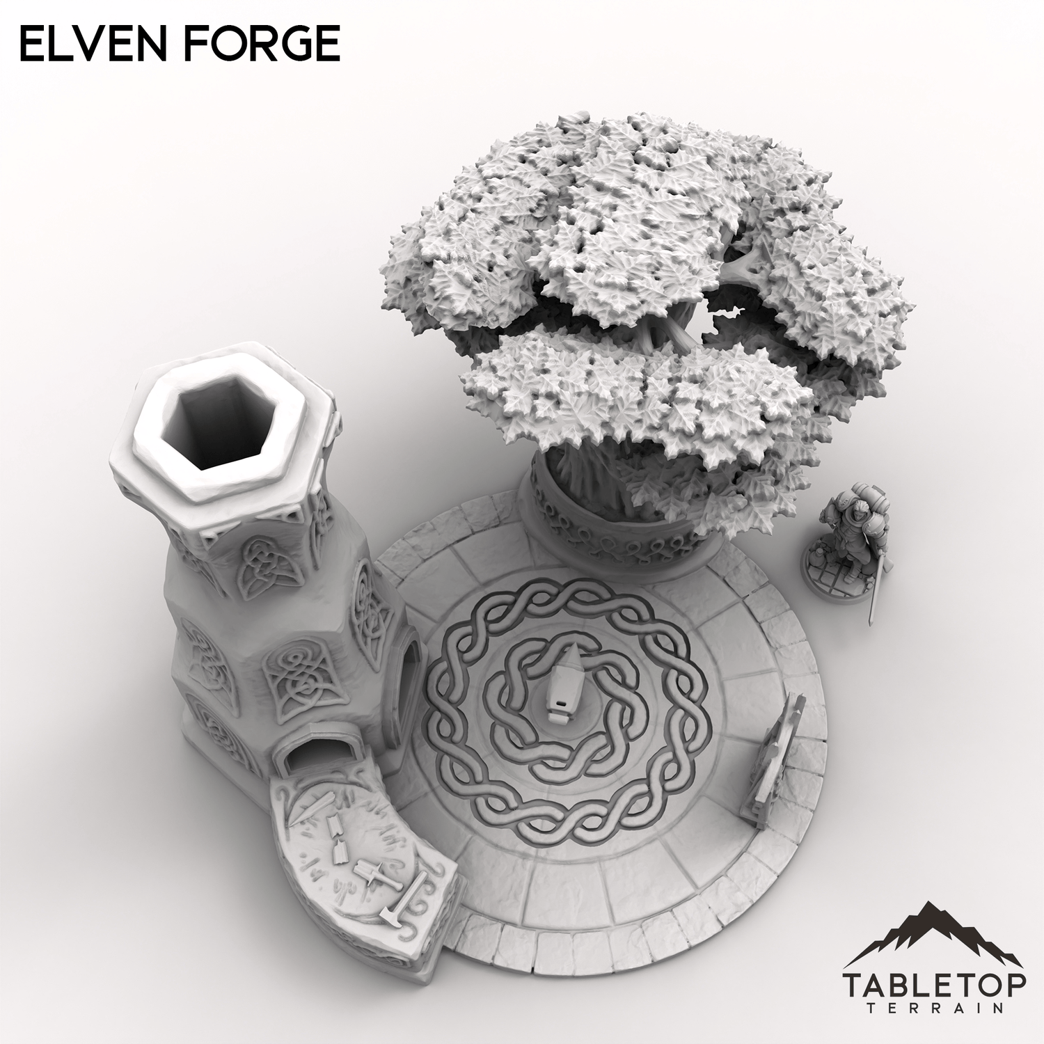 The Elven Forge is a part of the Kingdom of Noldareth collection. It features a towering stone furnace, an anvil and weapon rack, and a tree with removable branches. The branches slot into the tree itself in whatever order you want, with 8 different branches included for the full tree.