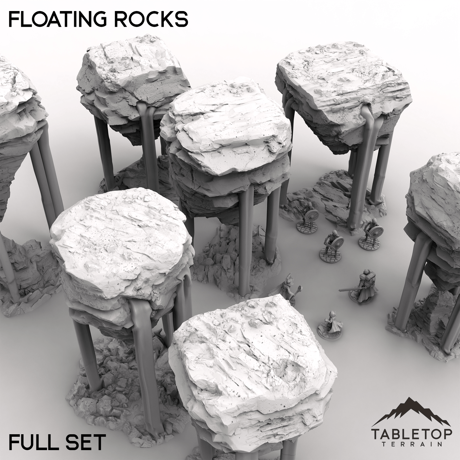 This set of Floating Rocks defies gravity, drifting in the air like remnants of a shattered world. Jagged edges and flowing waterfalls hint at powerful magic holding them aloft. Perfect for otherworldly battlefields, arcane realms, or shattered landscapes where the laws of nature no longer apply. Buy each piece individually or the whole set at a discount!