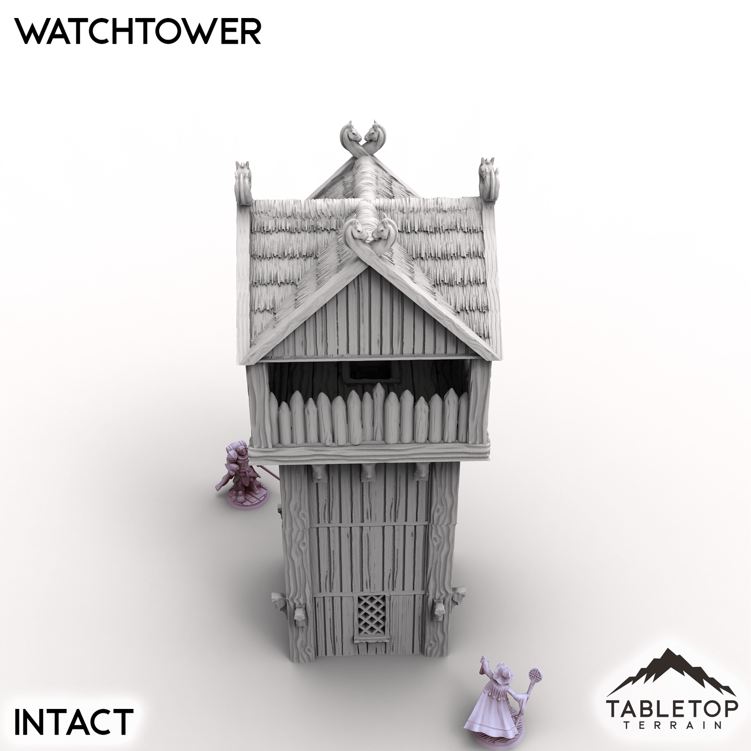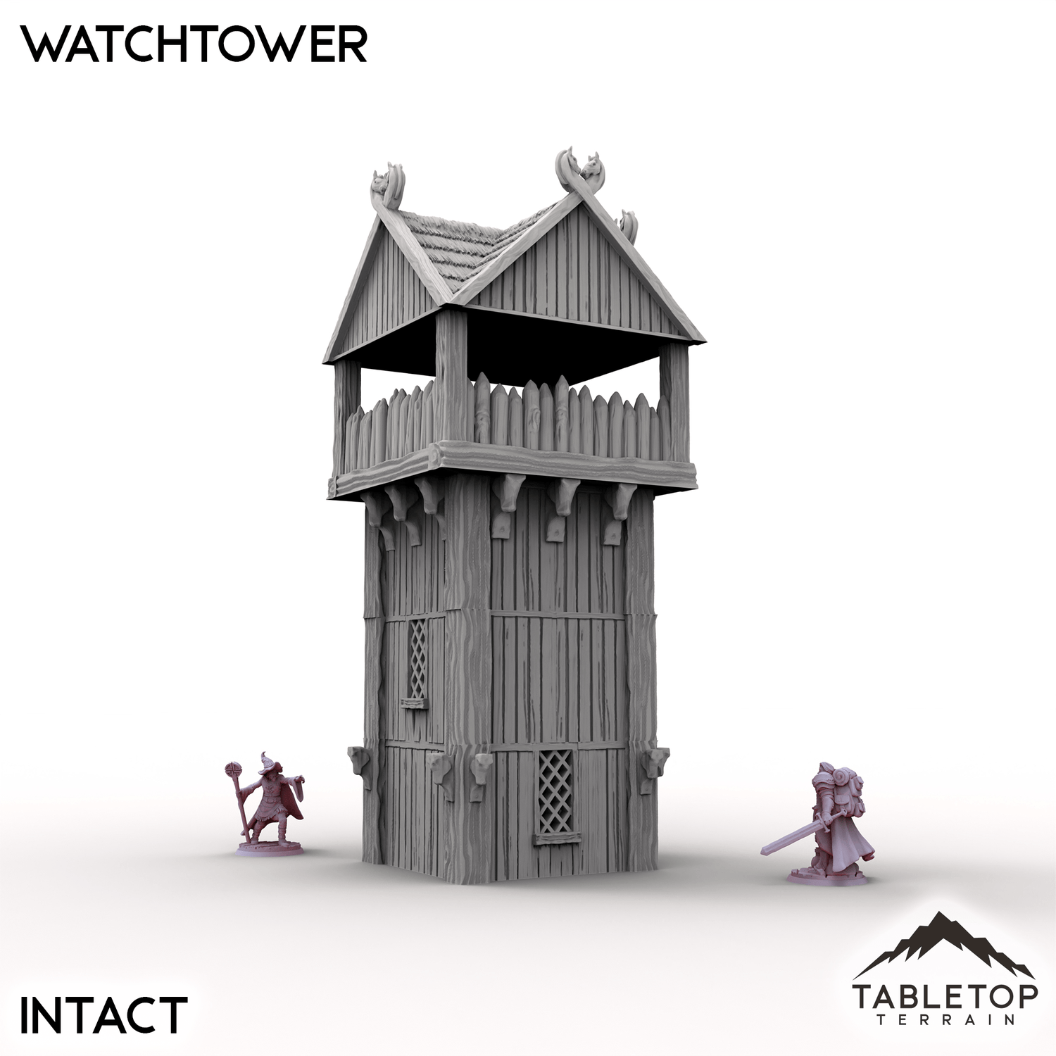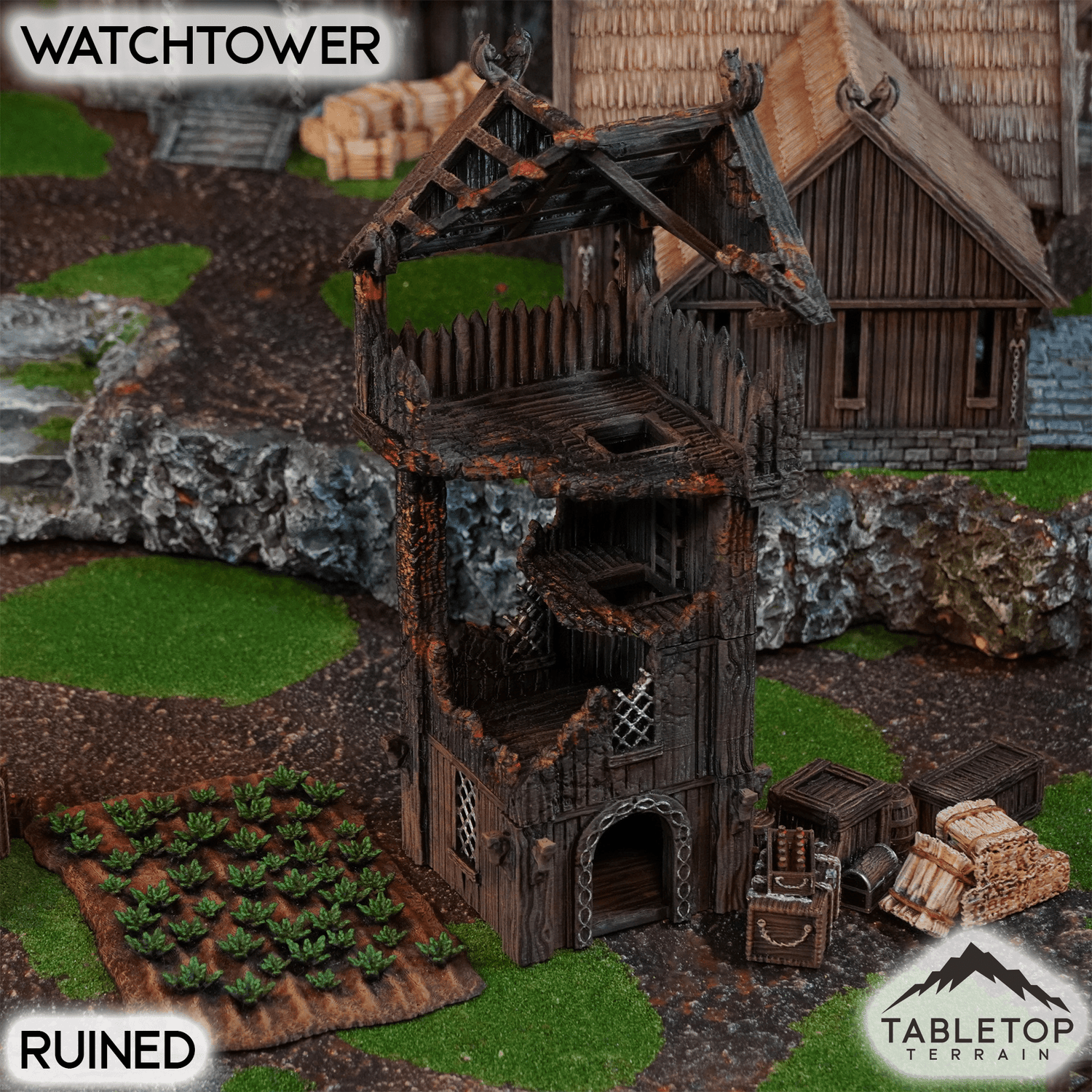 The Watchtower is a tall singular building with 5 floors for minis. The uppermost floor features a wooden fence to help defend and protect the guards inside. The tall tower provides and excellent view of the surrounding land, and can hold a number of minis in the different levels of the tower's walls.