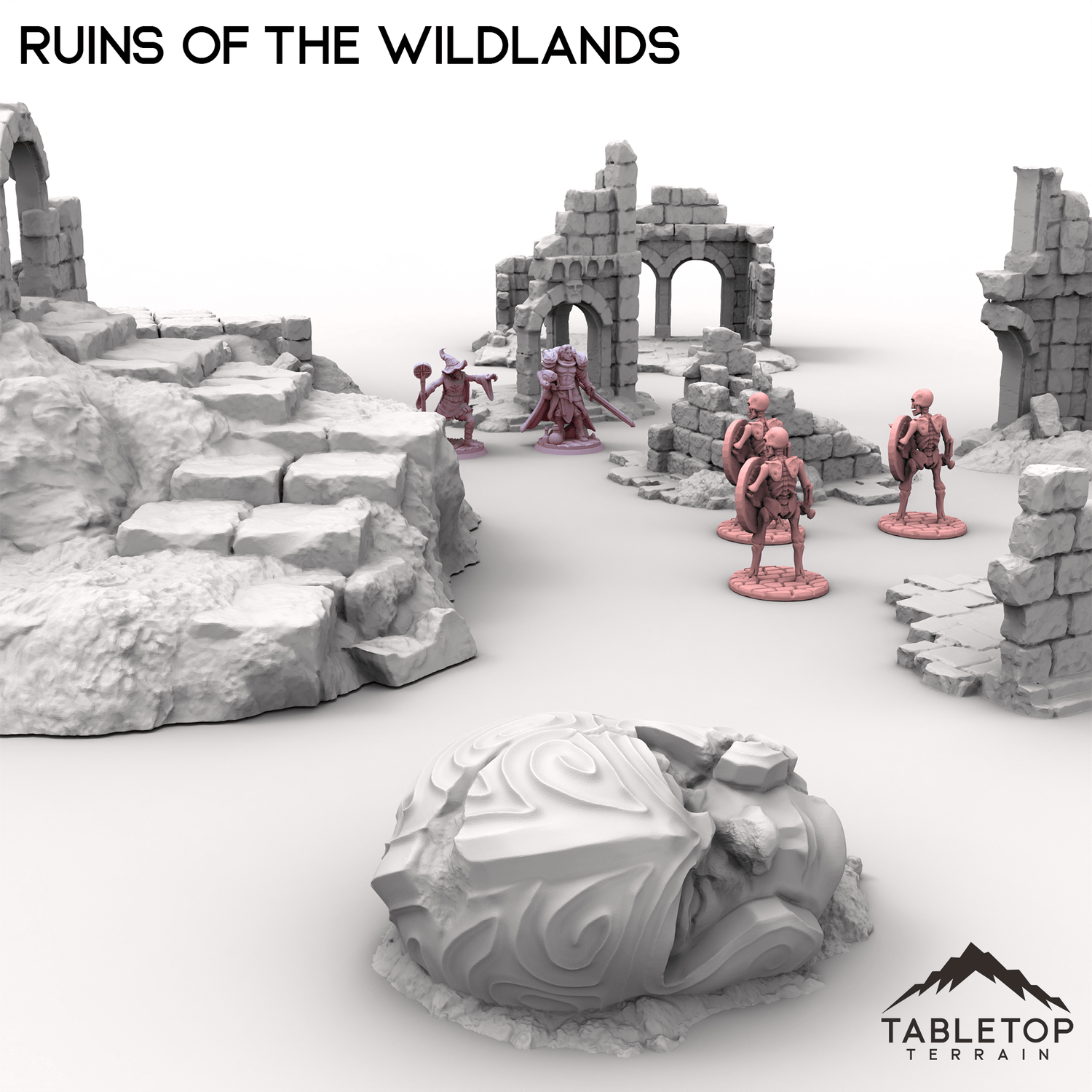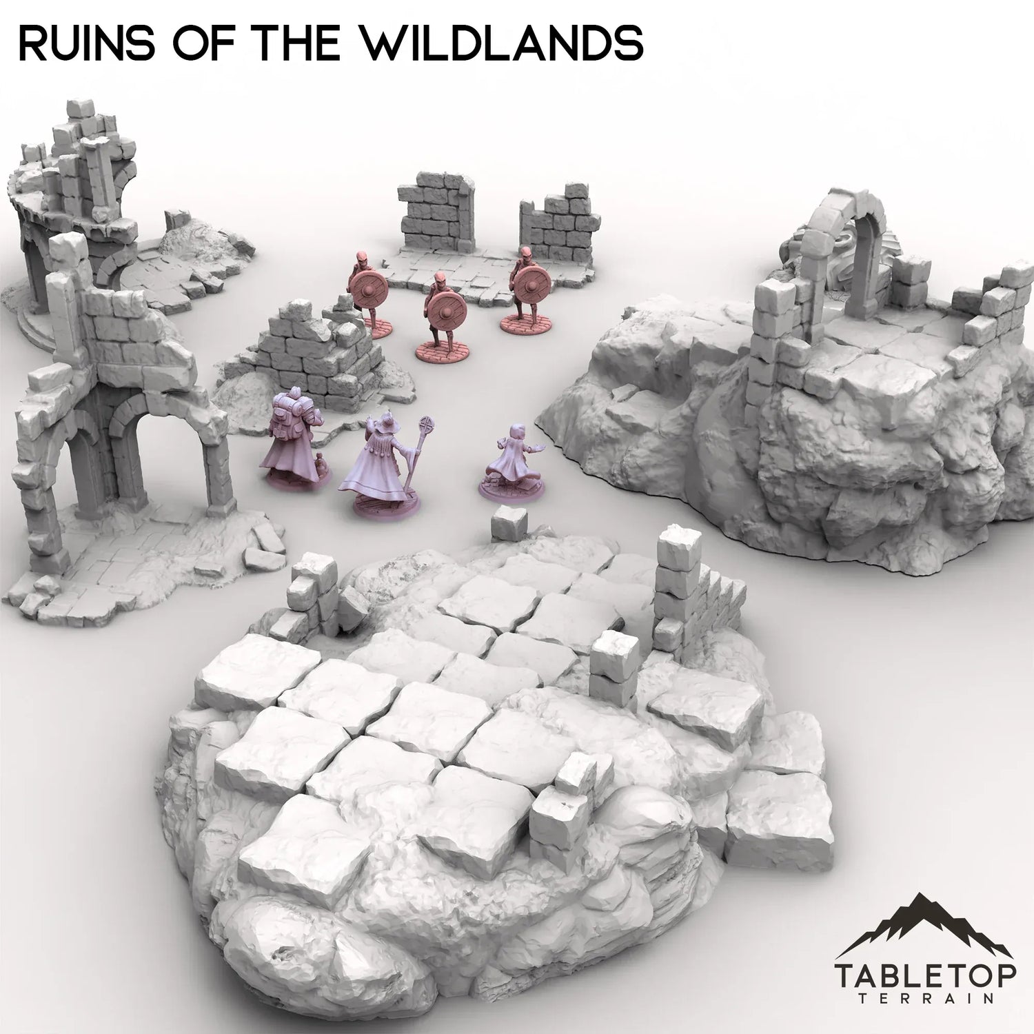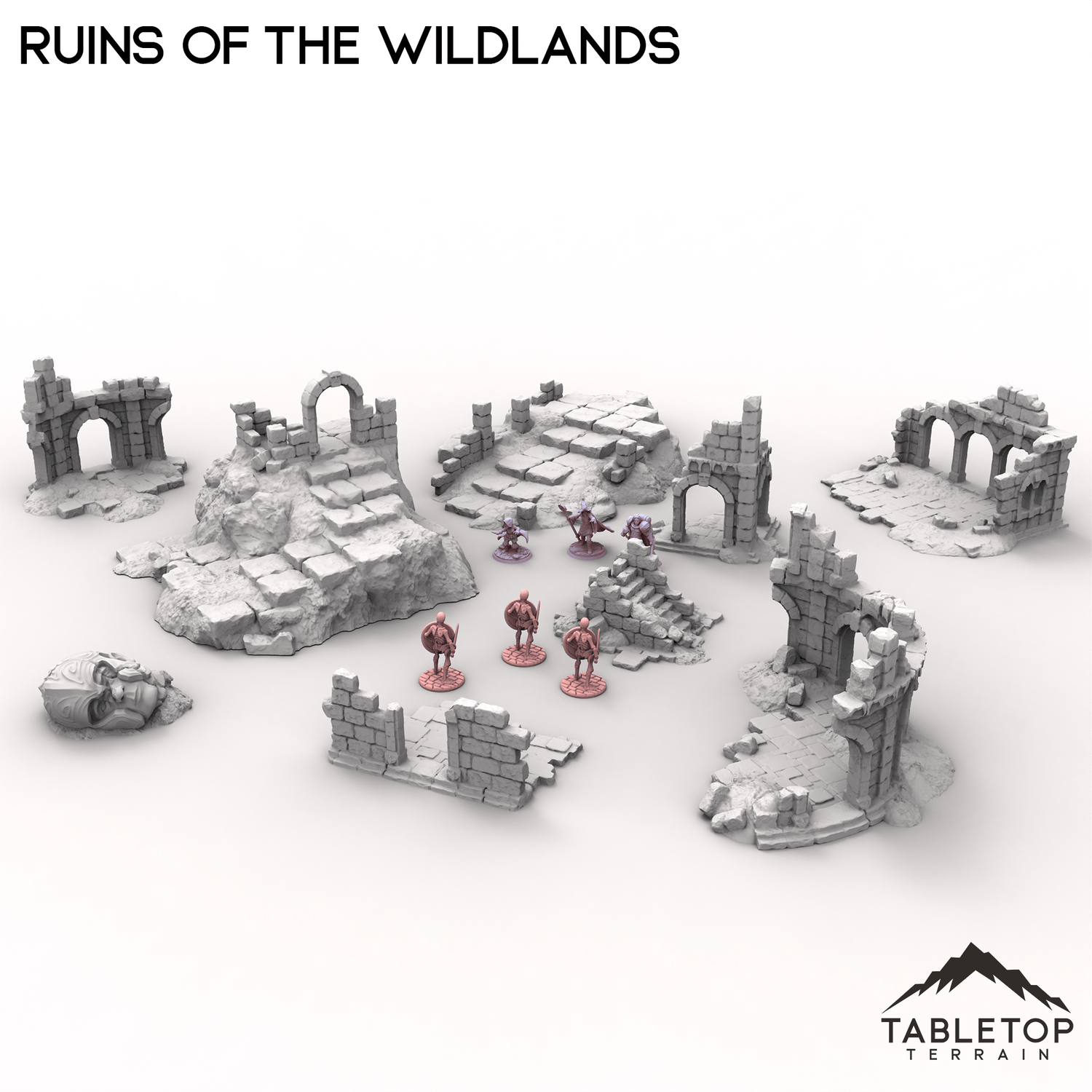 Ruins of the Wildlands is a collection of scatter, ruined buildings, and ancient statues turned to rubble. A marvel from an age gone by, but now left to nature's claim. The set features highly-detailed ruins with a variety of sizes, elevations, and textures. The Ruins of the Wildlands set is a great way to fill out your collection of terrain for almost any genre.