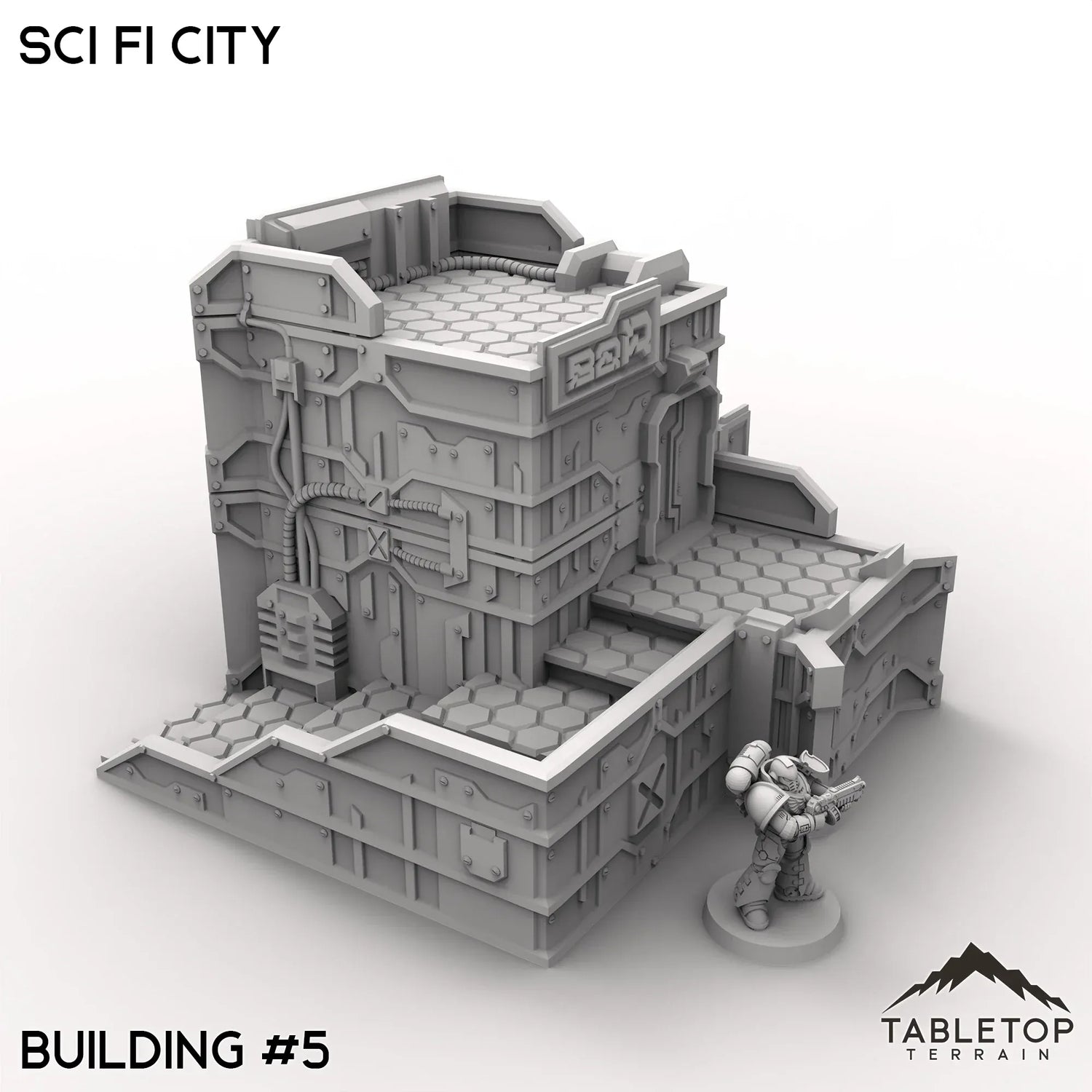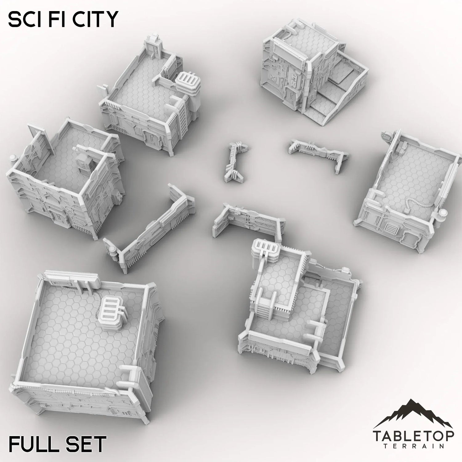 A sprawling sci-fi city filled with towering buildings and strategic barricades. Sleek architecture and reinforced defenses create an environment perfect for urban encounters, daring chases, or high-stakes missions. Buy each piece individually or the whole set at a discount