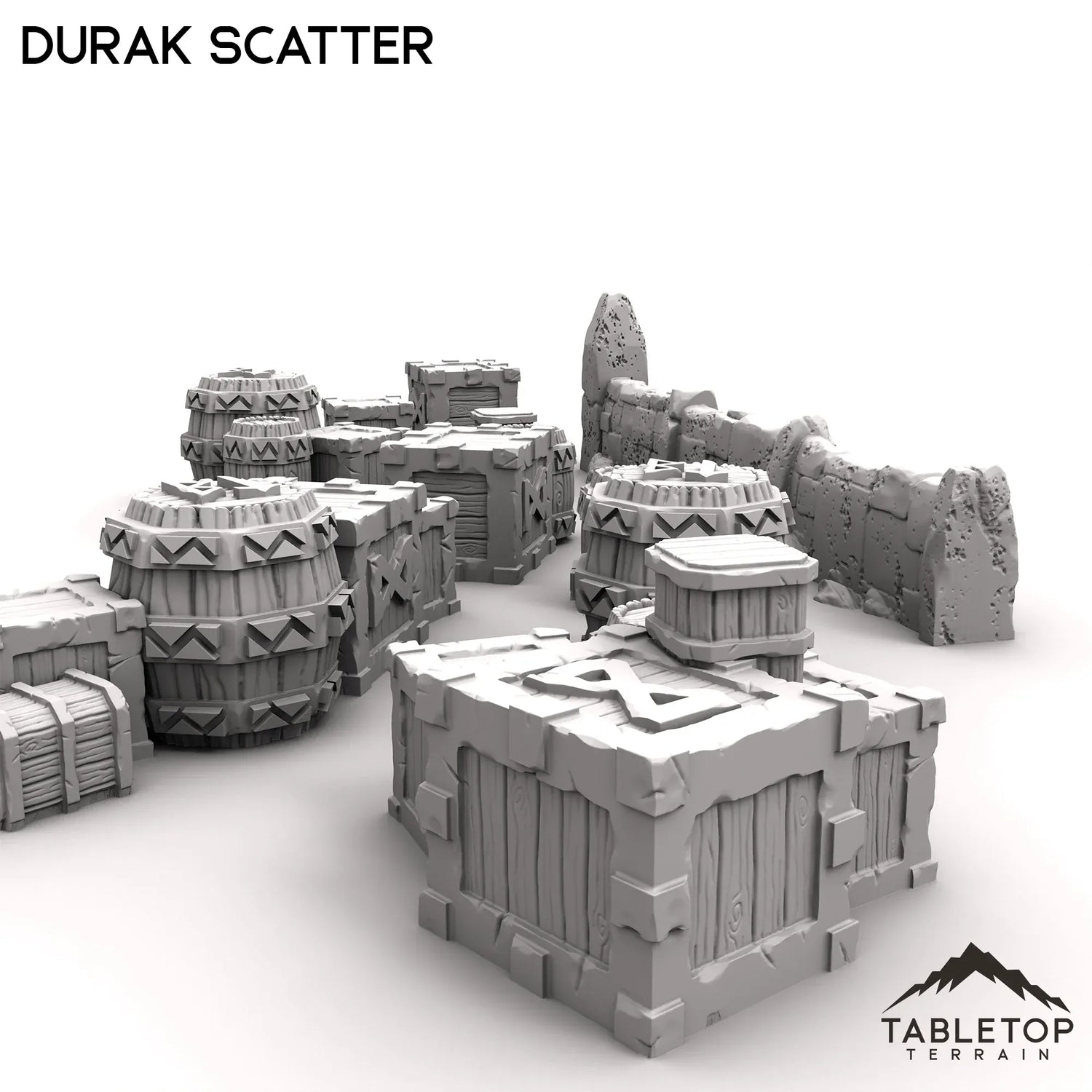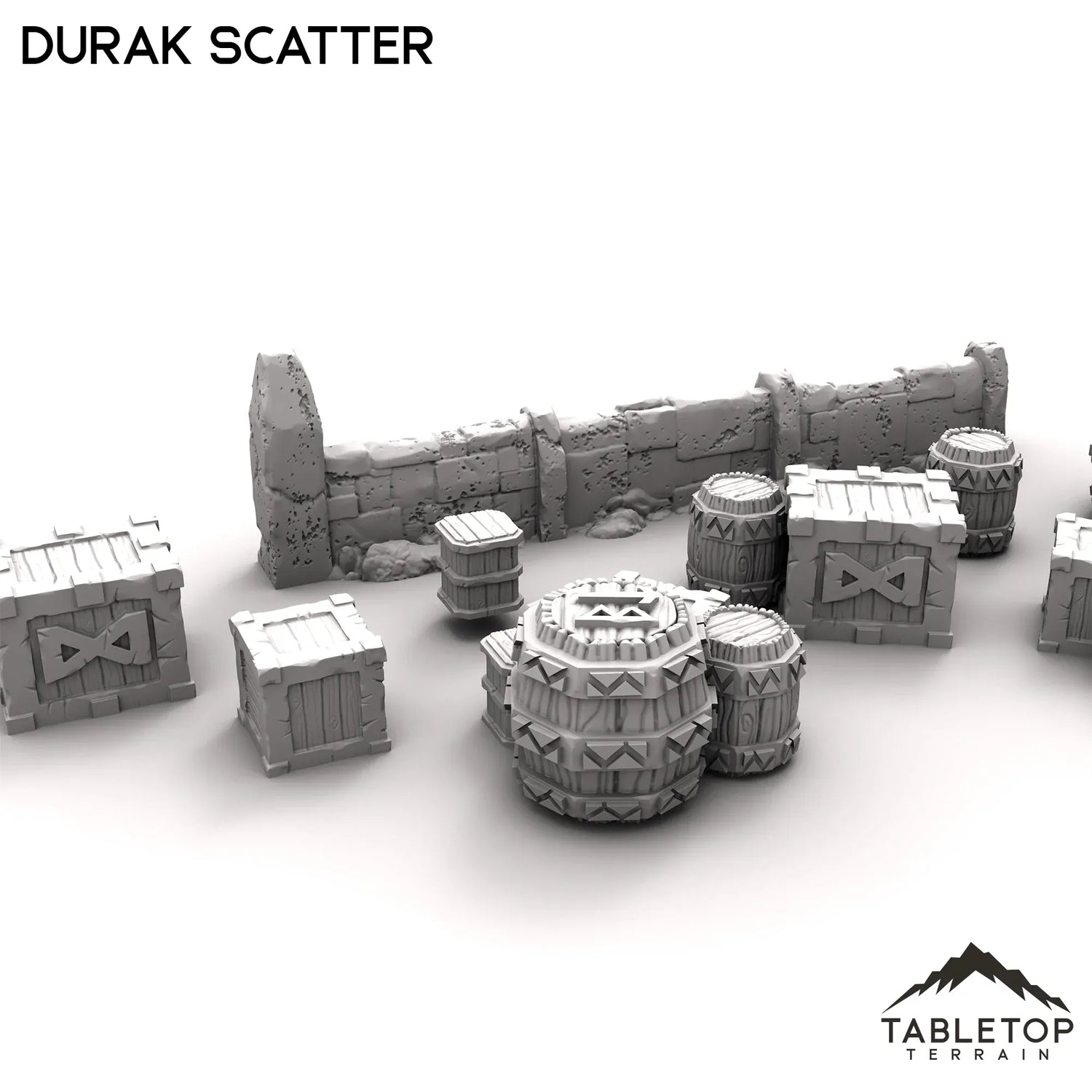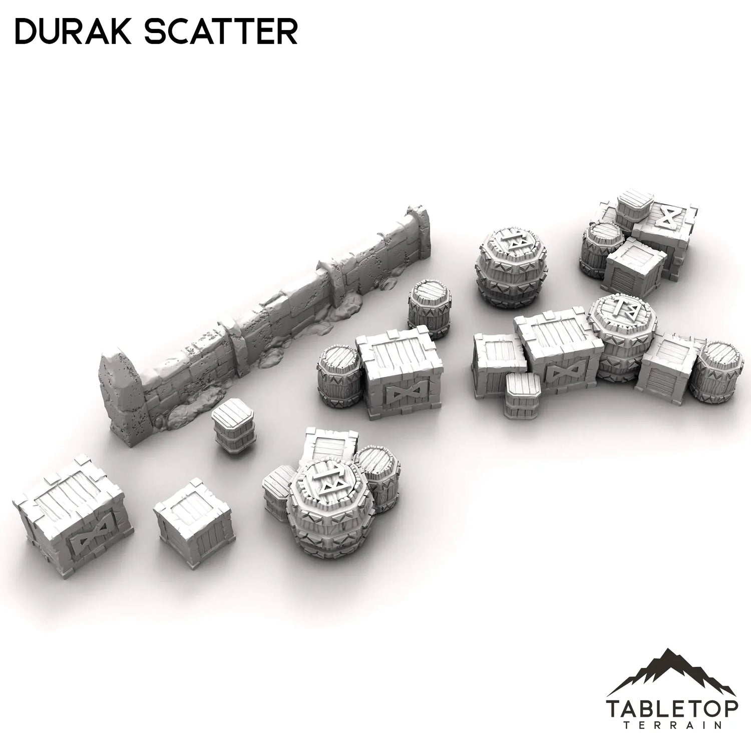 The Scatter set is a small collection of boxes and crates, dwarven barrels, and a short stand- alone wall matching the style of the buildings in the Durak Deep collection. This set is designed to fill out buildings and streets for a Durak Deep tabletop, but could function nicely with any tabletop setup.